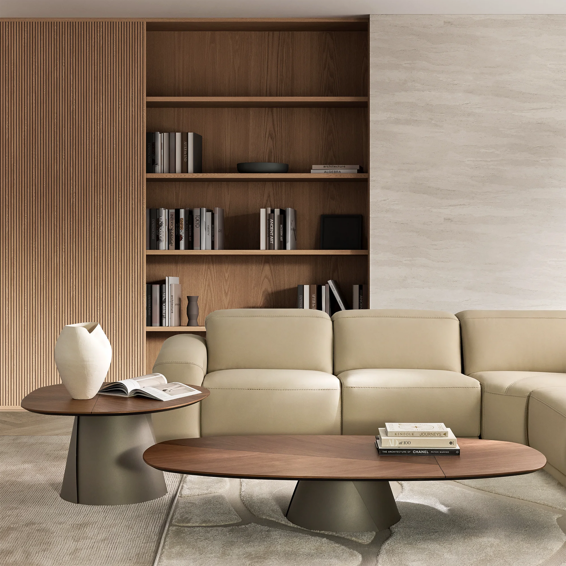 La table basse Adrian sculpte l'espace avec une allure architecturale audacieuse. Cattelan Italia magnifie le noyer par des lignes tendues et un profil aux bords biseautés, offrant une sérénité visuelle radicale. Son piétement sculptural, presque minéral, structure le volume et dialogue avec la richesse organique du bois.