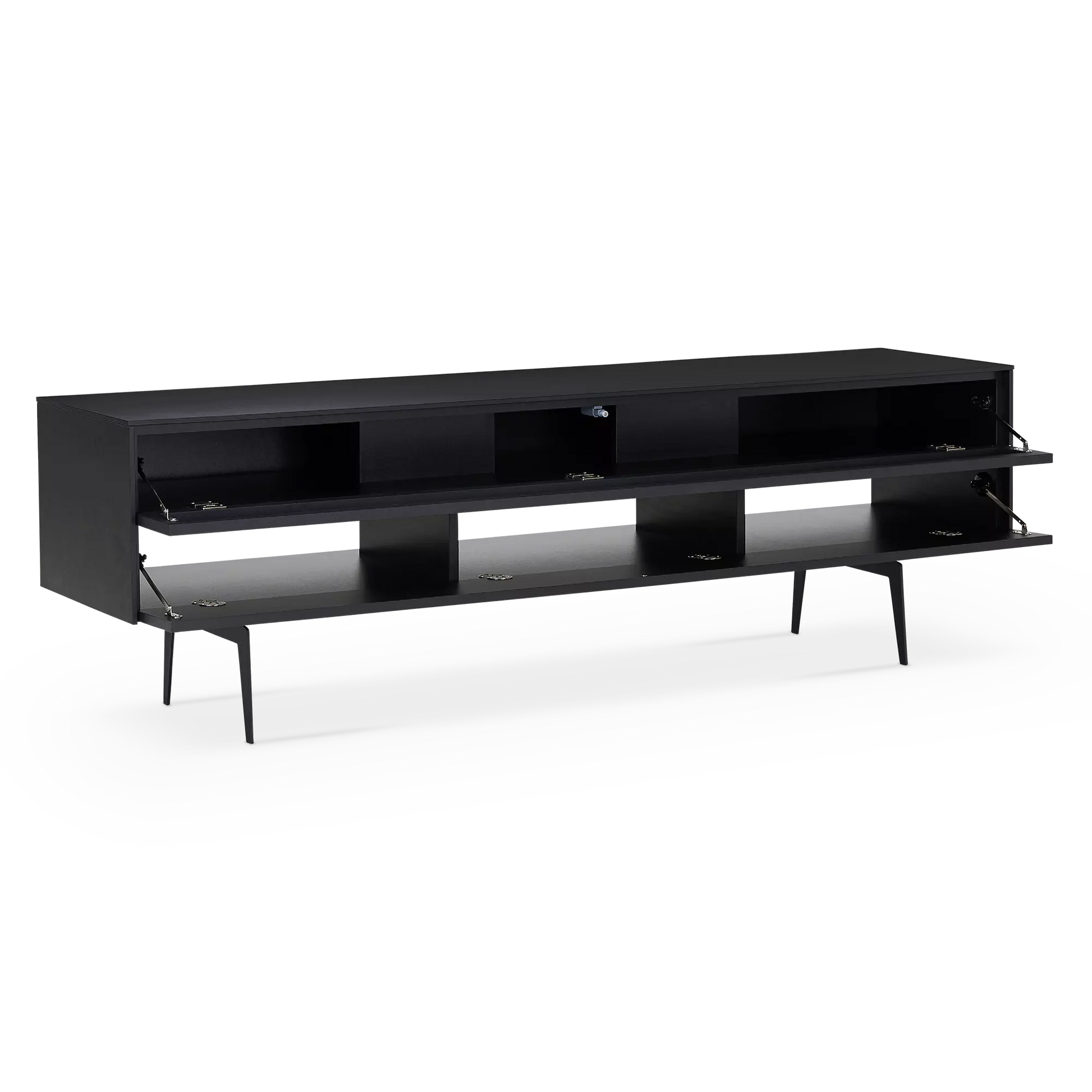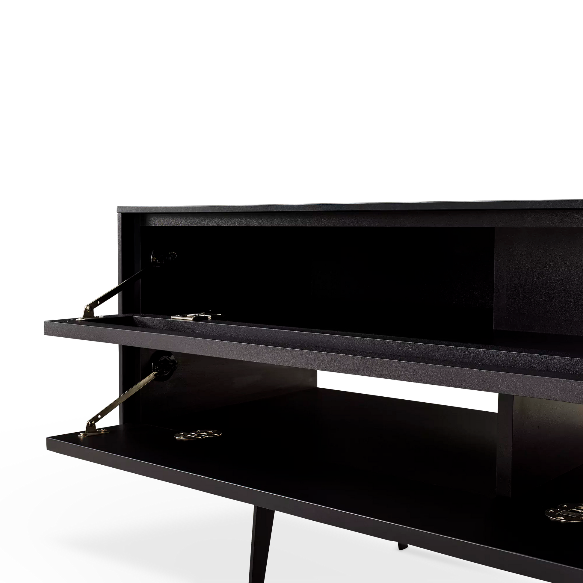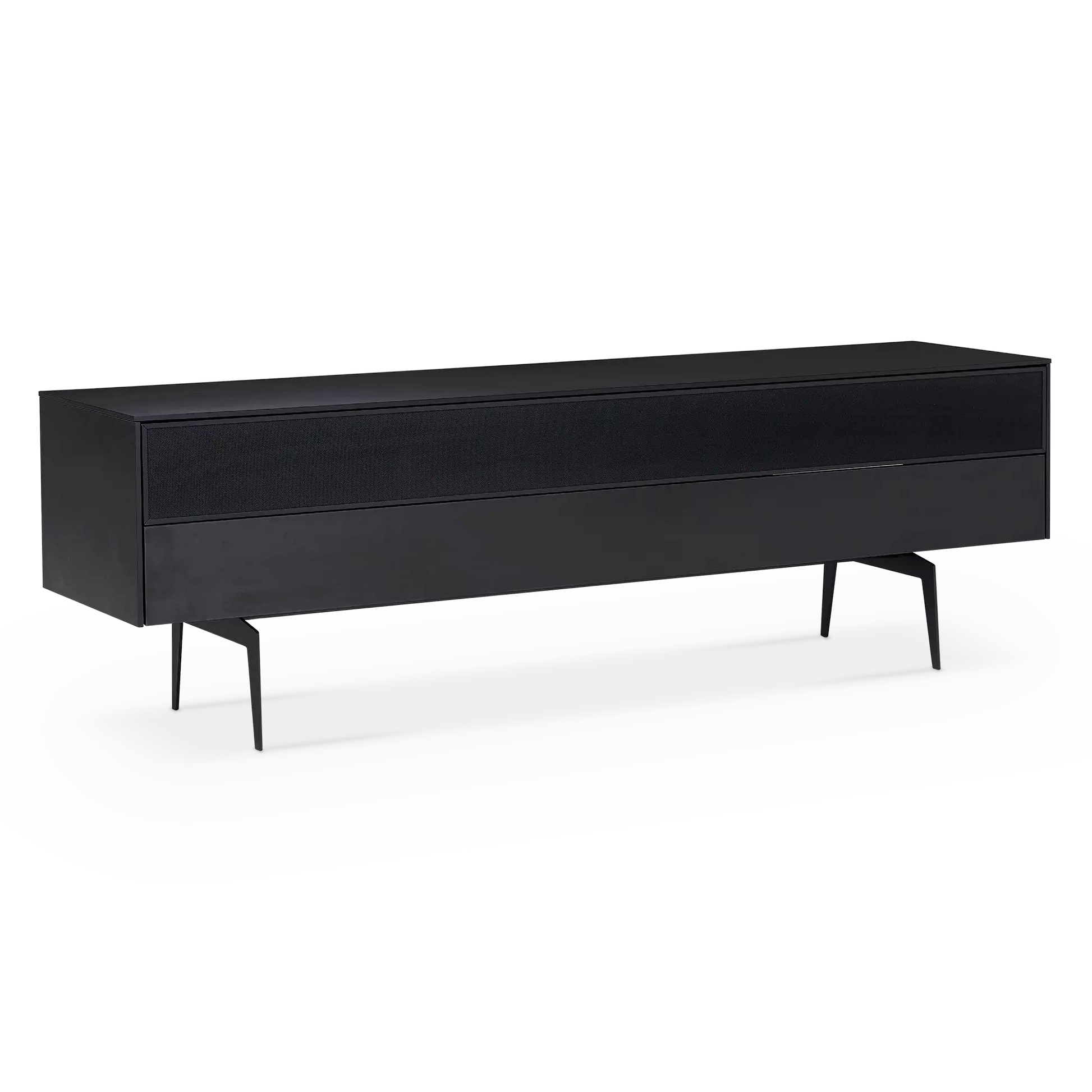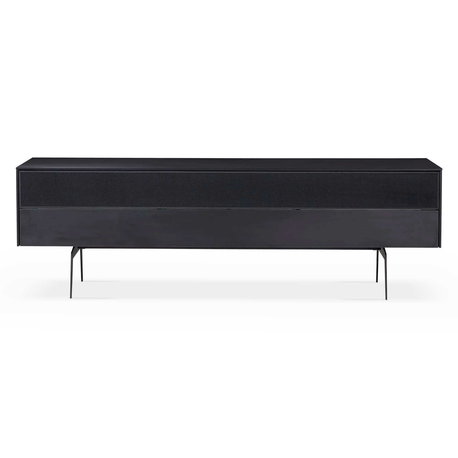Optez pour un look super moderne avec le meuble TV Alizée, au caisson linéaire perché sur un piètement incliné. Sa petite touche extravagante? Une façade qui combine bois laminé et grillage métallique.