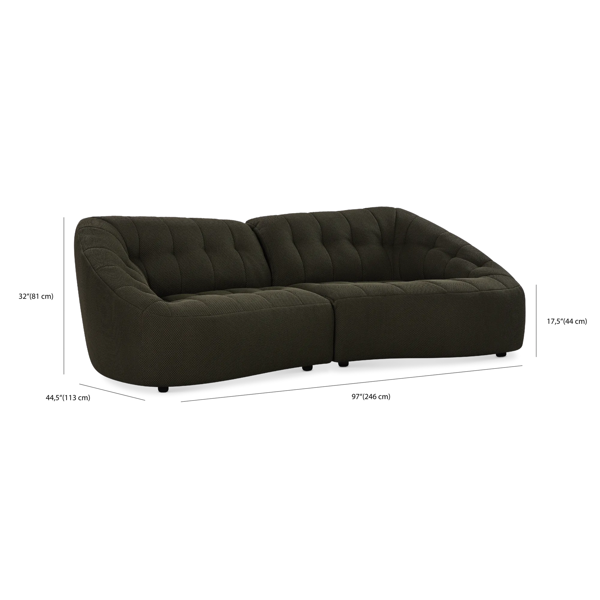 30'' (76 cm) H x 86,5'' (220 cm) L x 45'' (114 cm) P