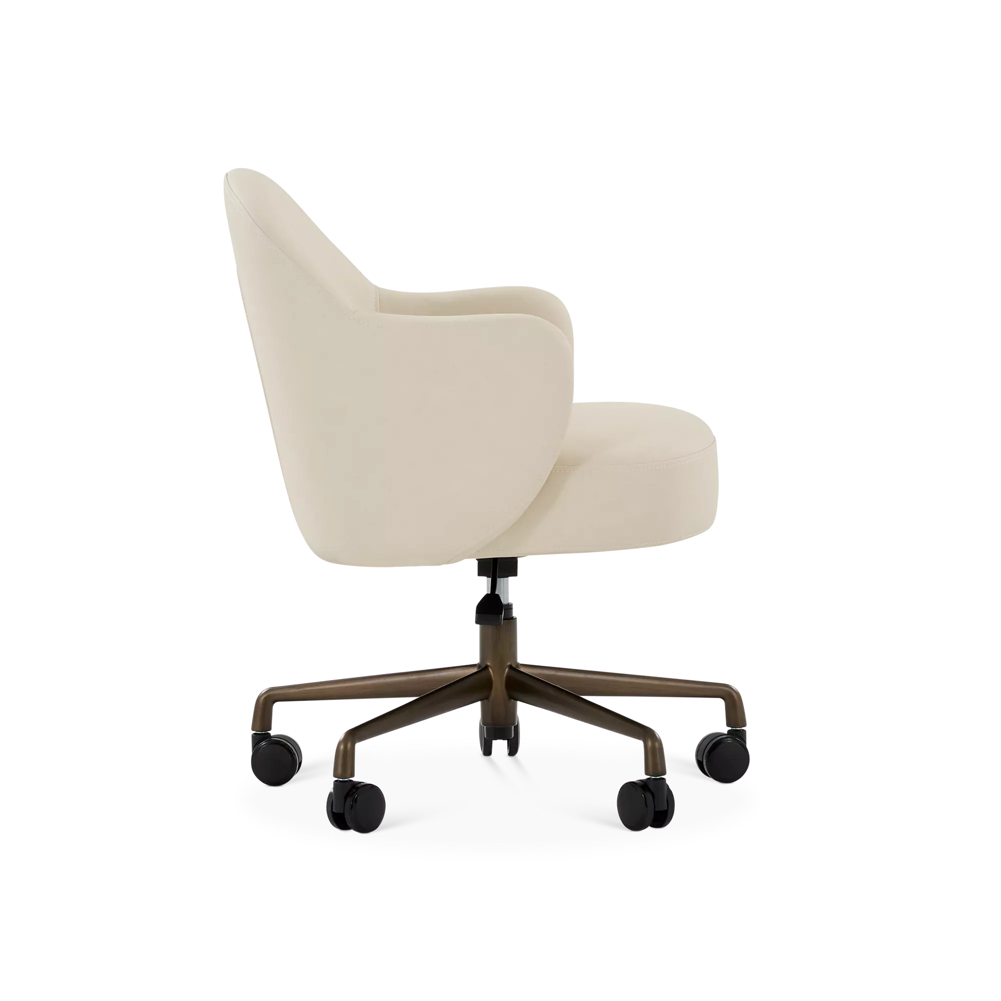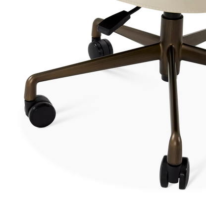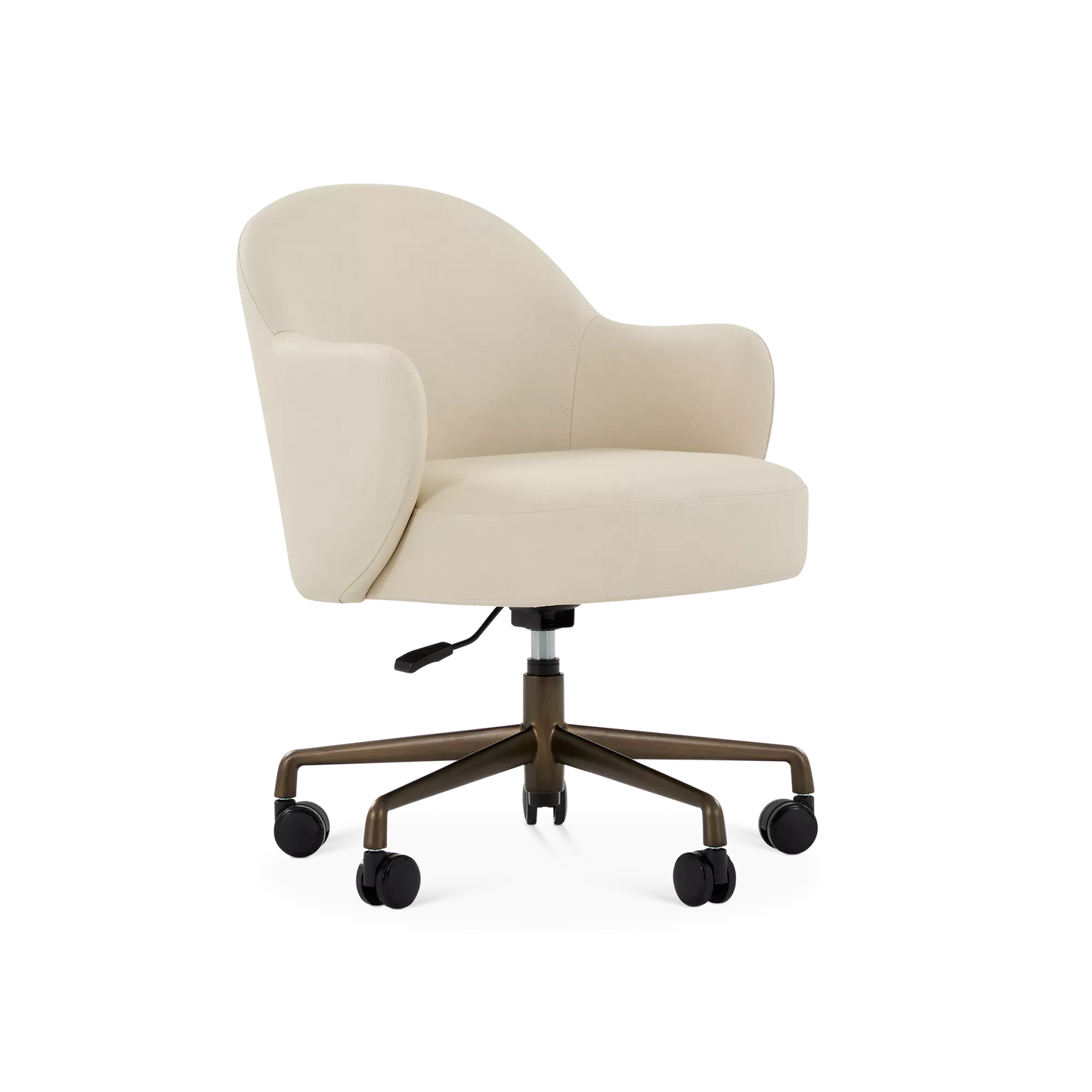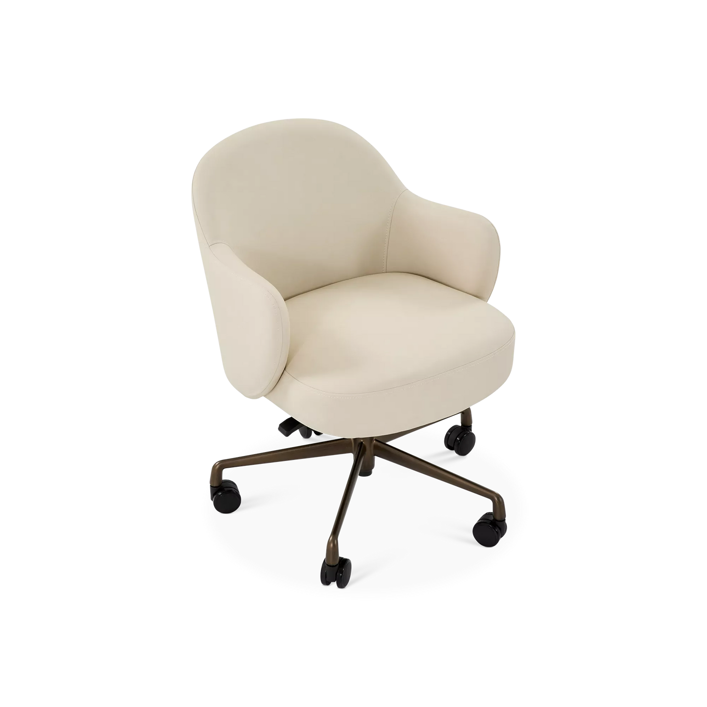 Dessinée par le designer danois Morten Georgsen, la chaise pivotante Bae allie douceur des formes et ergonomie bien pensée. Son assise généreuse avec ressorts intégrés, ses accoudoirs enveloppants et sa base à roulettes la rendent aussi confortable que raffinée, pensée pour s’intégrer dans les intérieurs contemporains.