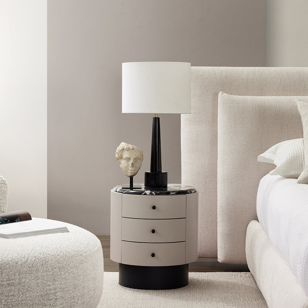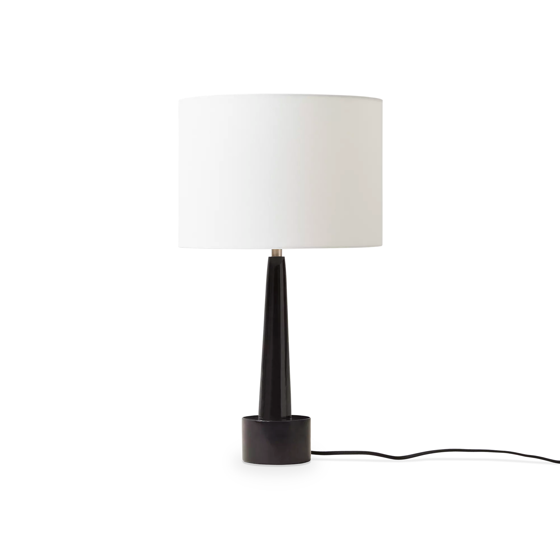 The Briggate table lamp has a sculptural base made of black marble with an antique brass veneer. Its notable presence makes it a choice pick for dressing up a console or buffet.