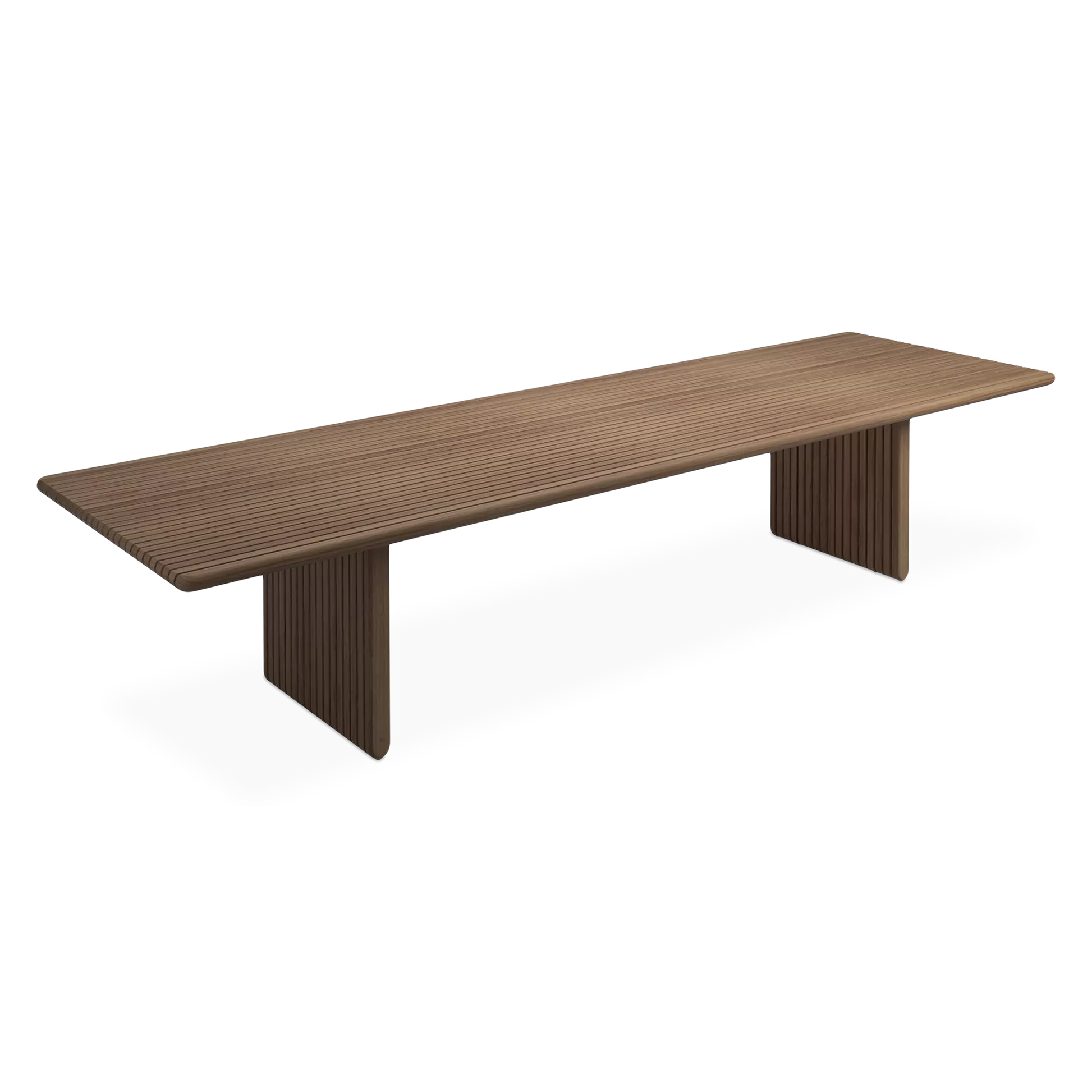 Clin d’œil aux ponts de bois des voiliers d’autrefois, cette table est uniquement fabriquée à partir de lattes de teck massif, du plateau à ses deux pieds. Sa longueur de 365 cm peut accueillir 12 personnes. Simple, élégante, harmonieuse, elle saura prendre sa place sur votre terrasse en toute discrétion. Habillez-la de chaises en corde pour accentuer son inspiration nautique ou de modèles minimalistes en aluminium pour un look urbain.