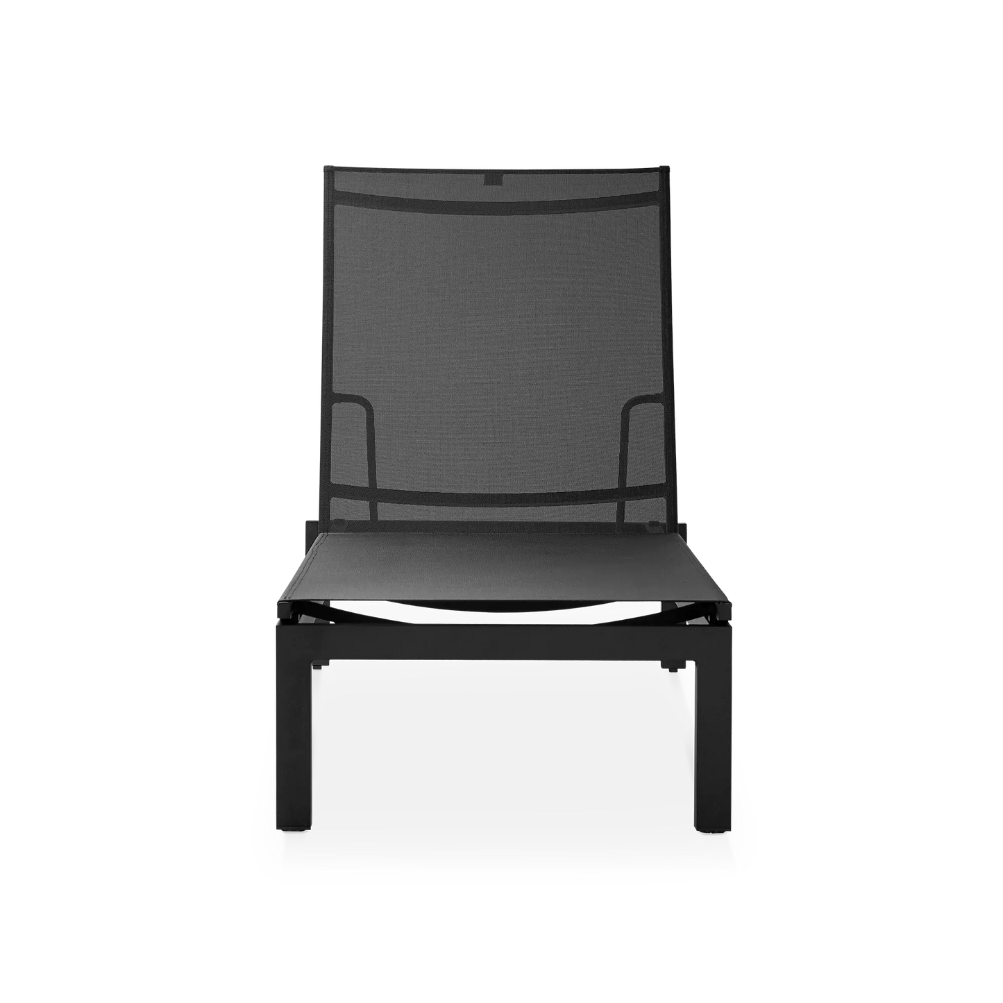 On oublie le coussin! Le textilène, un tissu souple et sèche-vite, suffit au confort de cette chaise longue. Surtout si on lui ajoute un dossier inclinable à cinq positions et deux roulettes, qui se font discrètes à l’arrière, pour faciliter son déplacement. Chic, pratique et empilable.