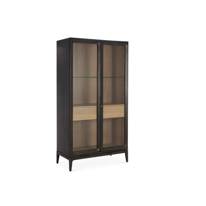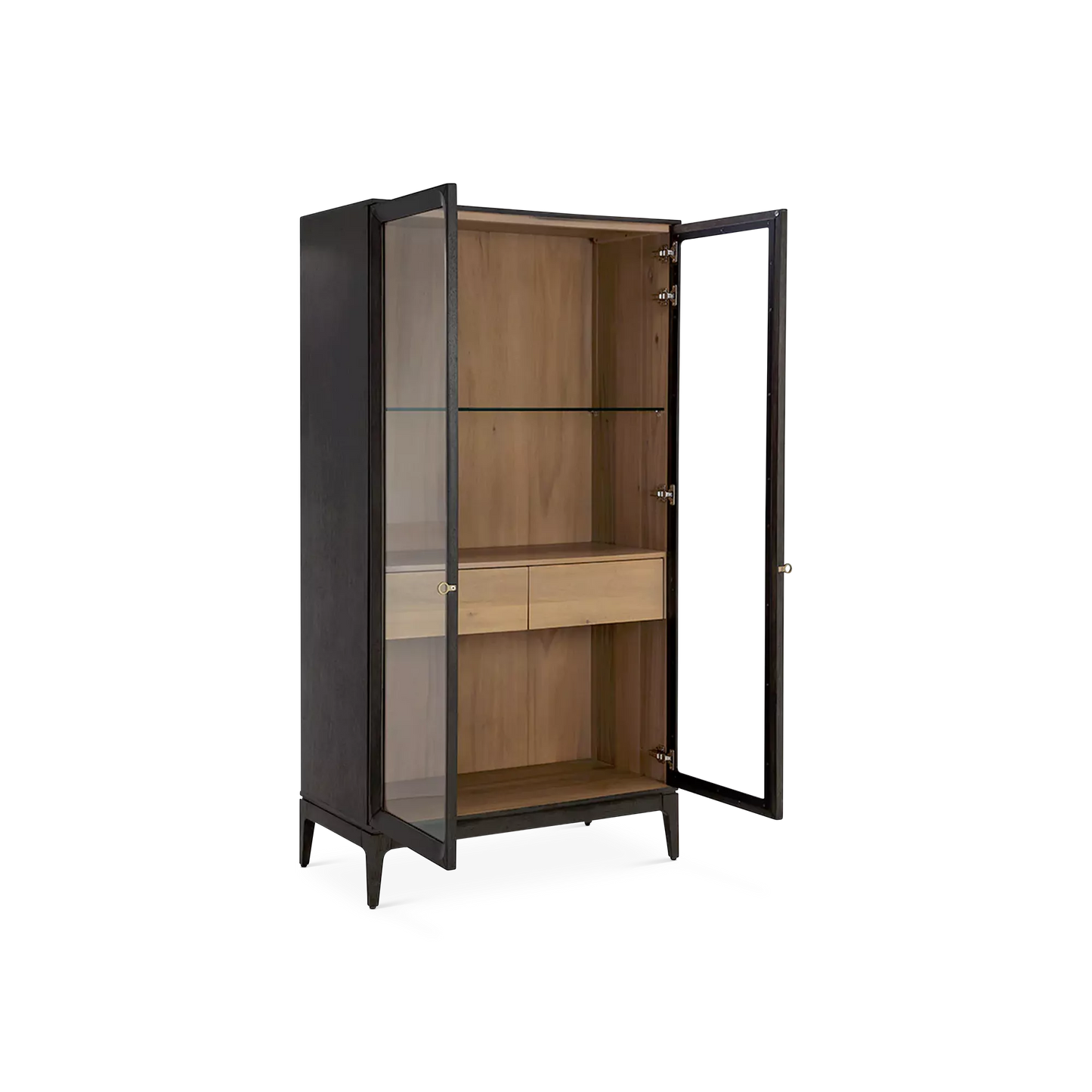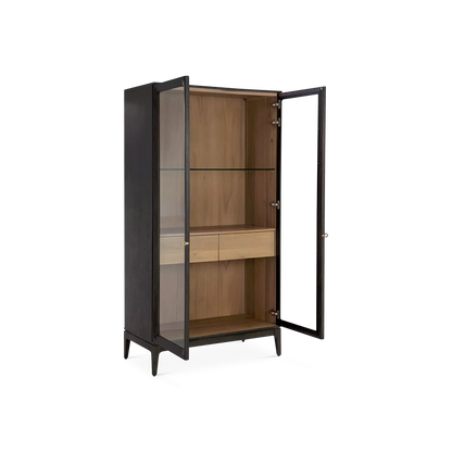 Élancée et raffinée, la vitrine Cecilia combine verre trempé et placage d’acacia pour un rendu texturé tout en contraste. Les pieds fuselés en bois massif et les détails en laiton évoquent les lignes du design milieu de siècle dernier, tandis que les tiroirs intégrés permettent de sublimer vos objets sans rien dévoiler.