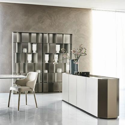 Sculptural et géométrique, le buffet Chelsea de Cattelan Italia est composé de surfaces en bois laqué mat qui dissimulent, en leur centre, des tablettes en verre. La structure est couronnée d’un plateau en verre clair ou miroir, au choix.
