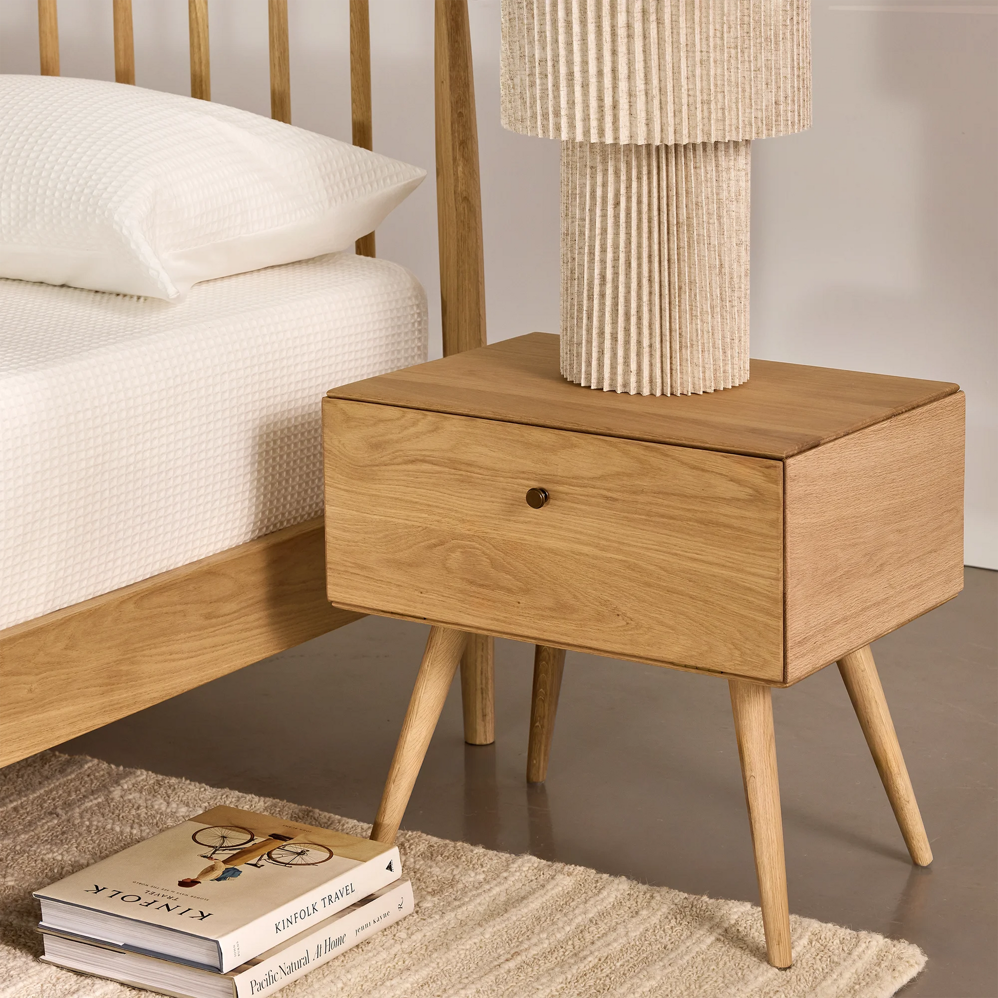 La table de chevet Cormier séduit par son piètement incliné et sa silhouette rétro-scandinave qui donnent du caractère à la pièce. Réalisée en chêne, elle met en valeur la beauté naturelle du bois et diffuse une chaleur douce, idéale pour créer une ambiance apaisante. Son caisson lisse et épuré accueille un tiroir pratique, en faisant ainsi une table aussi stylée que fonctionnelle.