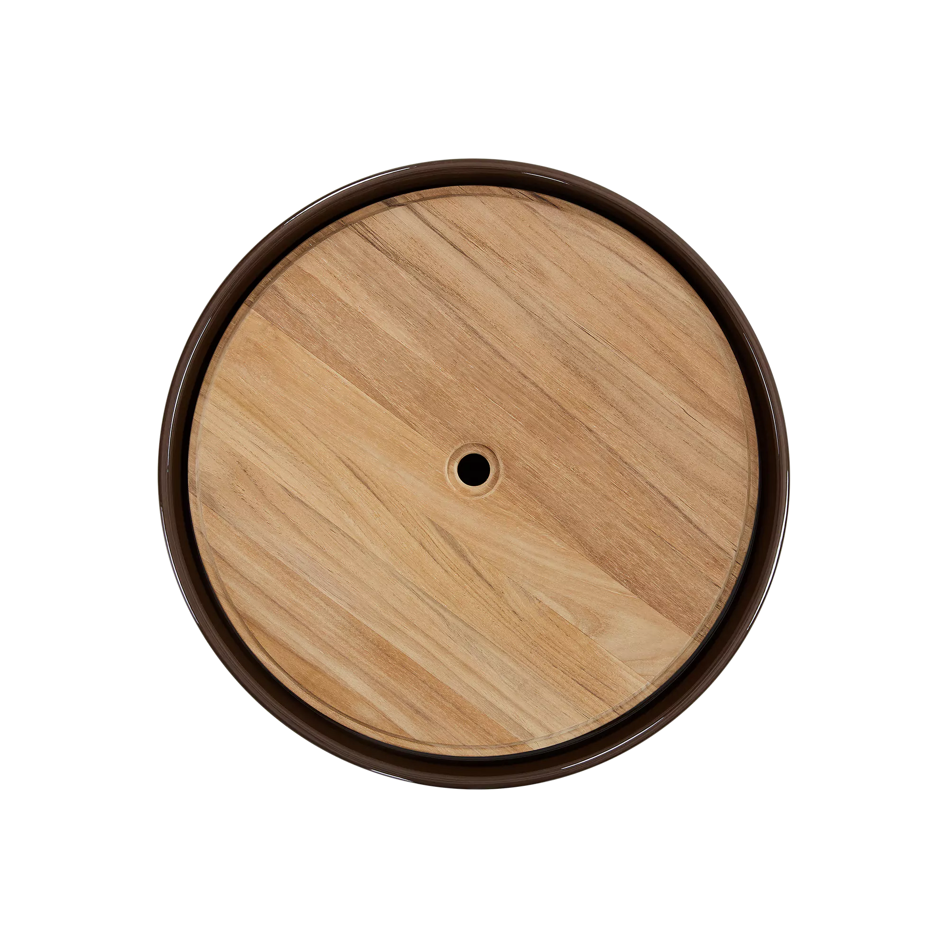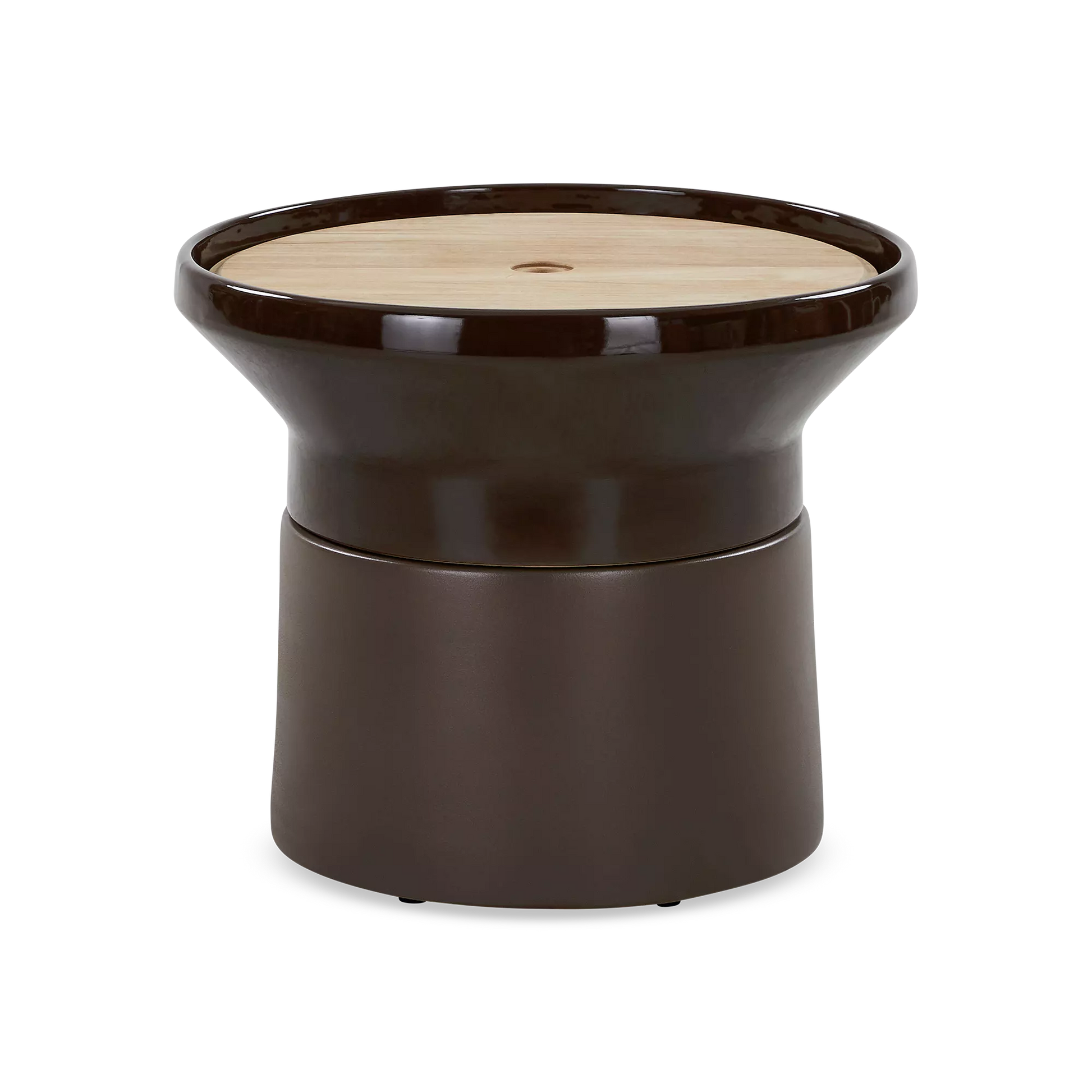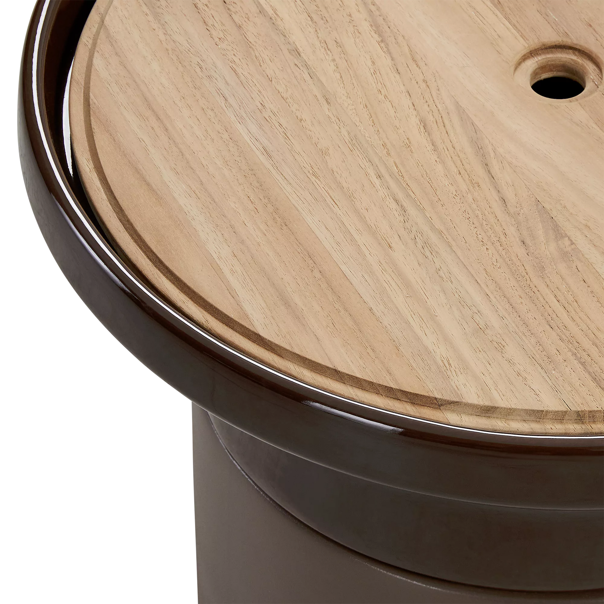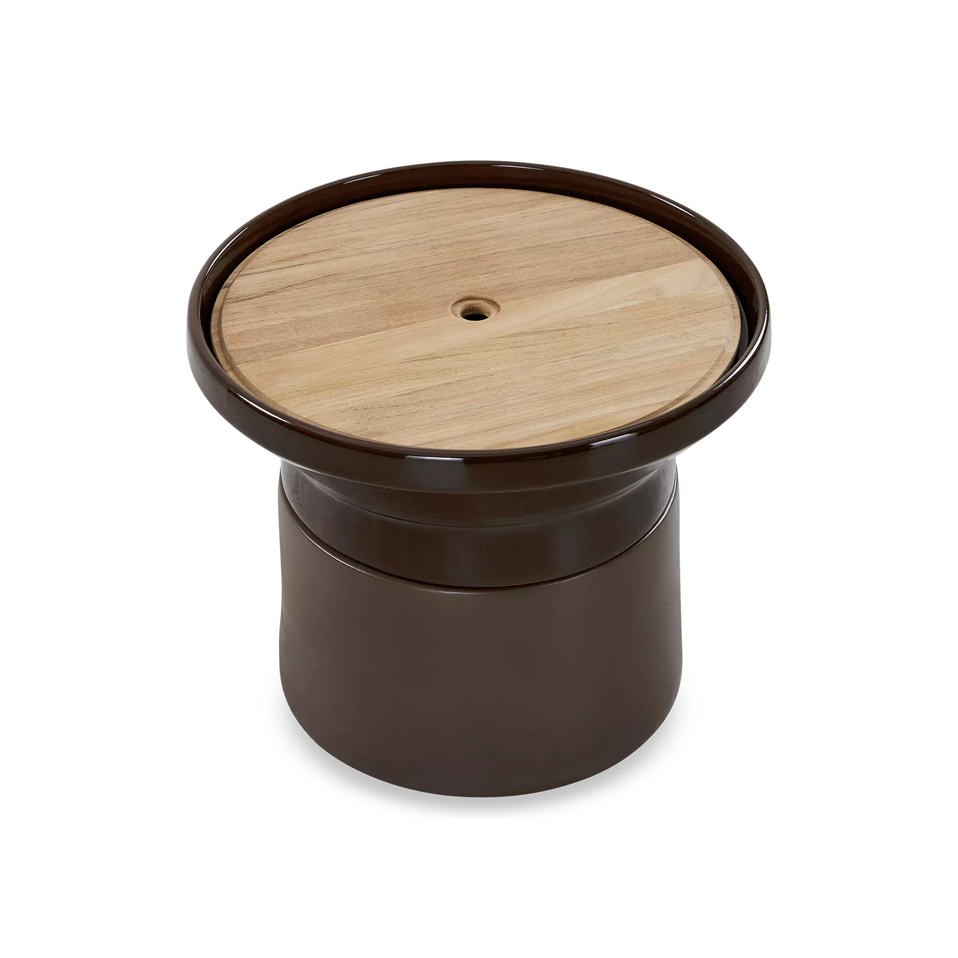 Coso met la céramique à l’honneur en mariant deux finis bien distincts : l’un mat et texturé, l’autre lisse et émaillé, qui réfléchit la lumière. Surmontée d’un plateau en teck, cette table basse est à combiner avec sa version table d’appoint, plus haute et étroite, pour créer un bel effet graphique.