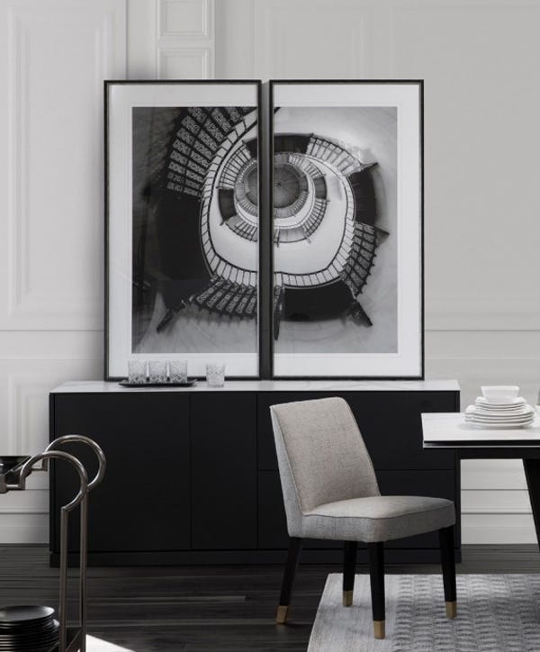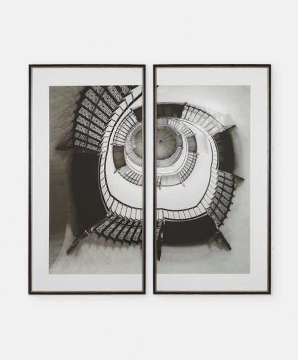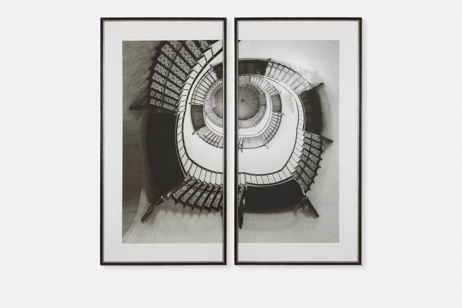 Cet ensemble de deux cadres imprimés propose une photographie illusoire où un escalier en colimaçon est présenté en contre-plongée. S'apparentant à un tourbillon infini, ces cadres rehausseront la dynamique d'un mur.