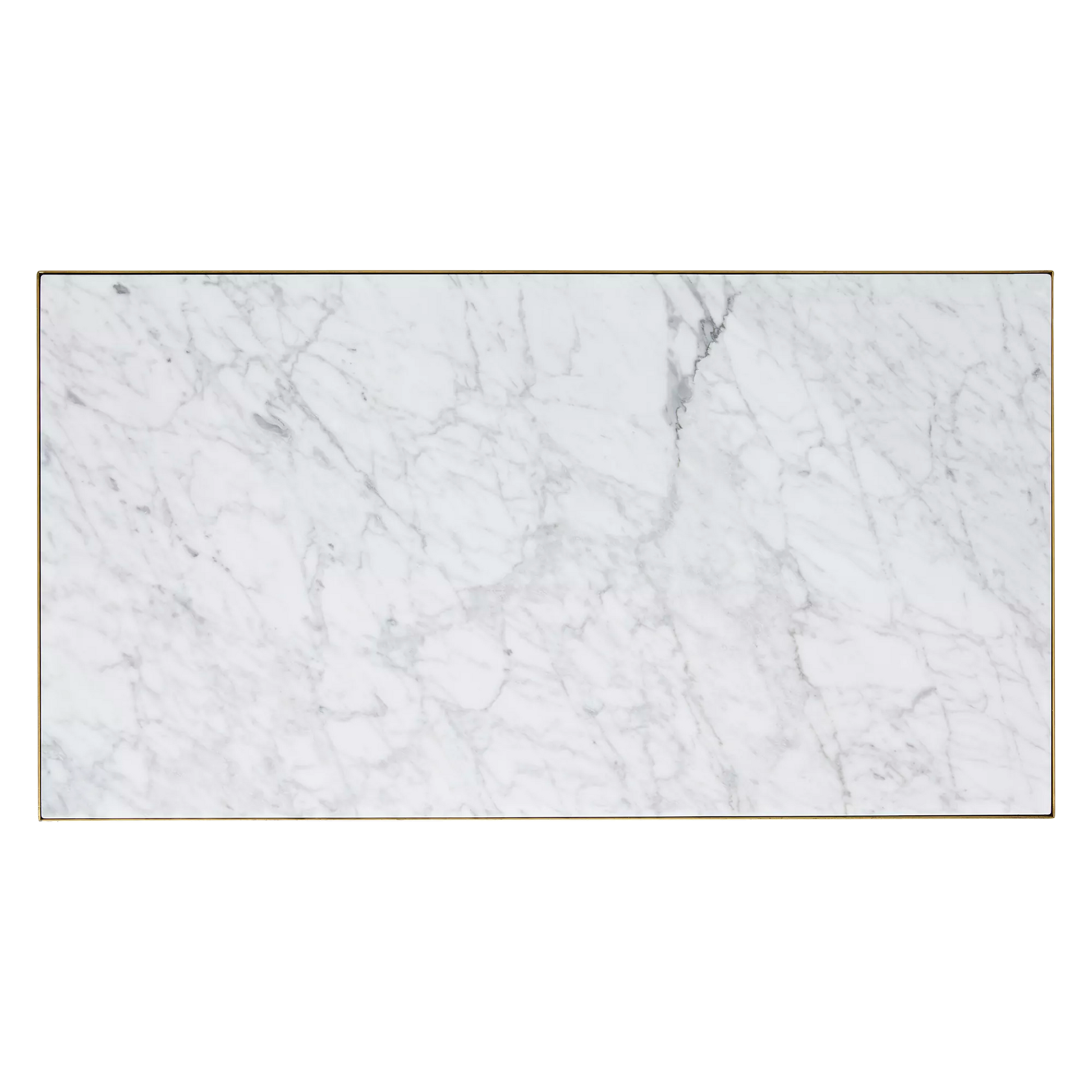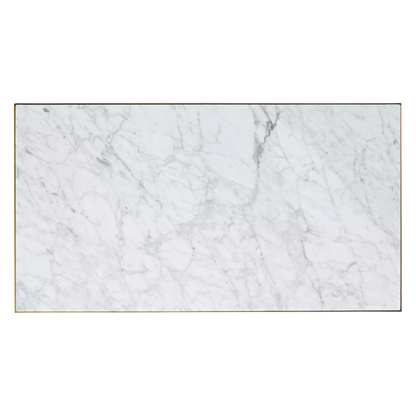 Riche en textures, la table Evert exhibe un somptueux plateau en marbre blanc, incrusté dans une structure rectiligne en laiton. Pour un effet de plateaux dénivelés, combinez ses deux formats.