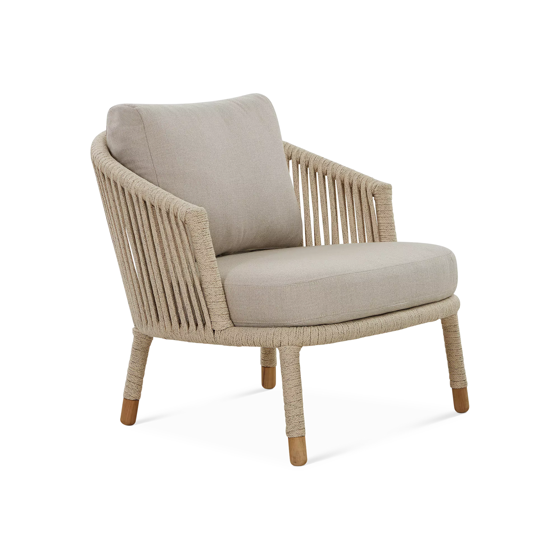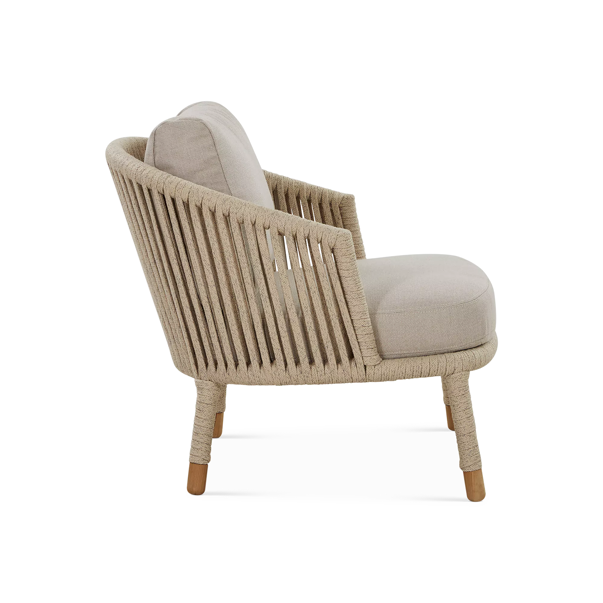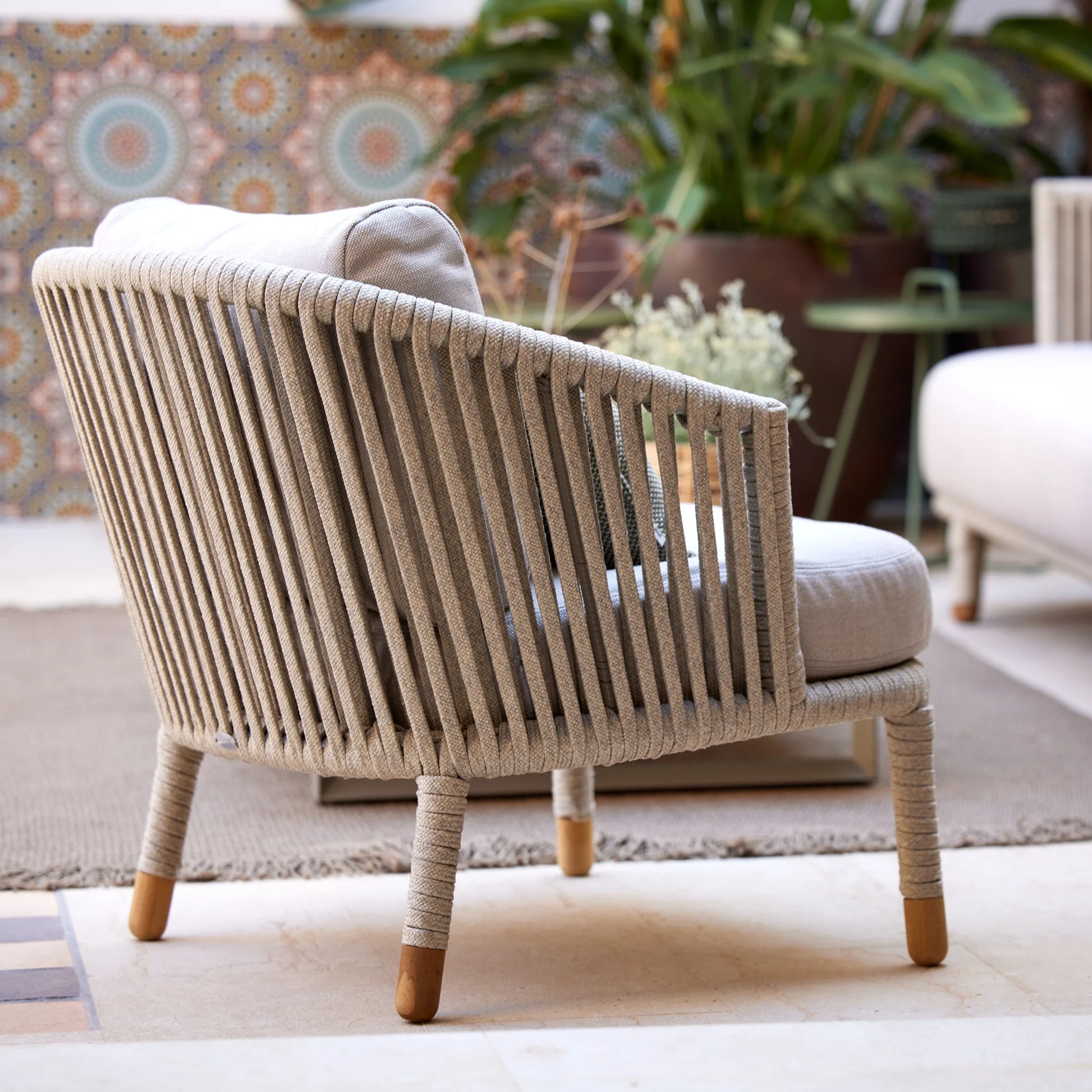 La tendance est aux jeux de tressage, plus ou moins tissés serrés. Le duo de designers danois, Johannes Foersom et Peter Hiort-Lorenzen, a choisi la corde pour habiller le fauteuil Moments. Ce tissage ajouré, qui laisse passer la lumière, lui donne finesse et légèreté. Les coussins, conçus pour un usage extérieur, tout comme la corde, bénéficient des technologies AirTouch et QuickDry de Cane-line : ultra-doux au toucher, ils sèchent en moins d’une heure après une averse.