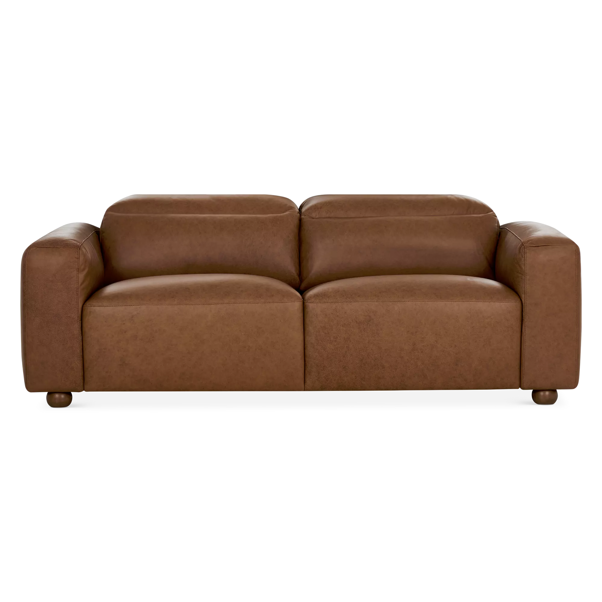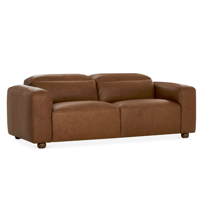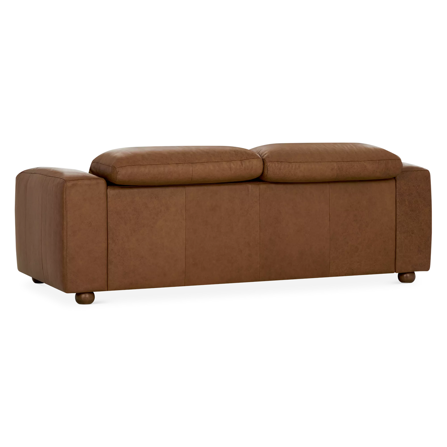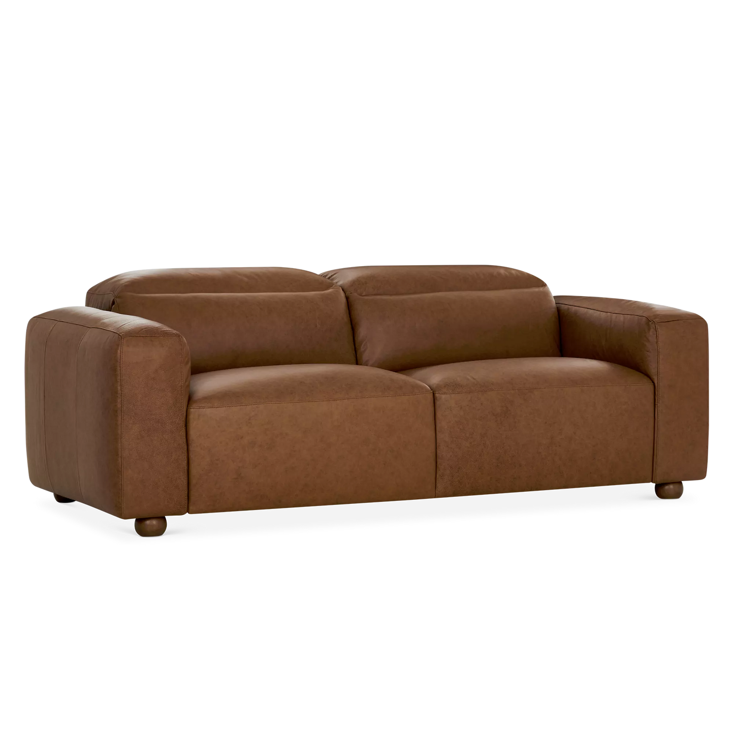 Le canapé Francine, revêtu de cuir, associe confort et élégance. Ses appuie-têtes réglables permettent d’adapter l’inclinaison à vos envies. Avec sa silhouette moderne aux lignes sobres et son piètement sphérique en bois, il affiche un look intemporel qui apporte chic et raffinement à votre salon.