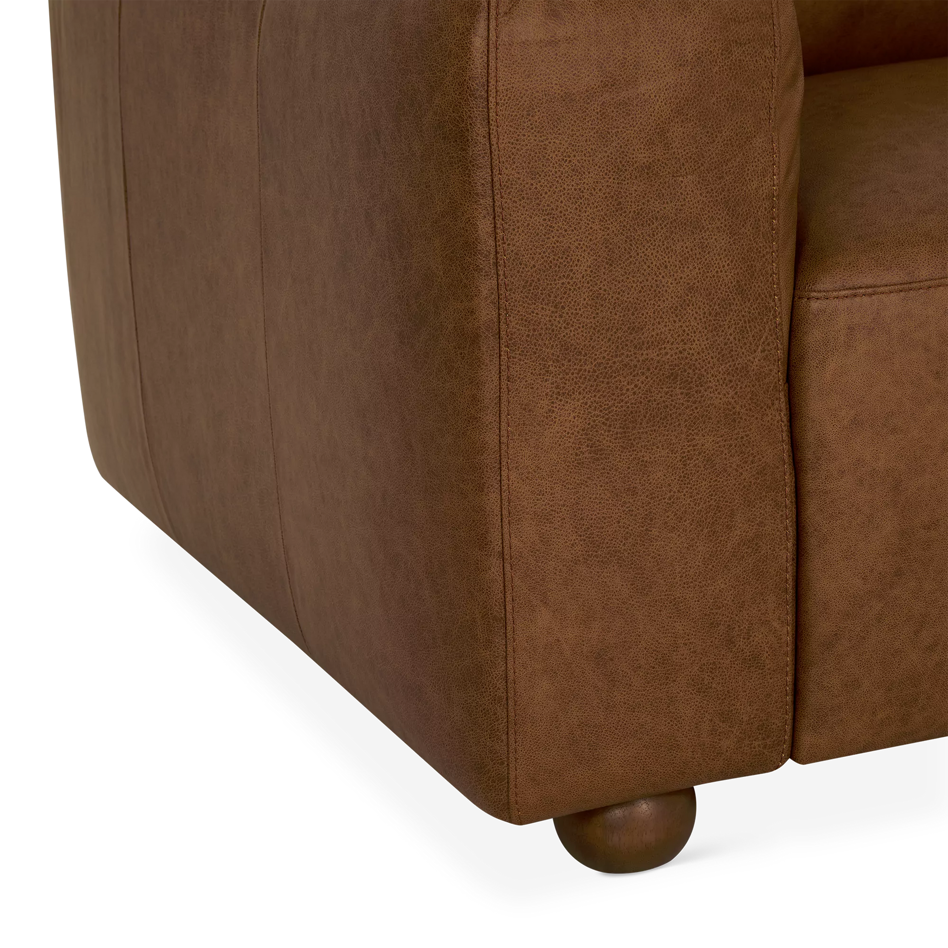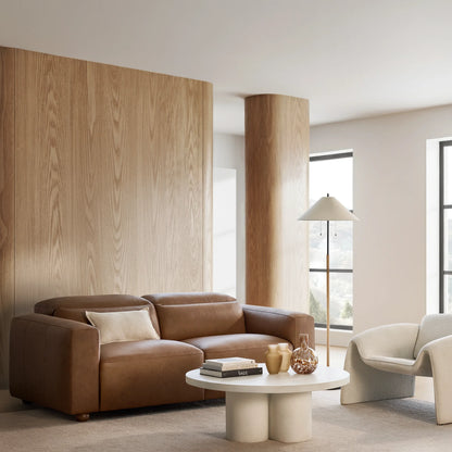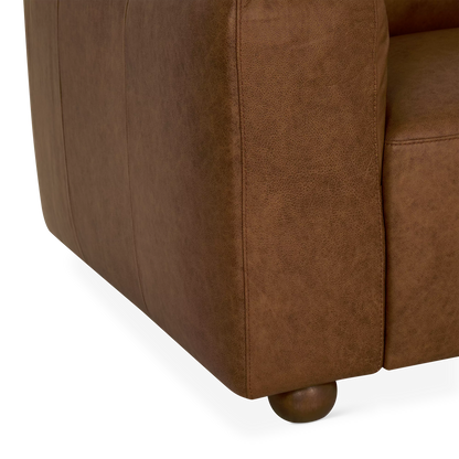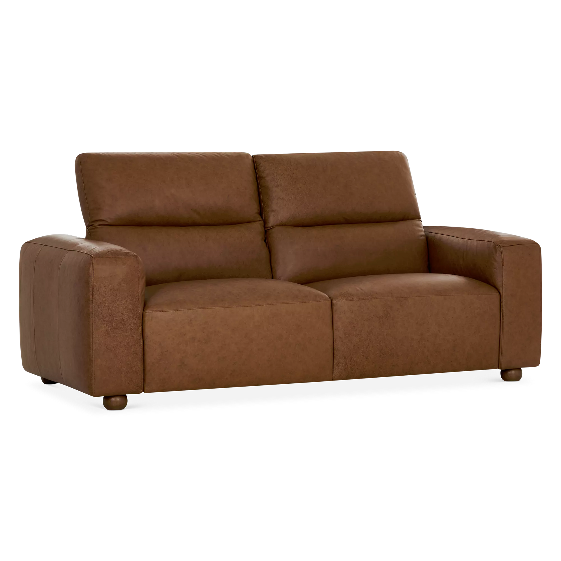 Le canapé Francine, revêtu de cuir, associe confort et élégance. Ses appuie-têtes réglables permettent d’adapter l’inclinaison à vos envies. Avec sa silhouette moderne aux lignes sobres et son piètement sphérique en bois, il affiche un look intemporel qui apporte chic et raffinement à votre salon.