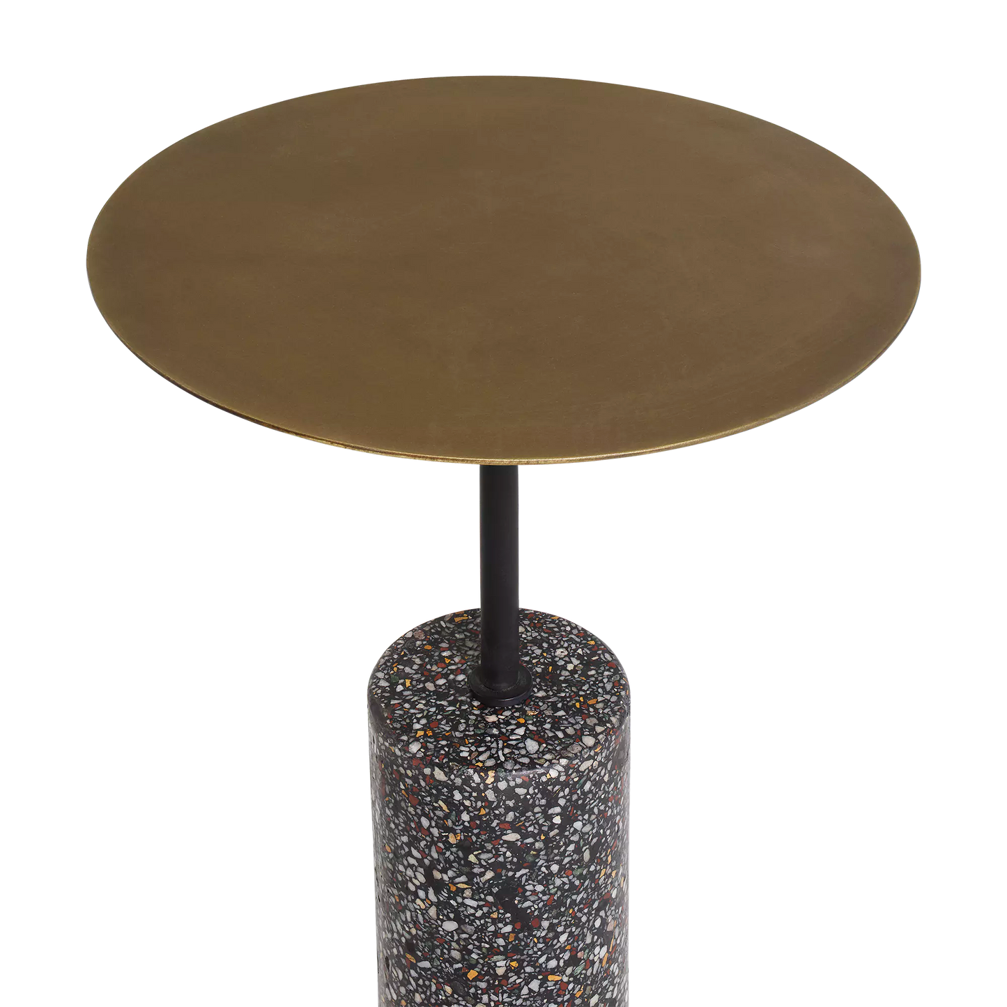 Ayez votre boisson à portée de main! Perchée sur un mince cylindre en terrazzo et munie d’un plateau rond en laiton, la table Gabriel se glisse aisément entre deux fauteuils.
