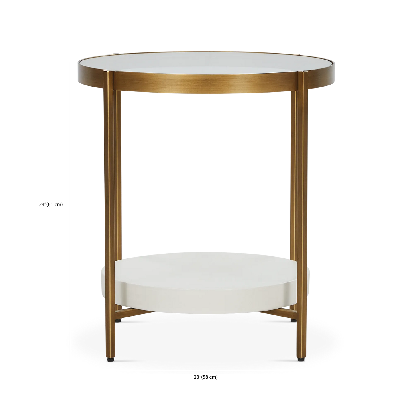 Découvrez une idée discrète mais brillante pour embellir votre salon. La table d’appoint Gia est composée d’un plateau en verre rond et d’une tablette en béton blanc. Le tout repose sur une structure fine en acier au fini en laiton brossé pour un résultat magnifique.