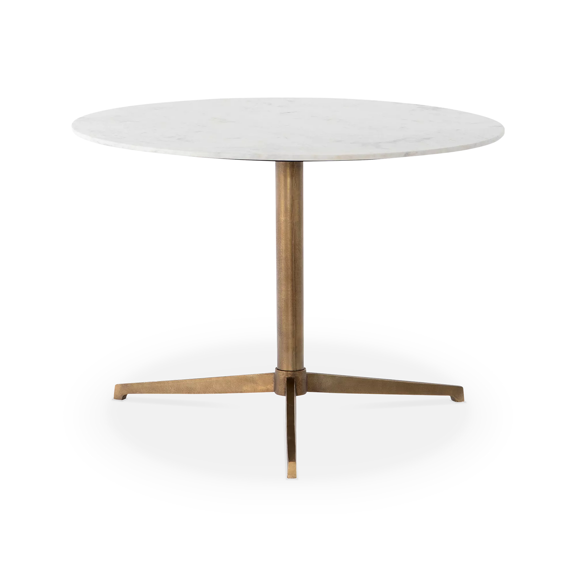 Sophistiquée, la table basse Helen révèle un piètement tripode en laiton antique, surmonté d’un plateau rond en marbre blanc poli. Pour créer un effet de tables superposées, elle peut être harmonisée à sa version d’appoint.