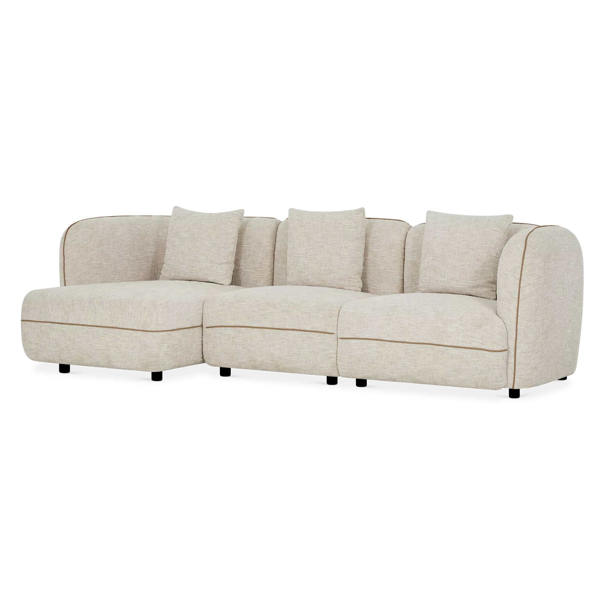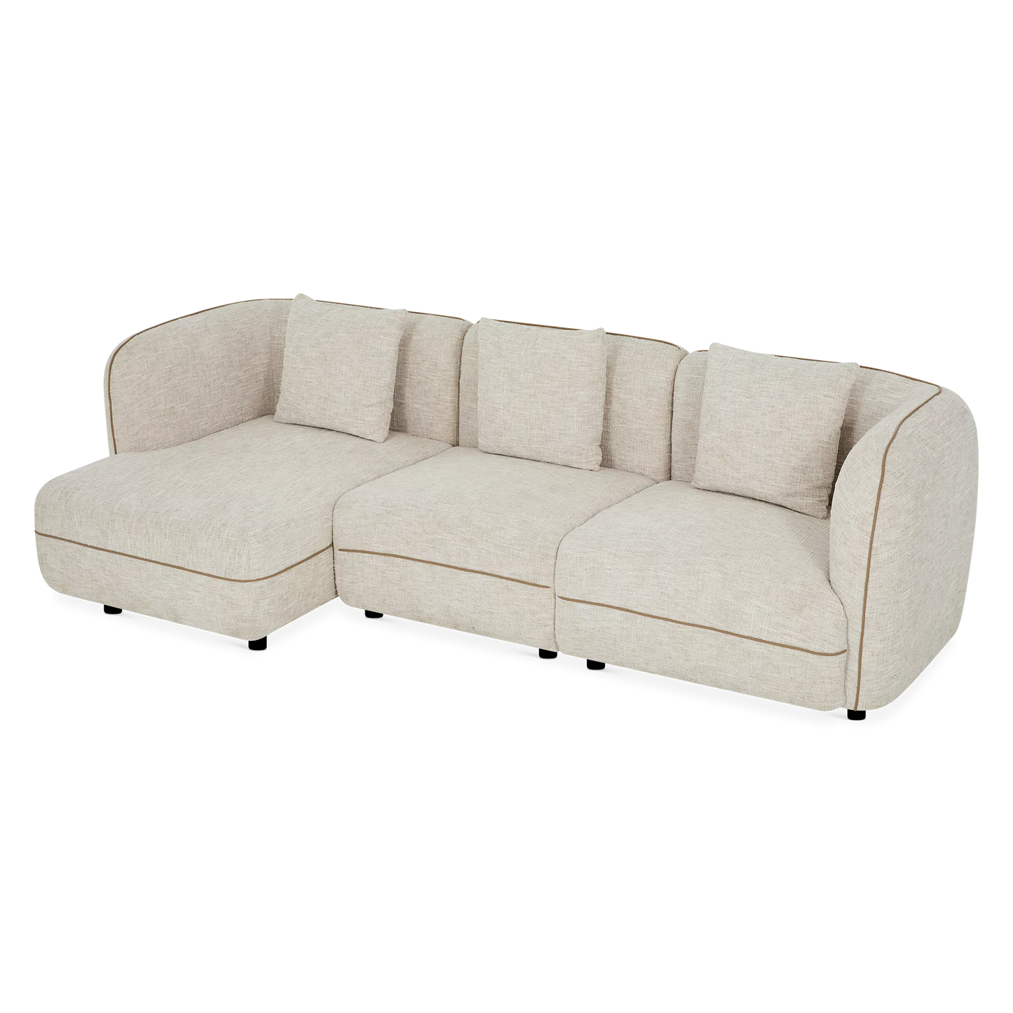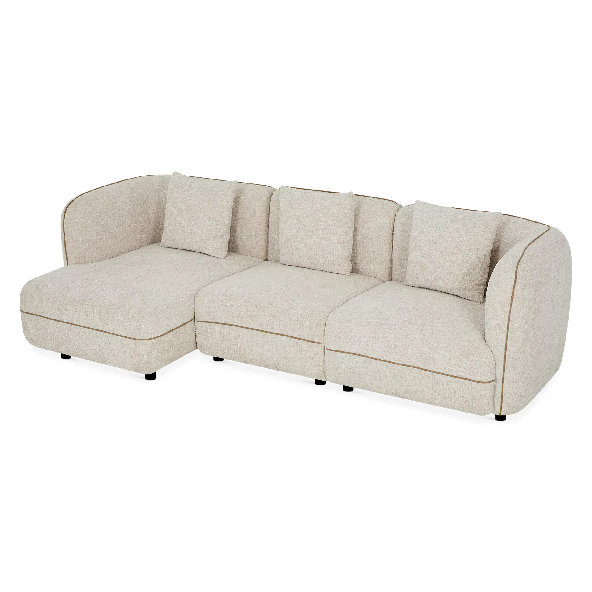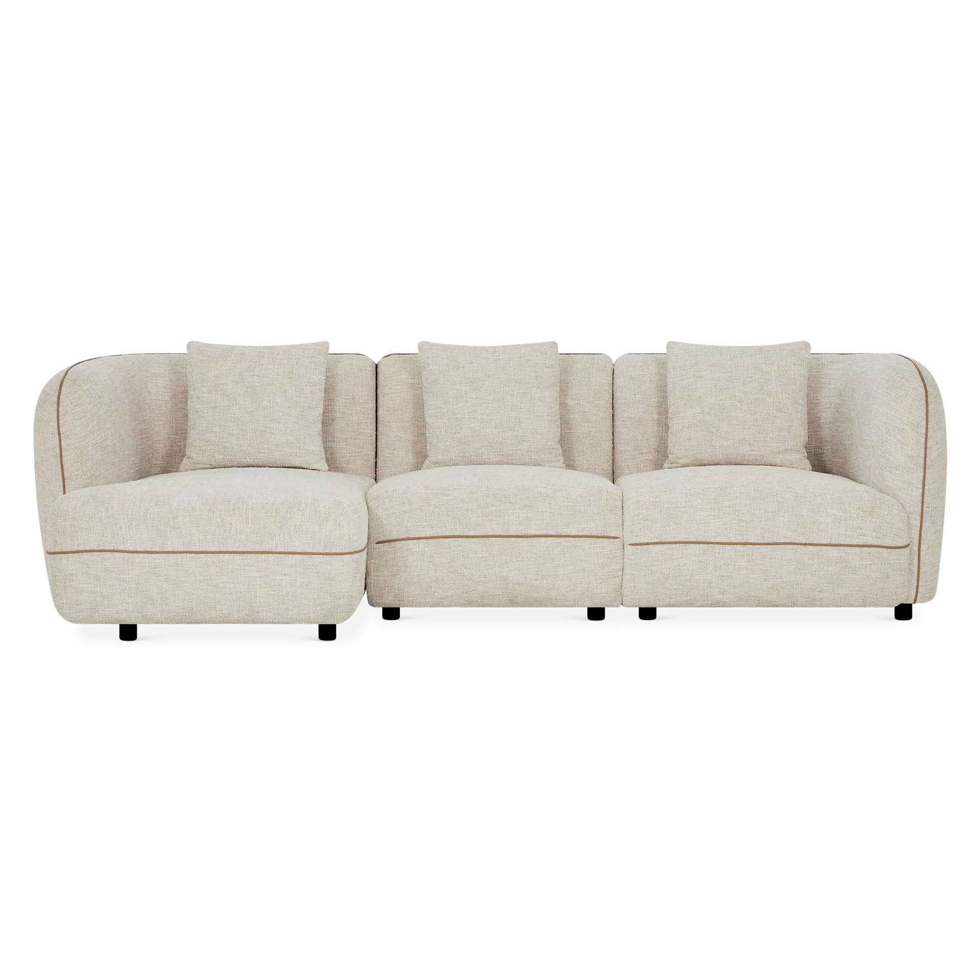 Iris est le sectionnel qui allie confort et style. Son dossier se prolonge en accoudoirs arrondis pour une allure galbée et accueillante, agrémentée de coussins amovibles. Revêtu d’un tissu beige neutre et souligné d’un passepoil contrastant, il offre un look contemporain qui inspire la détente.