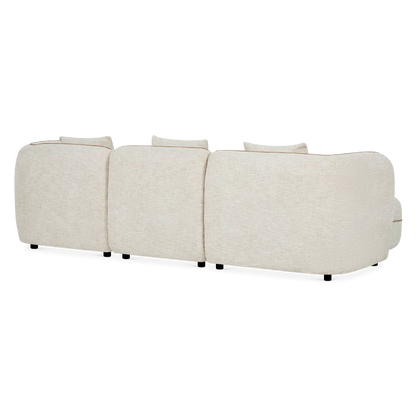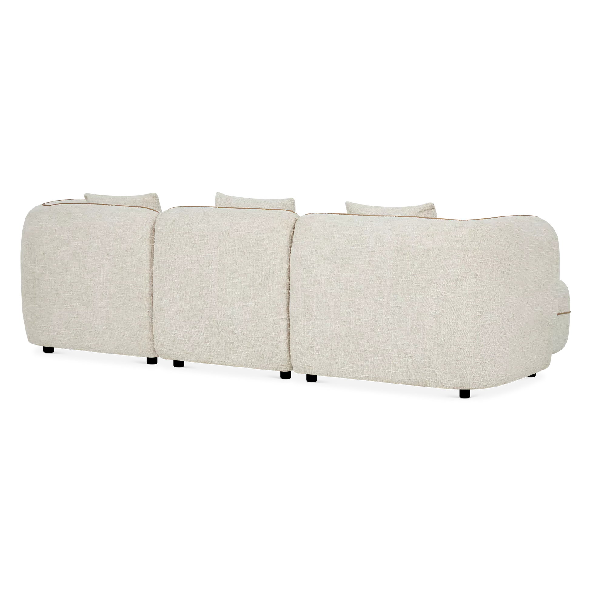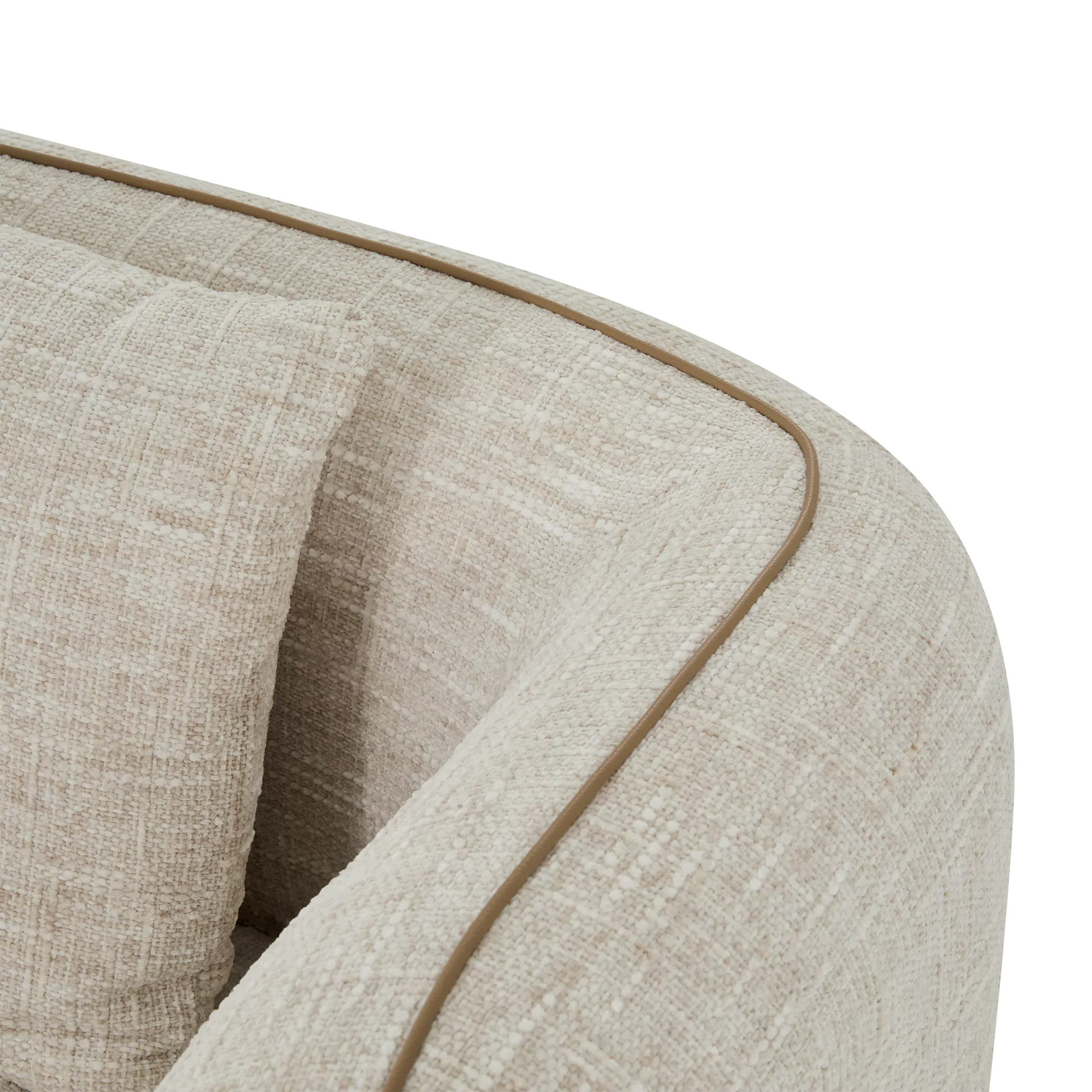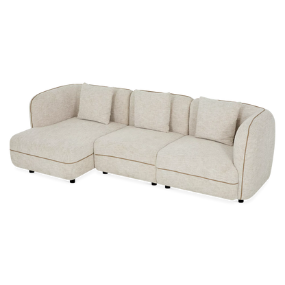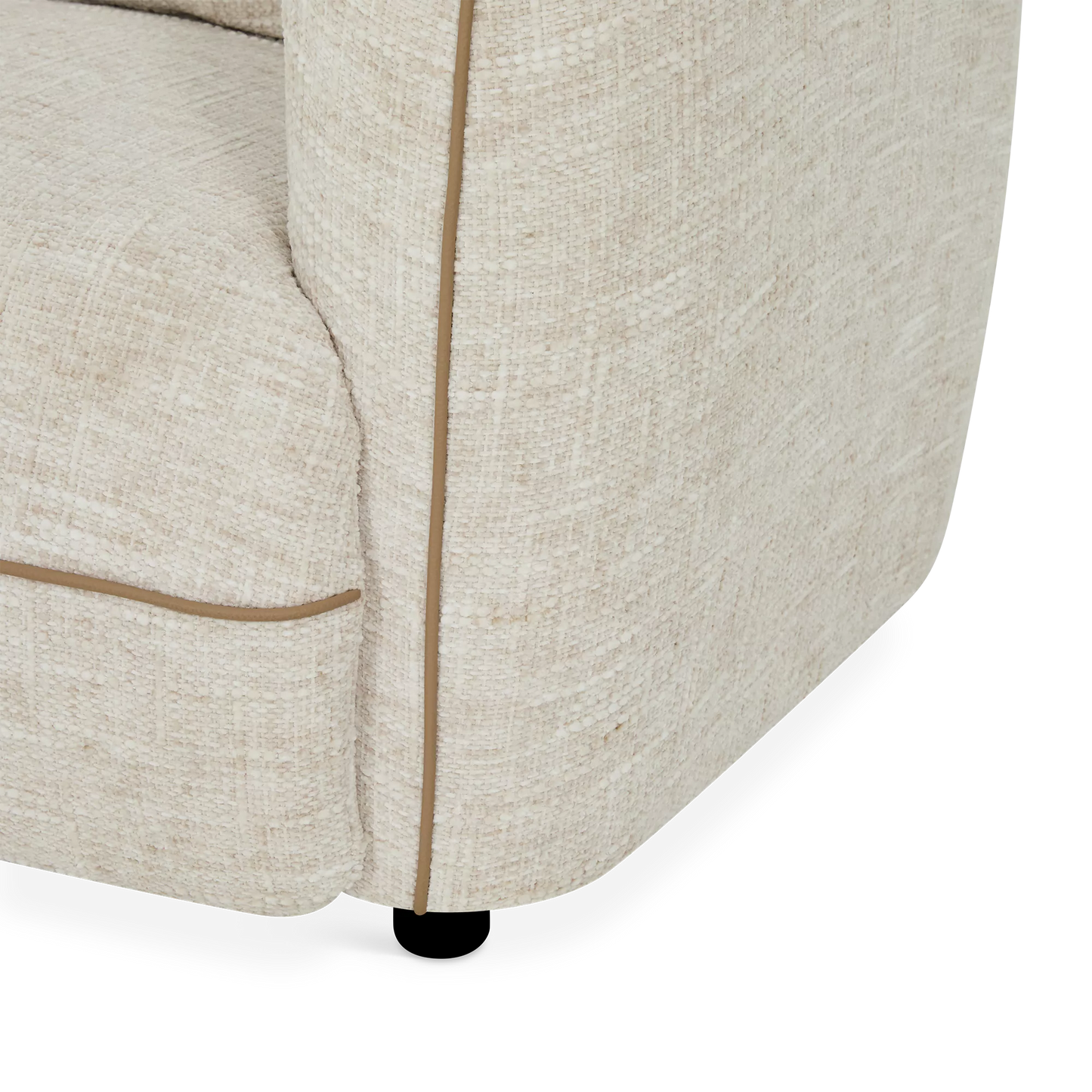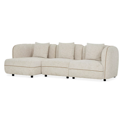 Iris est le sectionnel qui allie confort et style. Son dossier se prolonge en accoudoirs arrondis pour une allure galbée et accueillante, agrémentée de coussins amovibles. Revêtu d’un tissu beige neutre et souligné d’un passepoil contrastant, il offre un look contemporain qui inspire la détente.