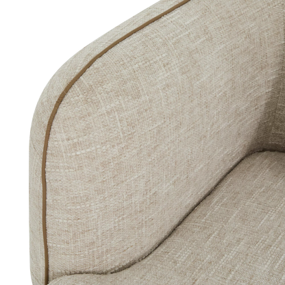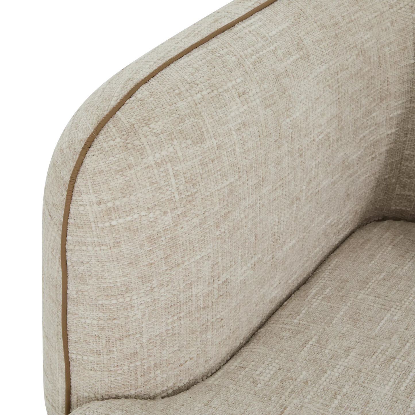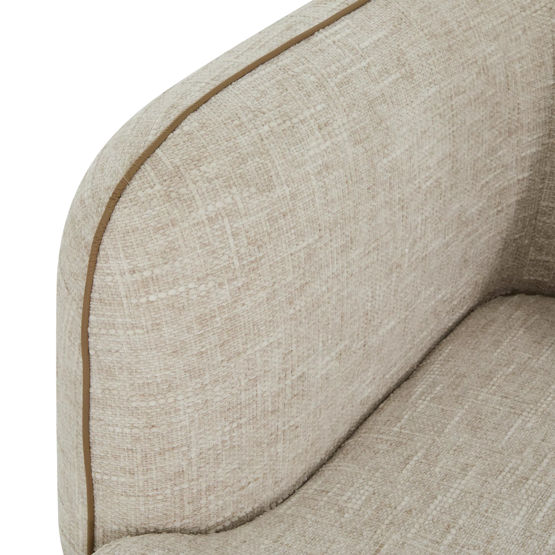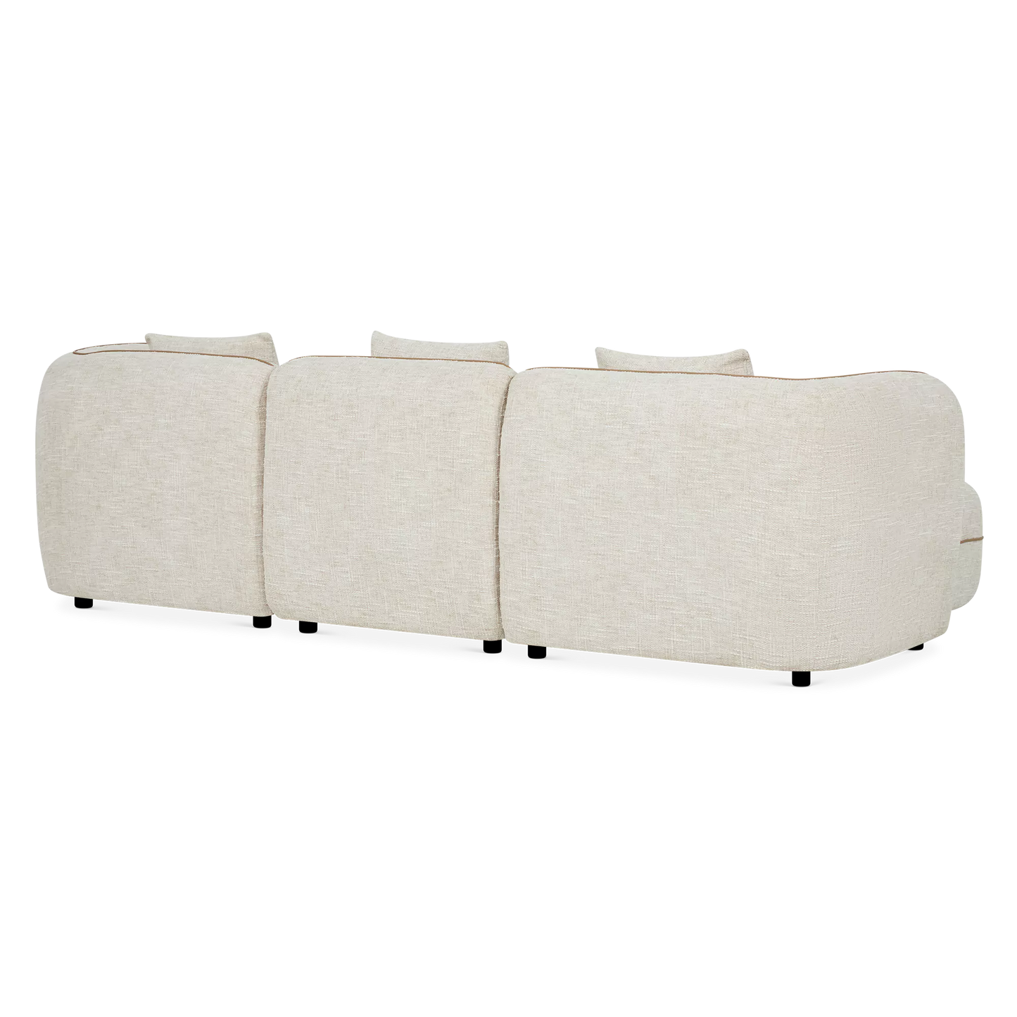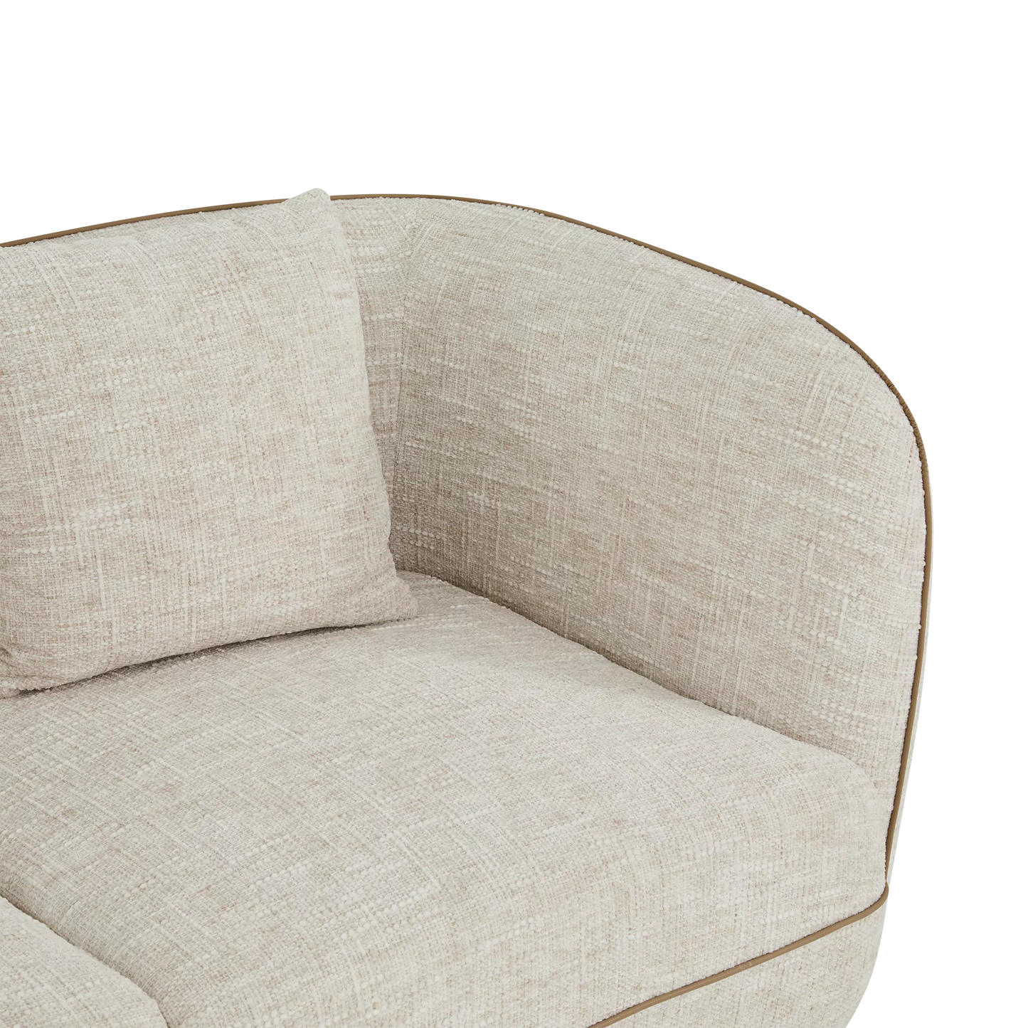 Iris est le sectionnel qui allie confort et style. Son dossier se prolonge en accoudoirs arrondis pour une allure galbée et accueillante, agrémentée de coussins amovibles. Revêtu d’un tissu beige neutre et souligné d’un passepoil contrastant, il offre un look contemporain qui inspire la détente.