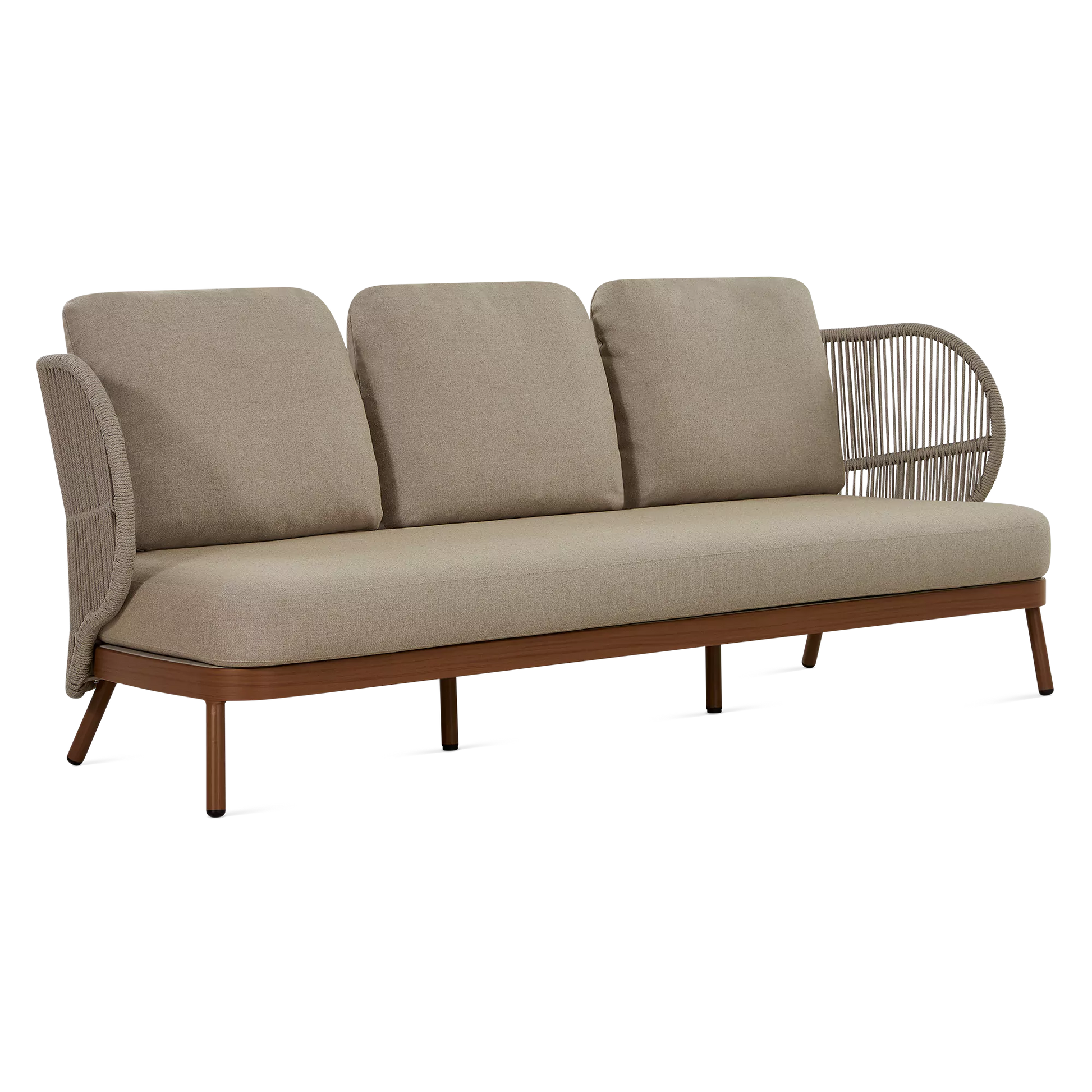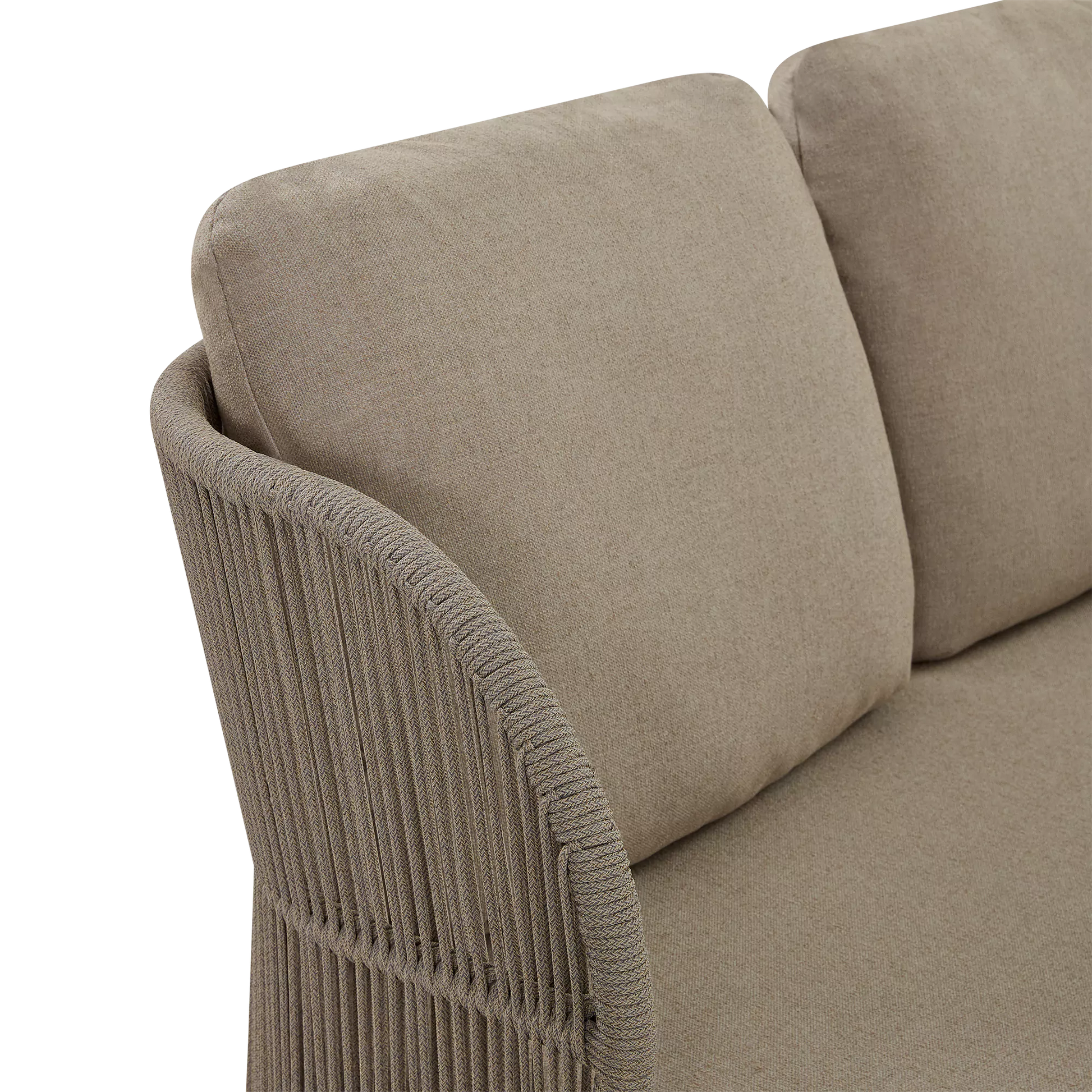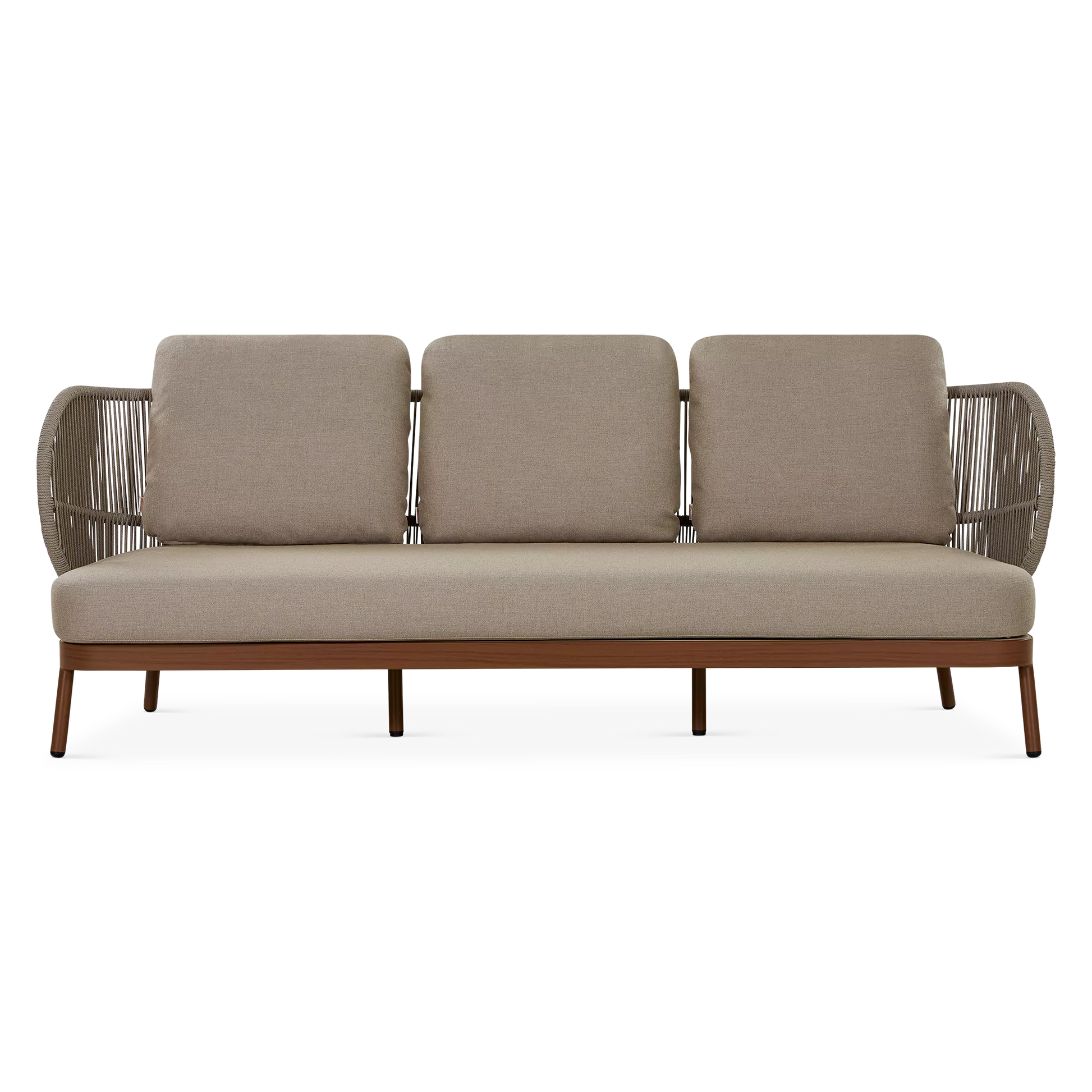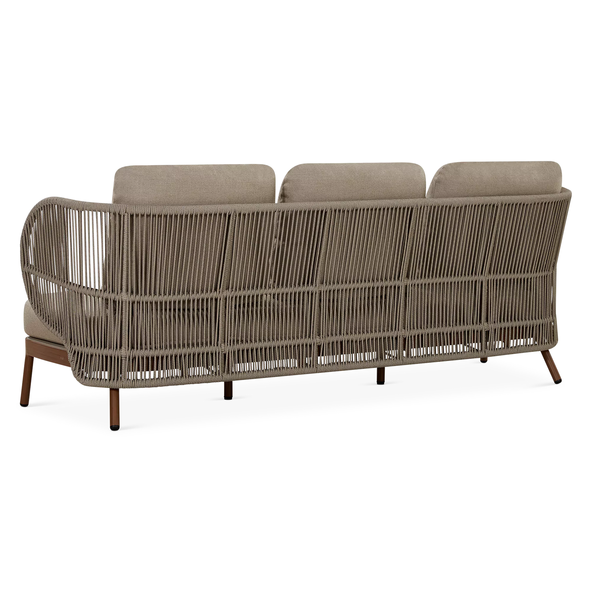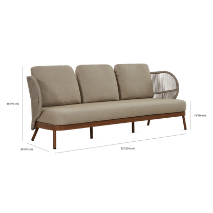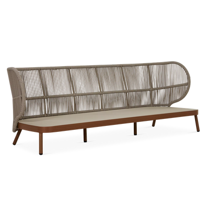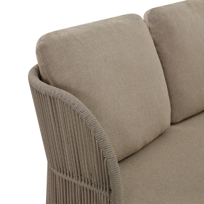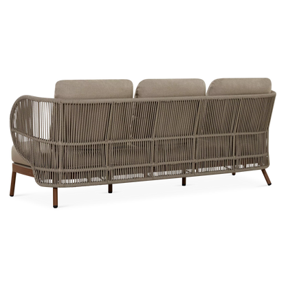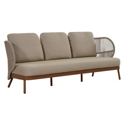 Dans un jardin boisé ou sur une terrasse en ville, le canapé 3 places Kiss offre un confort spacieux et élégant qui s’intègre parfaitement à son environnement grâce à son design contemporain et son format généreux. À l'allure contemporaine, son cadre en aluminium est complémenté d'un dossier ajouré en corde qui enveloppe l'occupant tandis que ses coussins galbés offrent un confort soutenu.