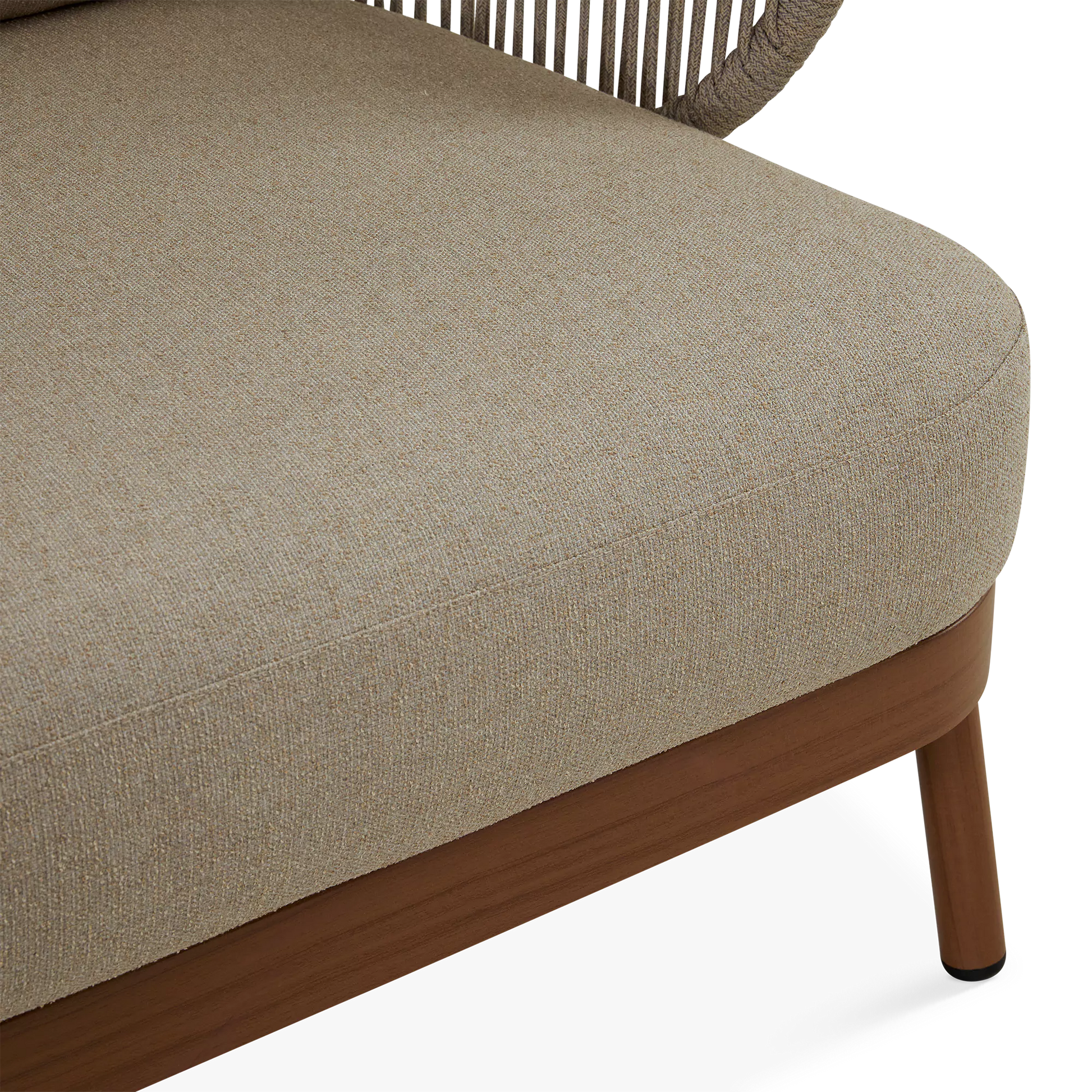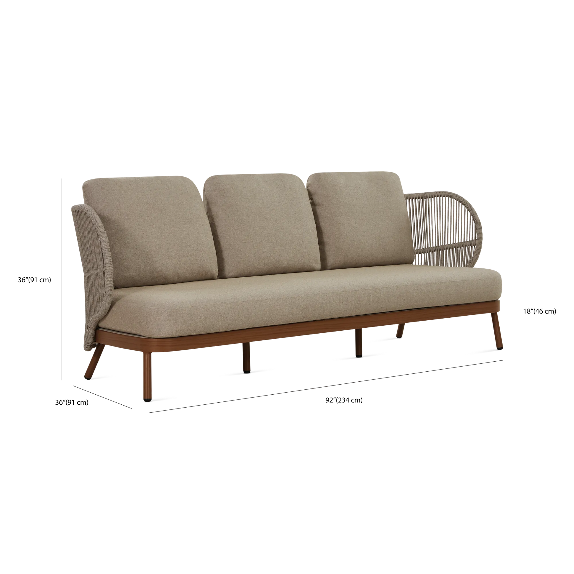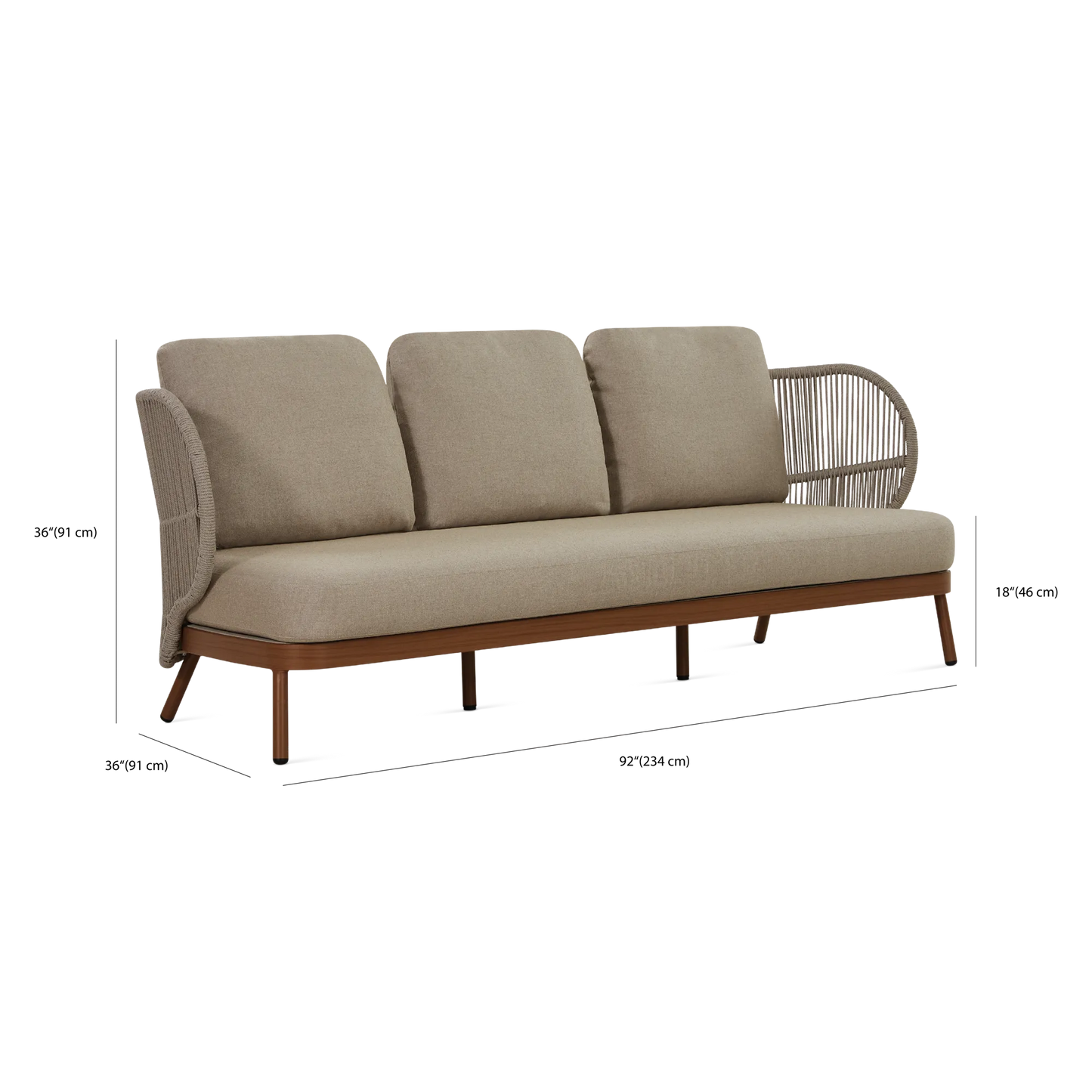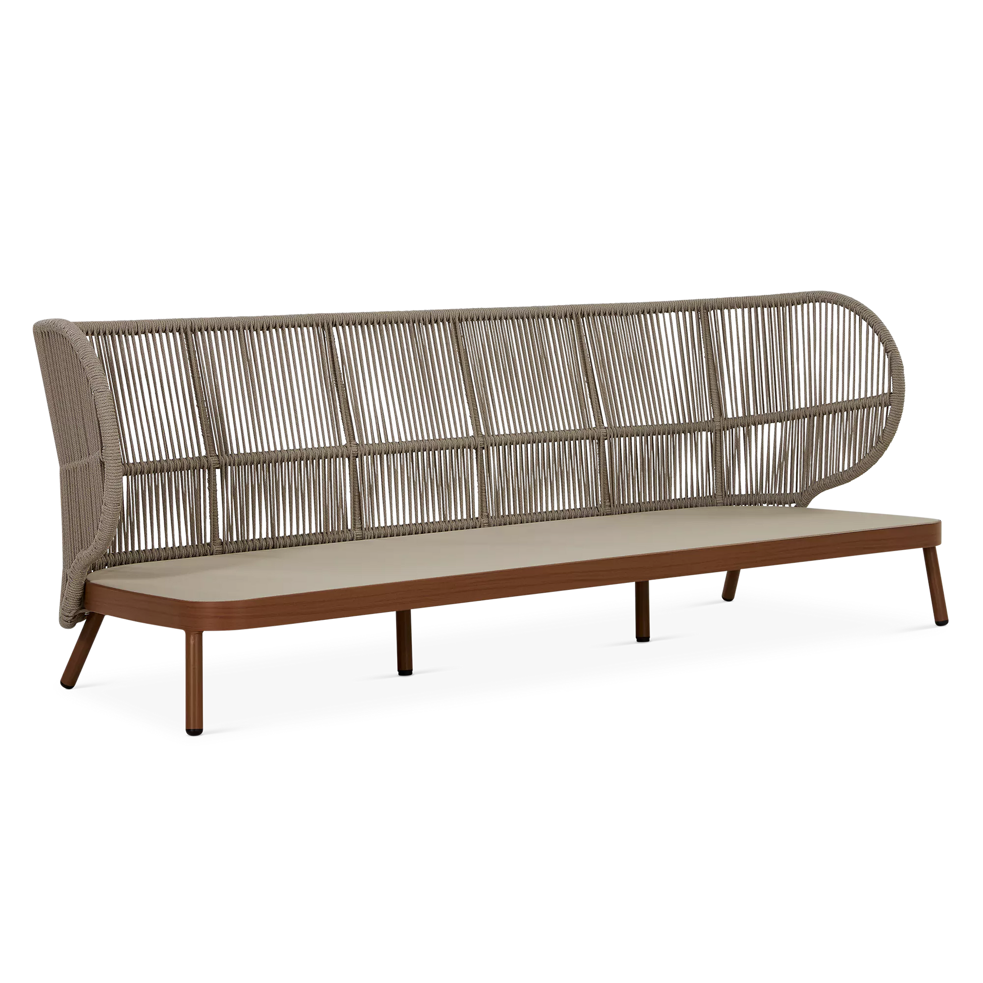 Dans un jardin boisé ou sur une terrasse en ville, le canapé 3 places Kiss offre un confort spacieux et élégant qui s’intègre parfaitement à son environnement grâce à son design contemporain et son format généreux. À l'allure contemporaine, son cadre en aluminium est complémenté d'un dossier ajouré en corde qui enveloppe l'occupant tandis que ses coussins galbés offrent un confort soutenu.