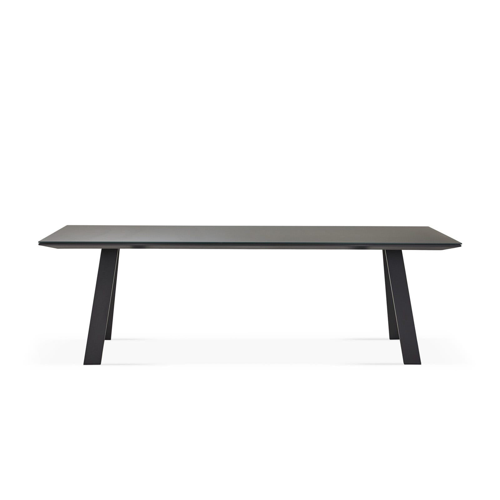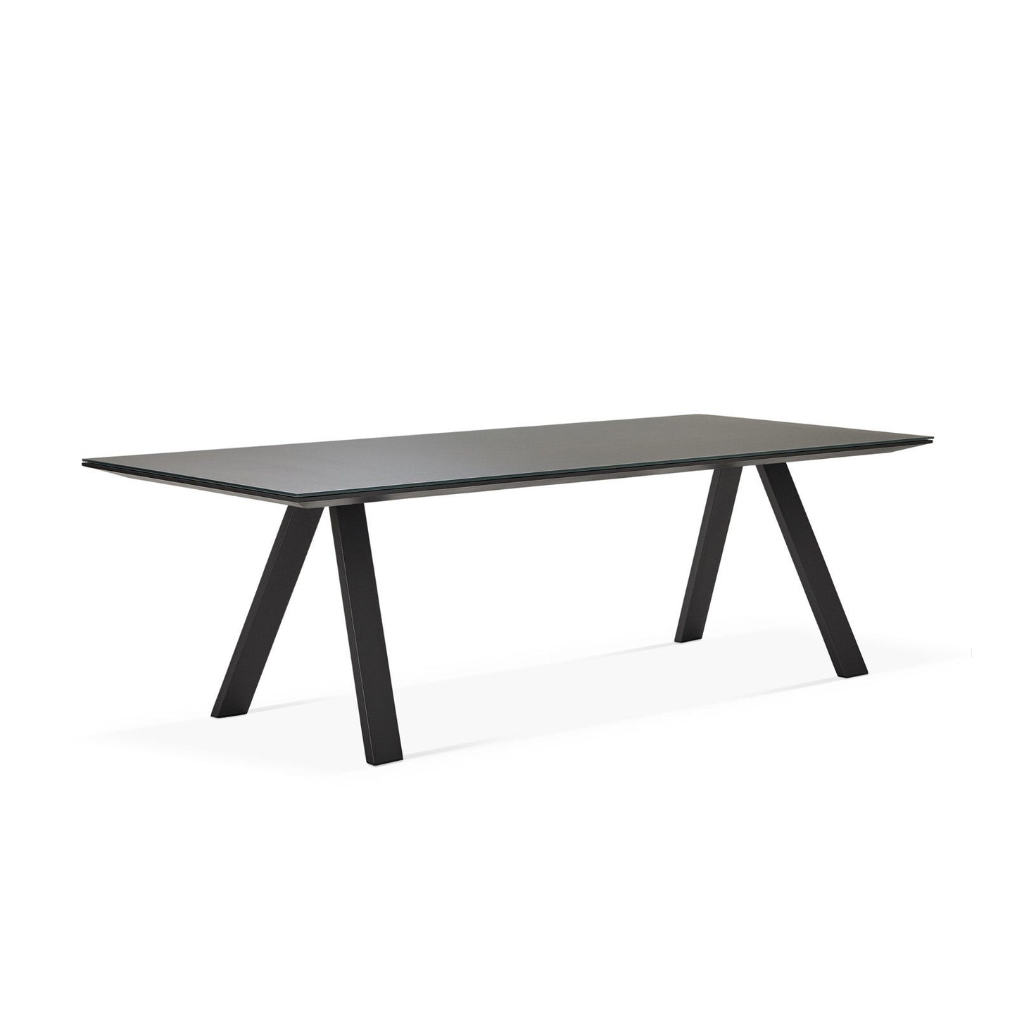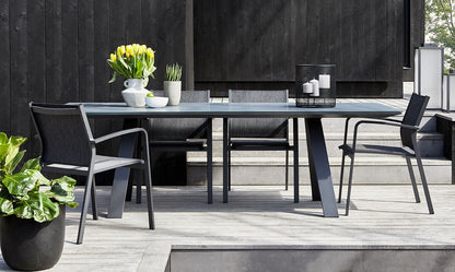 Version de luxe de la table à tréteaux, Lavida combine piètement en aluminium anticorrosion et plateau en verre trempé à l’effet teinté. Ce dernier n’est pas fixé à la structure pour faciliter son entreposage en hiver. Invitante et polyvalente, cette table peut accueillir huit personnes et s’intègre aussi bien à une déco moderne que rustique chic.