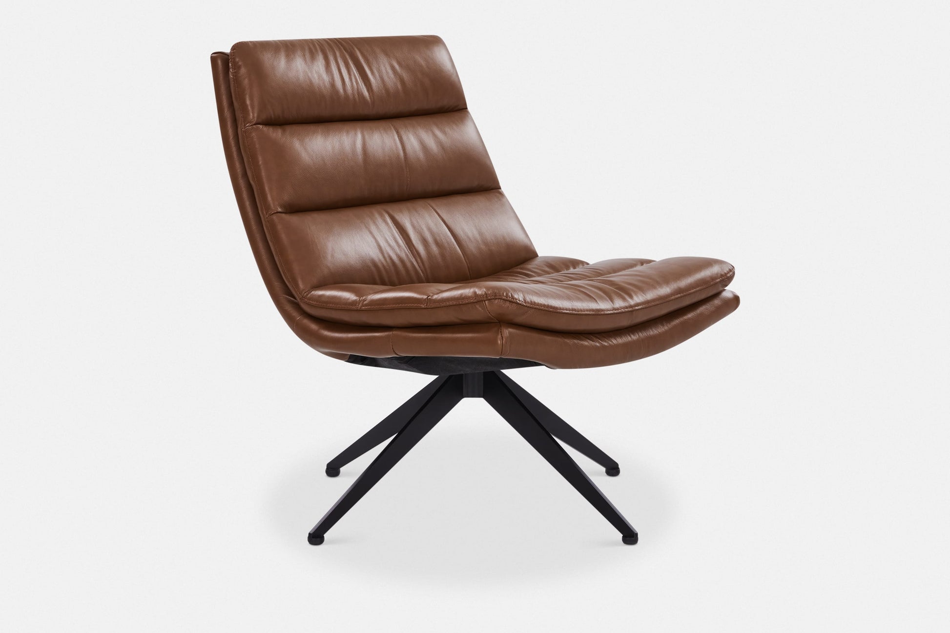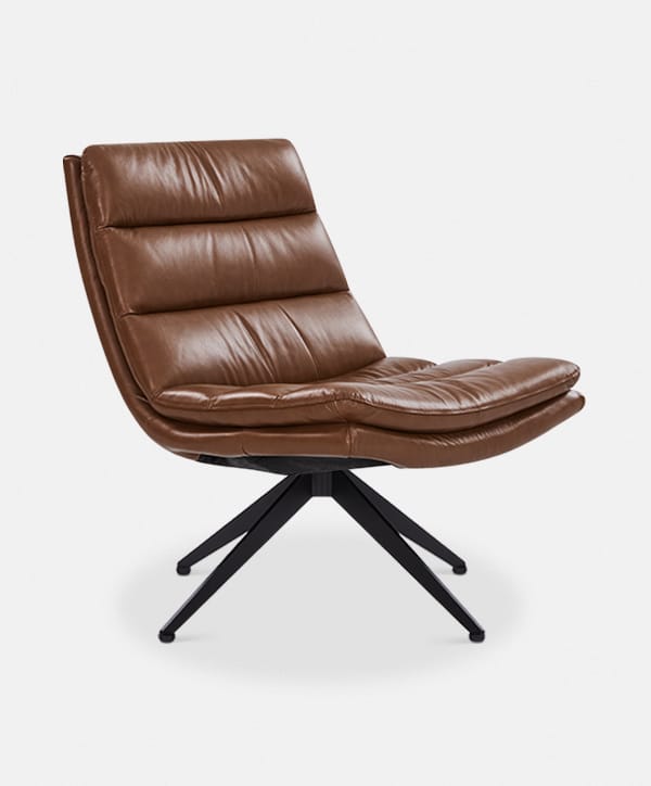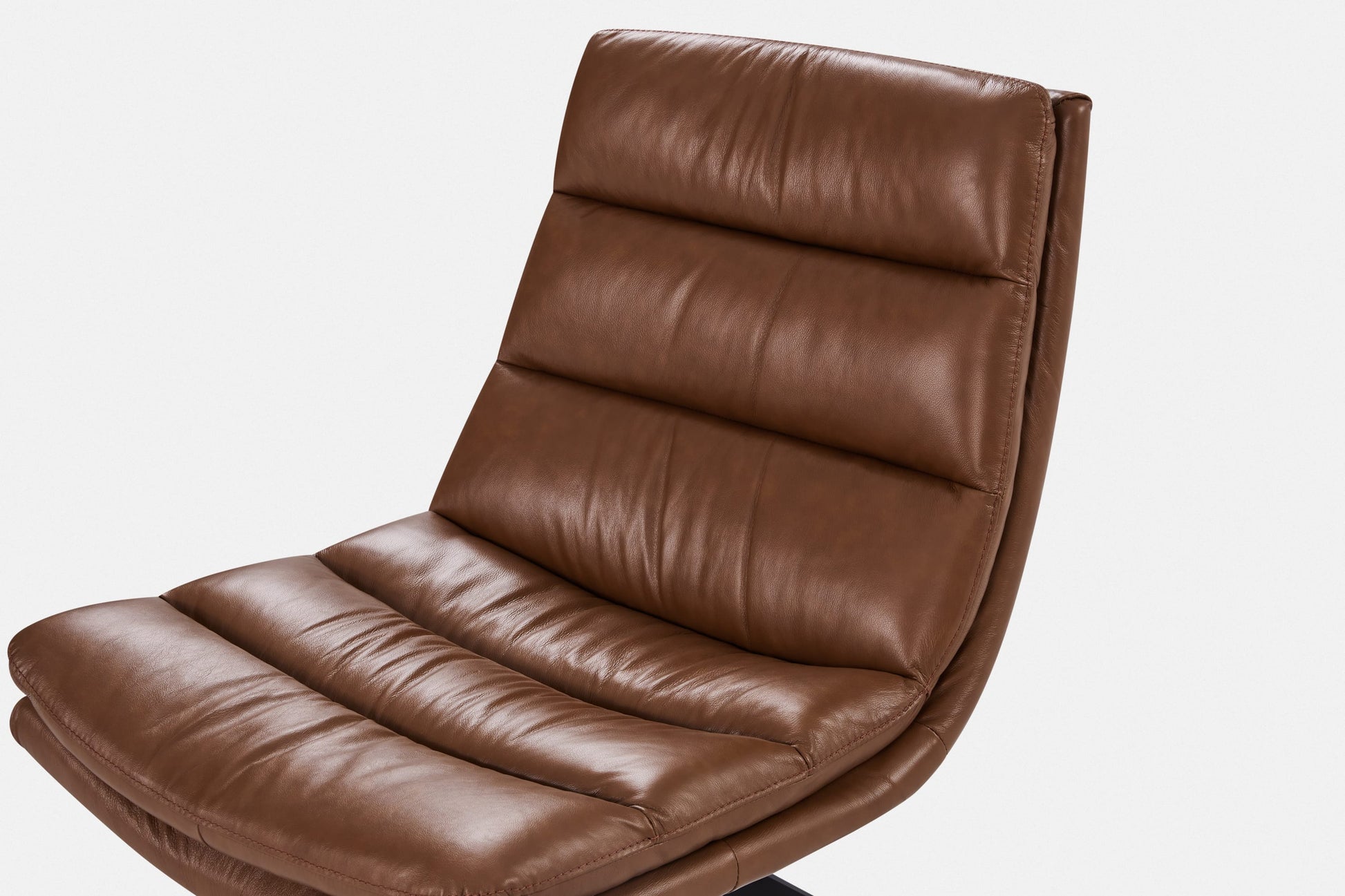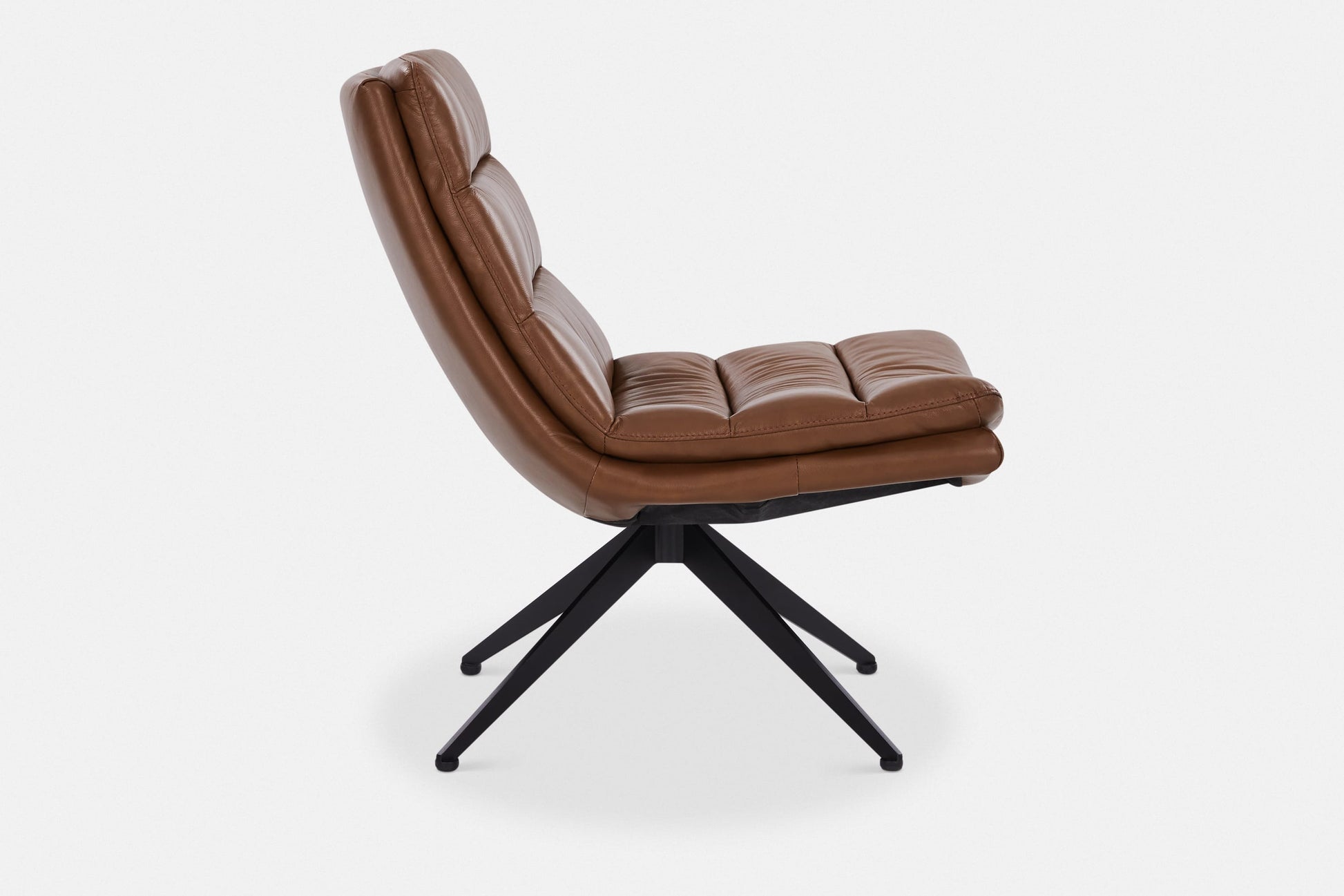 Leon, fauteuil pivotant revêtu de cuir, est au goût du jour avec sa base en teck et son piètement évasé. Son rembourrage délicat et ses coussins dorsaux rebondis assurent une assise moelleuse et confortable.