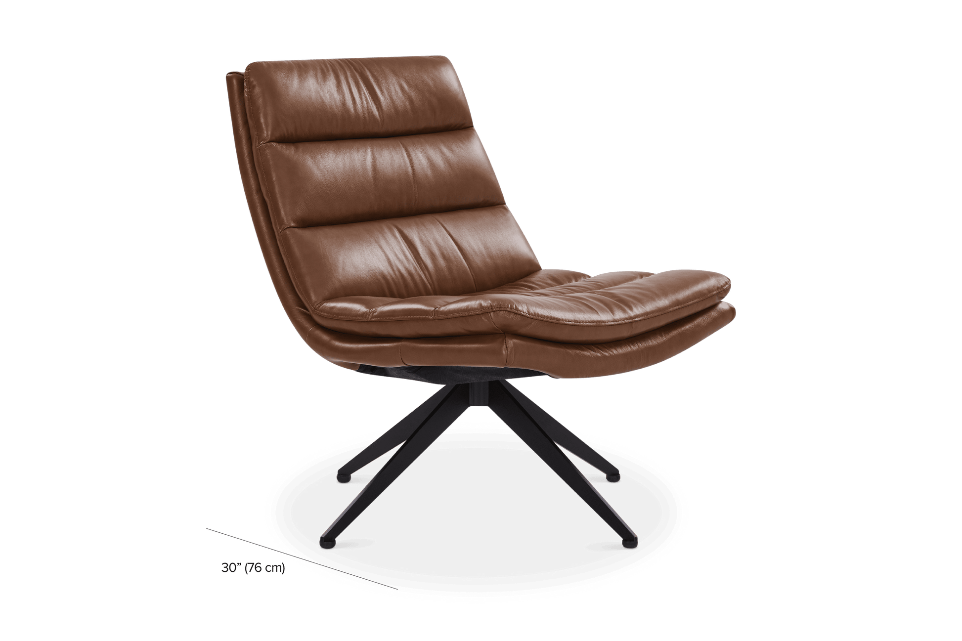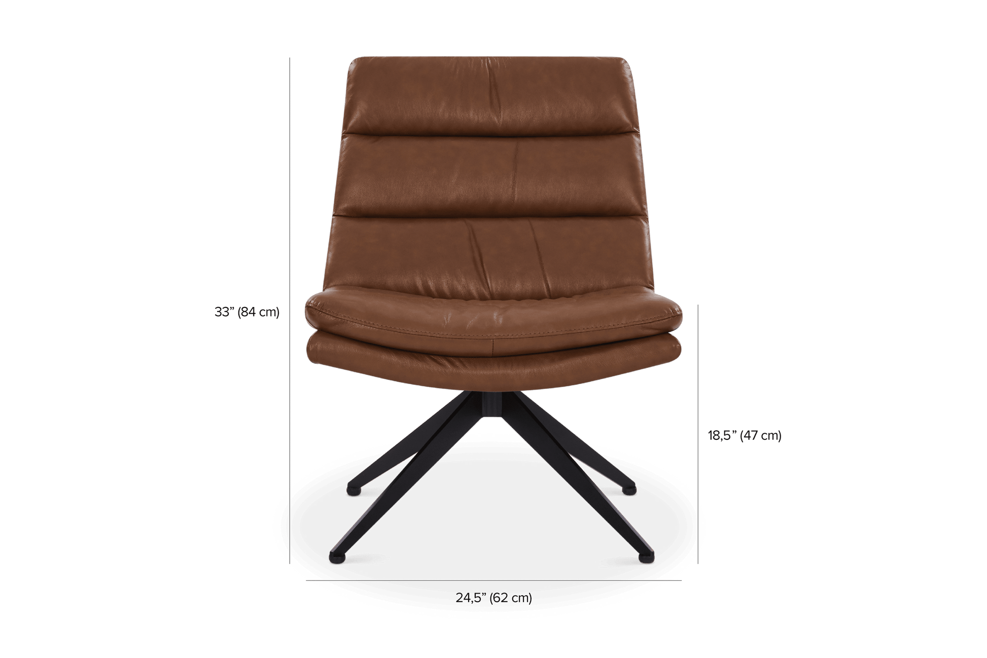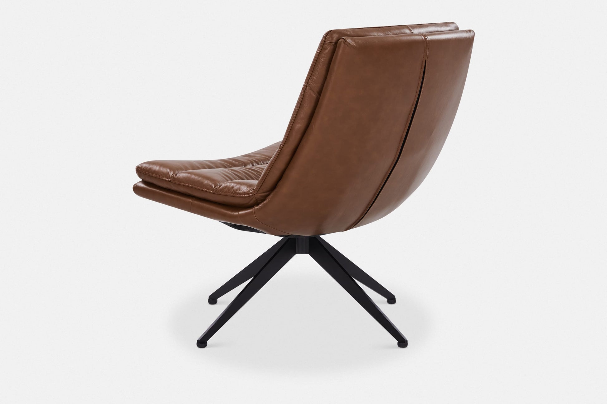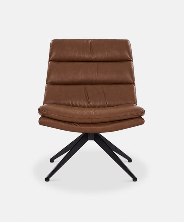 Leon, fauteuil pivotant revêtu de cuir, est au goût du jour avec sa base en teck et son piètement évasé. Son rembourrage délicat et ses coussins dorsaux rebondis assurent une assise moelleuse et confortable.