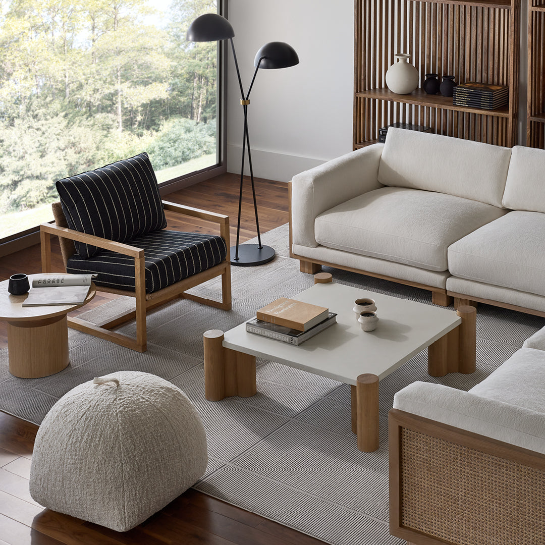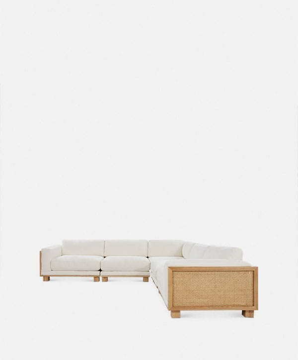 Le canapé sectionnel Lumpur apporte une touche chaleureuse et apaisante au salon. Ses coussins généreux et accueillants en tissu ivoire sont mis en lumière par un cadre en bois naturel et des accents de canne de rotin tressée.