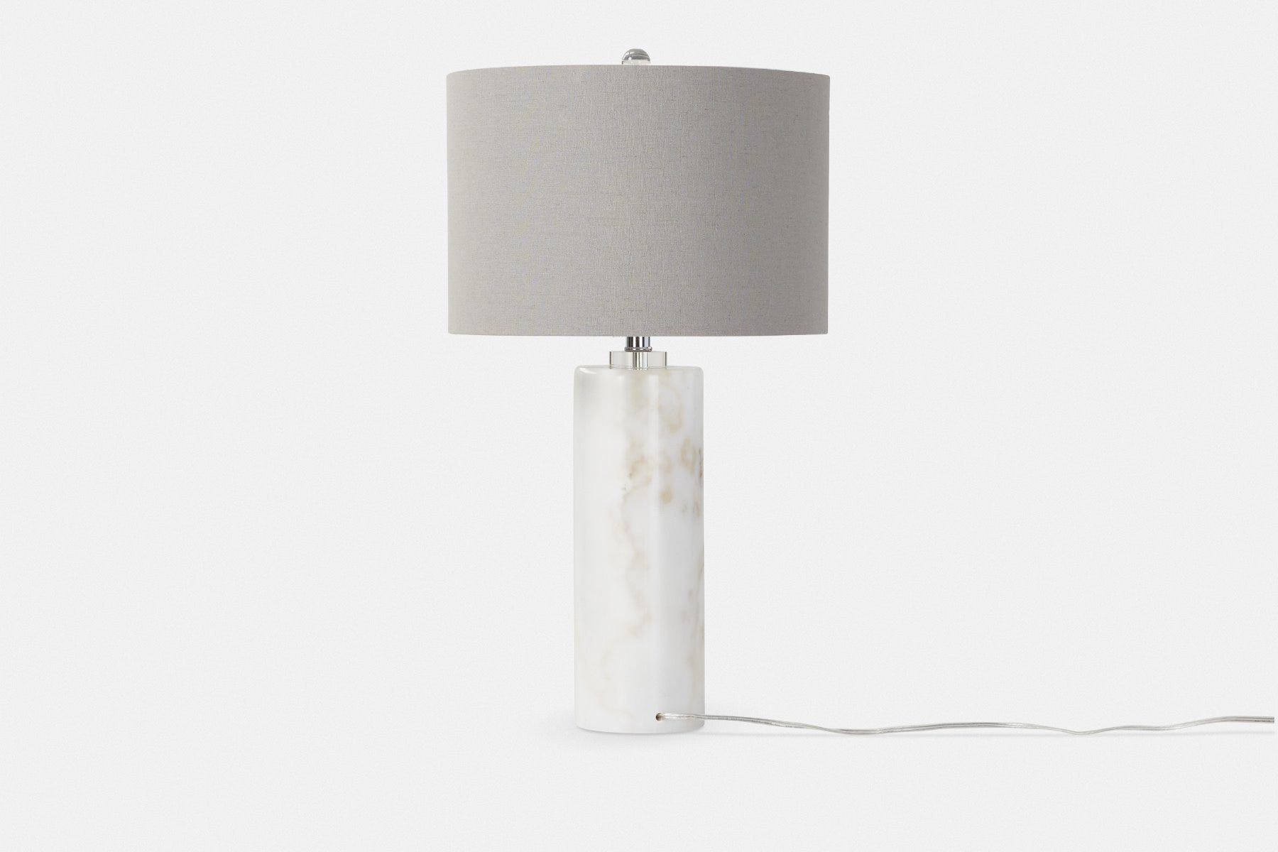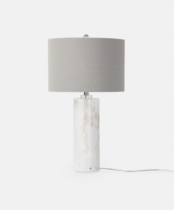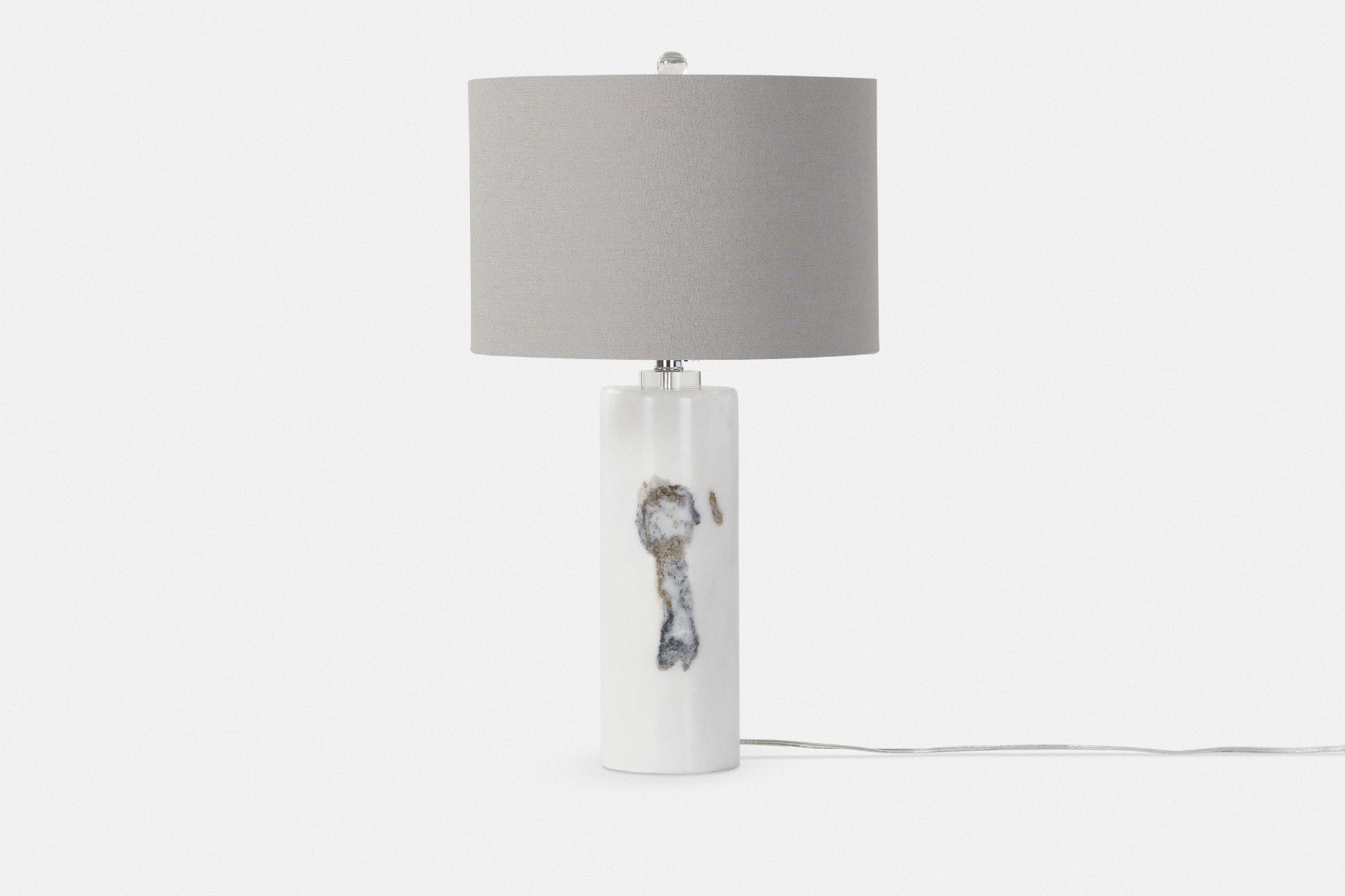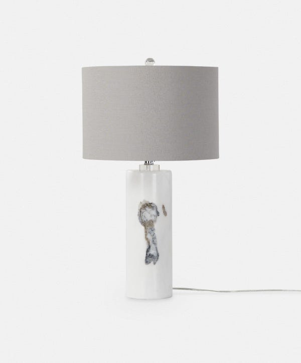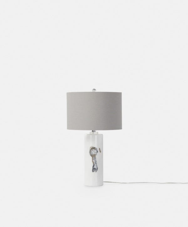 Sophisticated and modern, Raywick is a cylindrical marble table lamp. It is distinguished by the uniqueness of its natural stone composition, which makes each one of these lamps a singular piece.