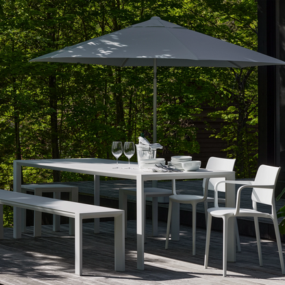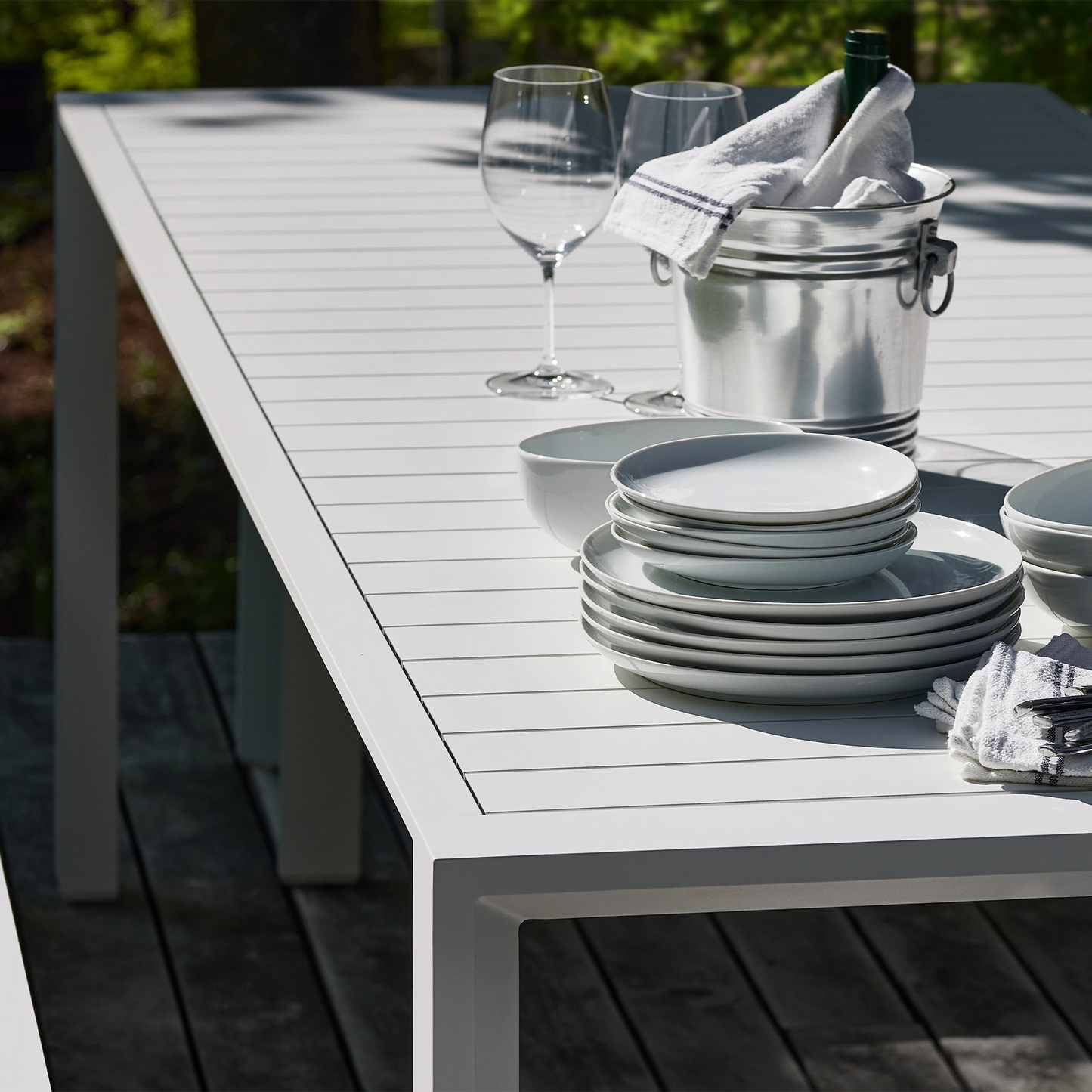 Less is more—that’s the mantra behind Metris, a sleek and modern dining table that seats up to 8 guests. Standing on rectilinear legs and equipped with a top in a discreet linear pattern, Metris is made entirely out of powder-coated aluminium, a material that’s designed to withstand the elements.