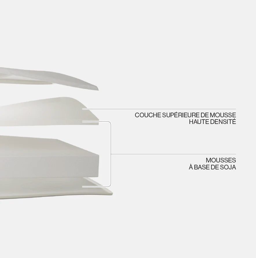 - Deux (2) couches de mousses à base de soja, certifiées CertiPUR-US : écologiques et durables, produites à Montréal.