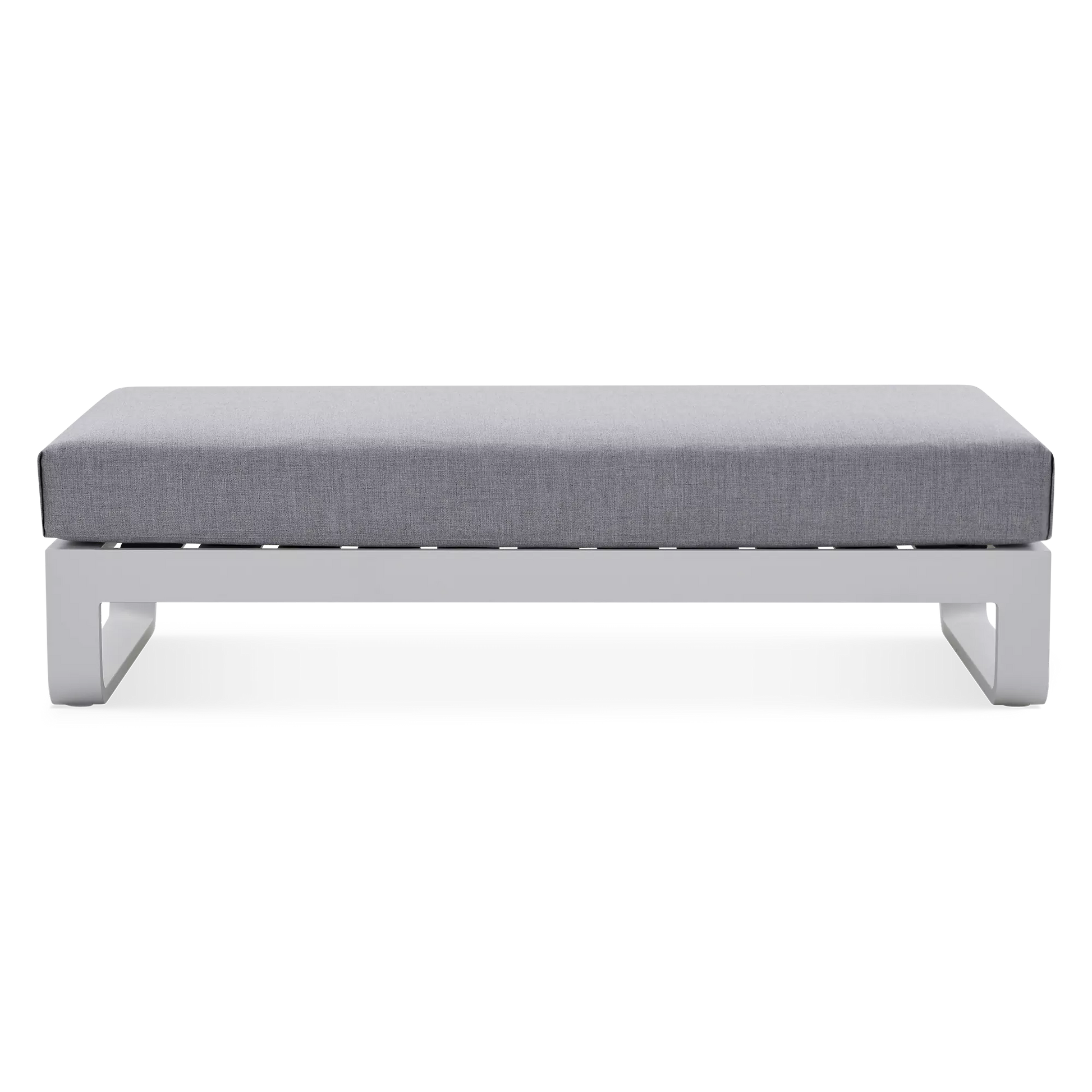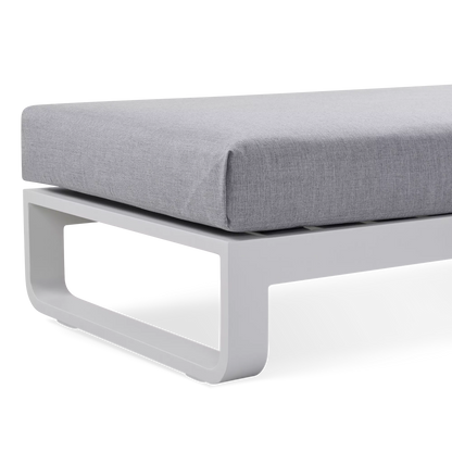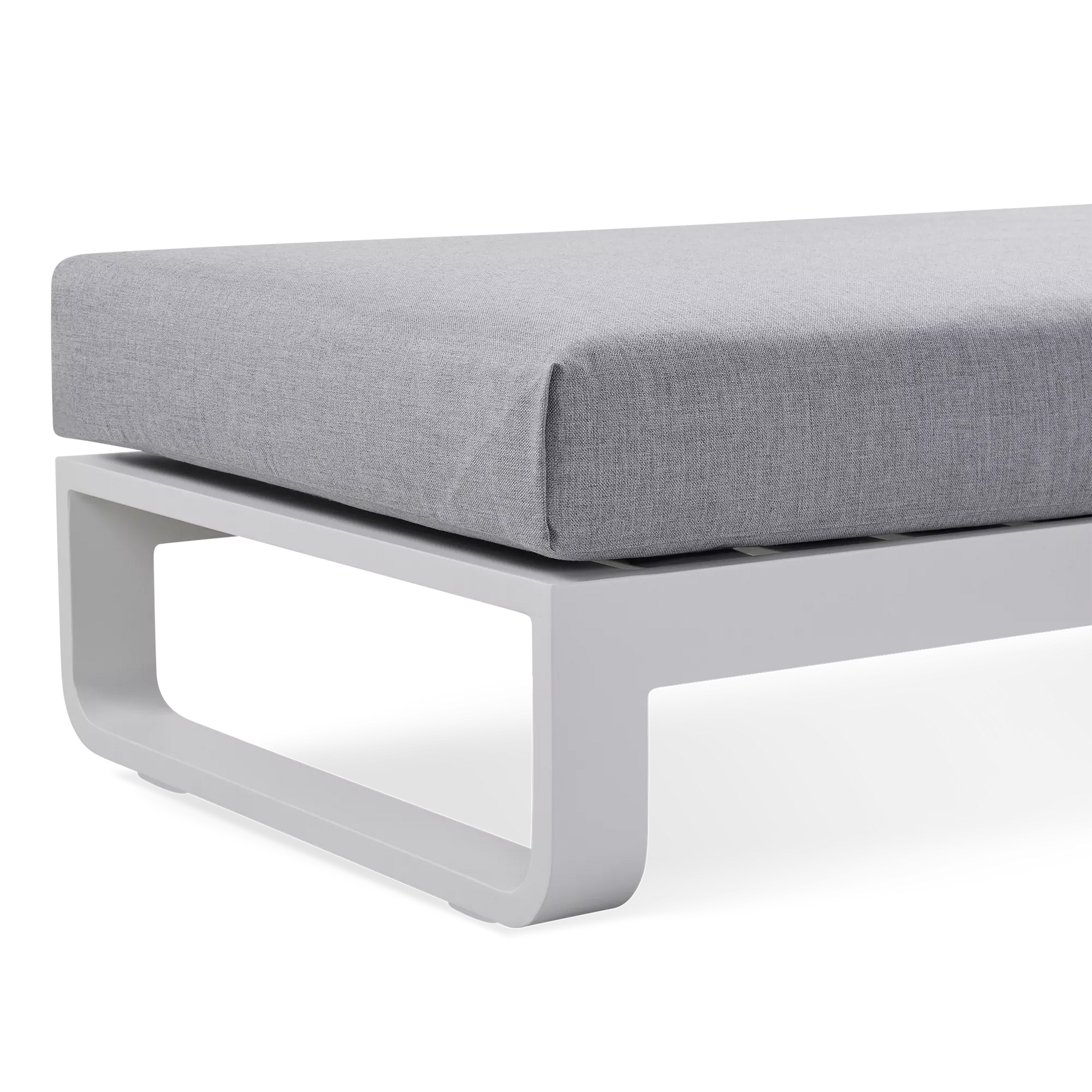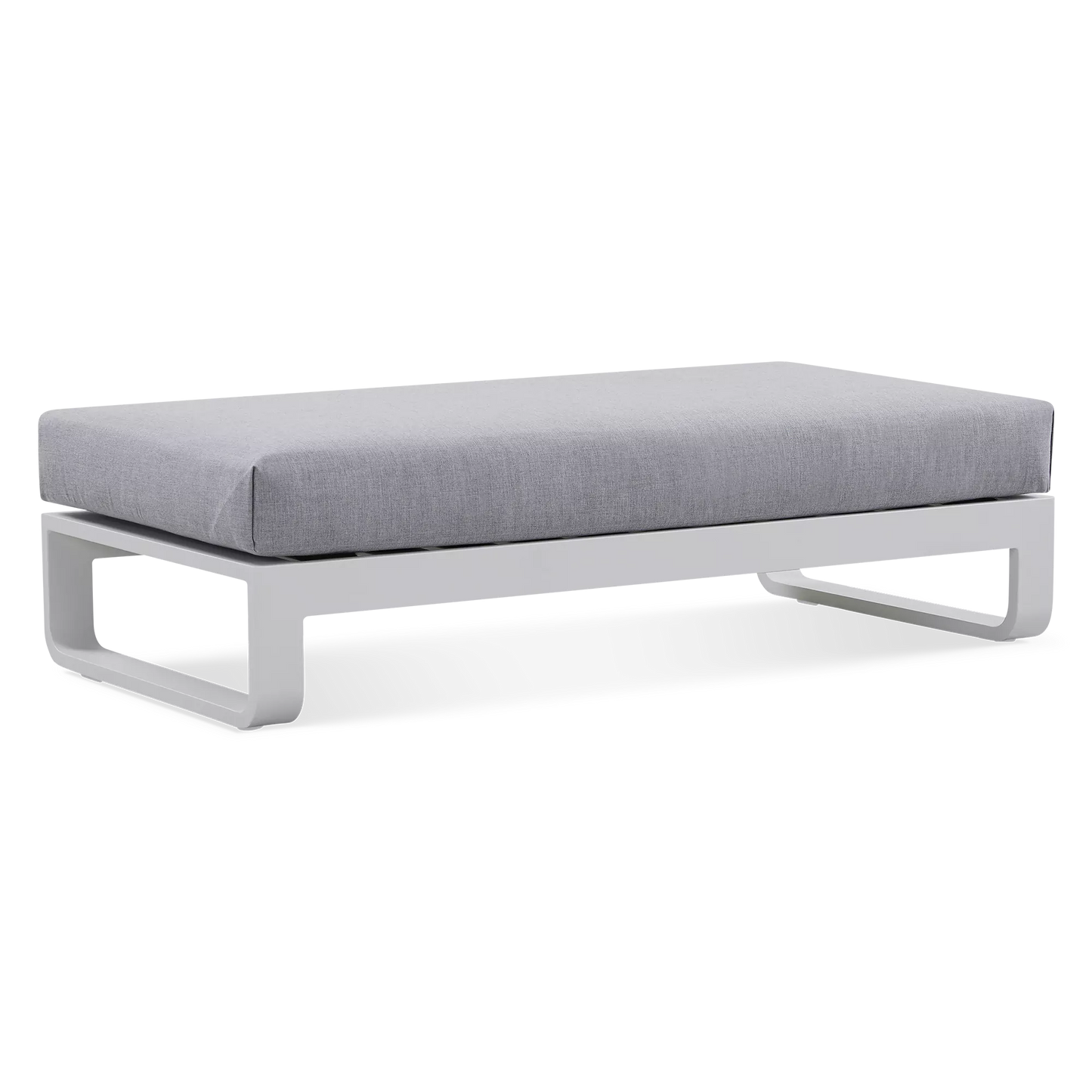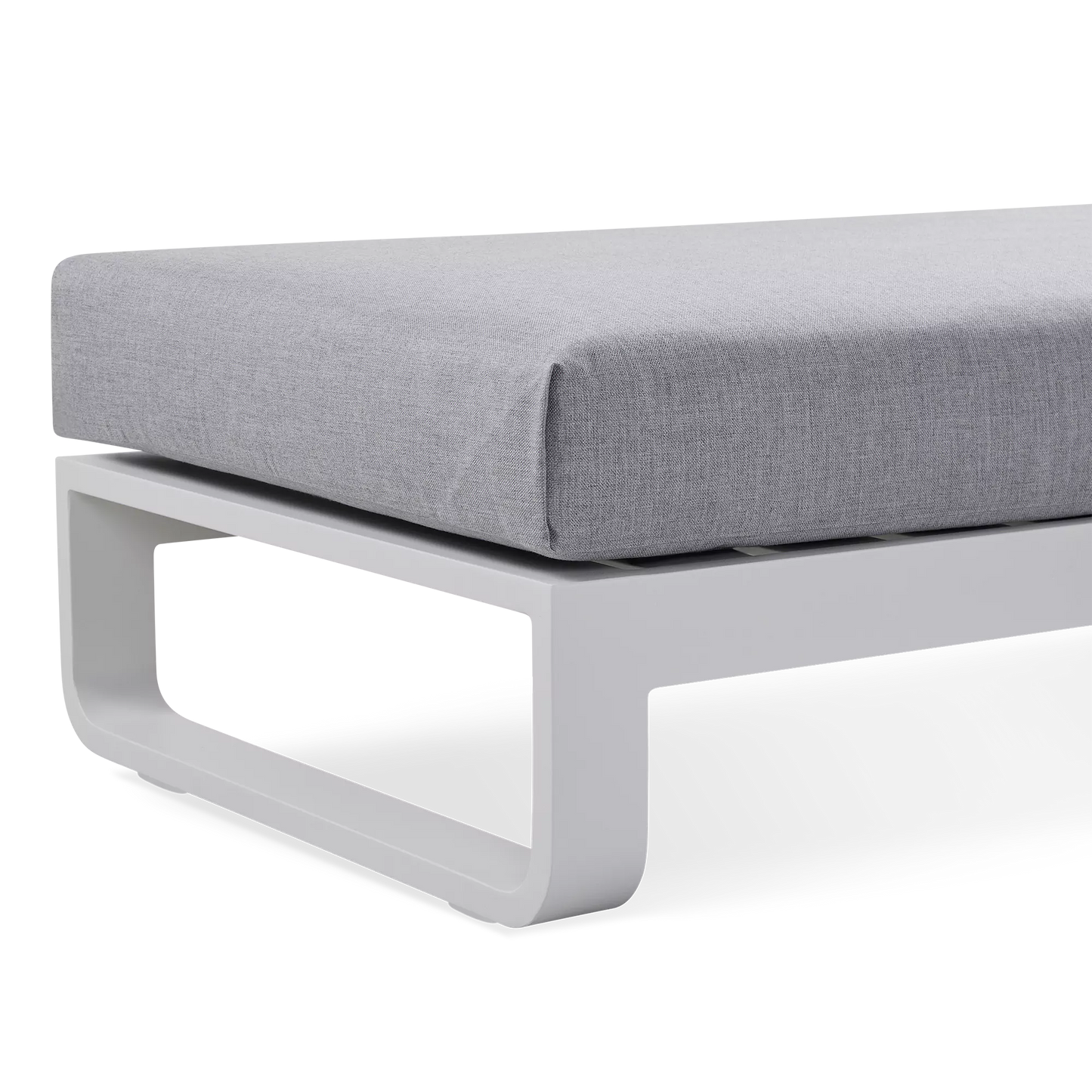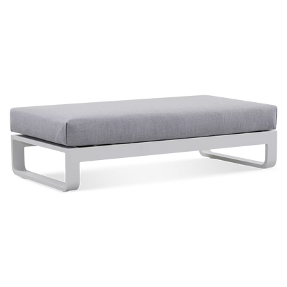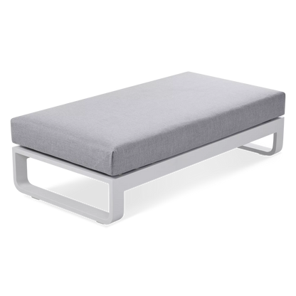 Élégance rime souvent avec simplicité et Outfit l’a bien compris. Un coussin aux lignes droites posé sur une base en aluminium, qui vient arrondir les angles, suffit à ce repose-pieds pour se distinguer. Détail pratique : des attaches permettent de maintenir le coussin bien en place. À personnaliser avec les multiples coloris du tissu Sunbrella, conçu pour déjouer tous les caprices météo. Accompagne sa version fauteuil, causeuse et modulaire.