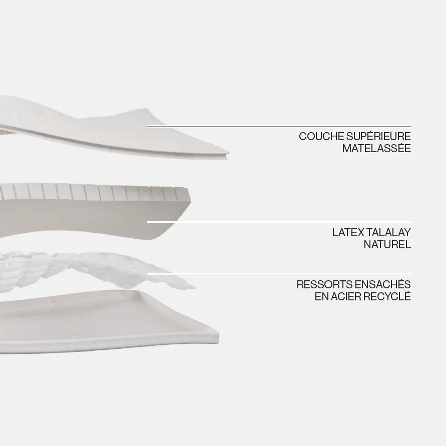 Conçu pour tous les types de dormeurs, Peace soulage les tensions et procure un soutien optimal grâce à sa base en ressorts ensachés en acier recyclé qui offre un soutien dynamique qui s'ajuste aux zones de pression, assurant une nuit de sommeil paisible et réparatrice.