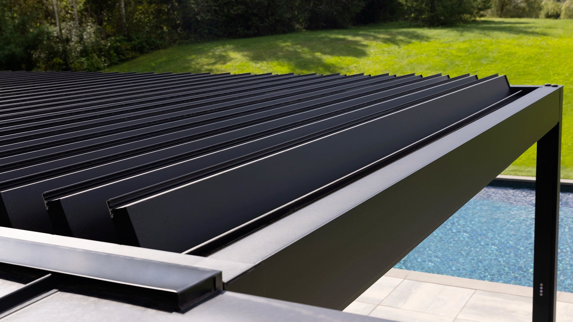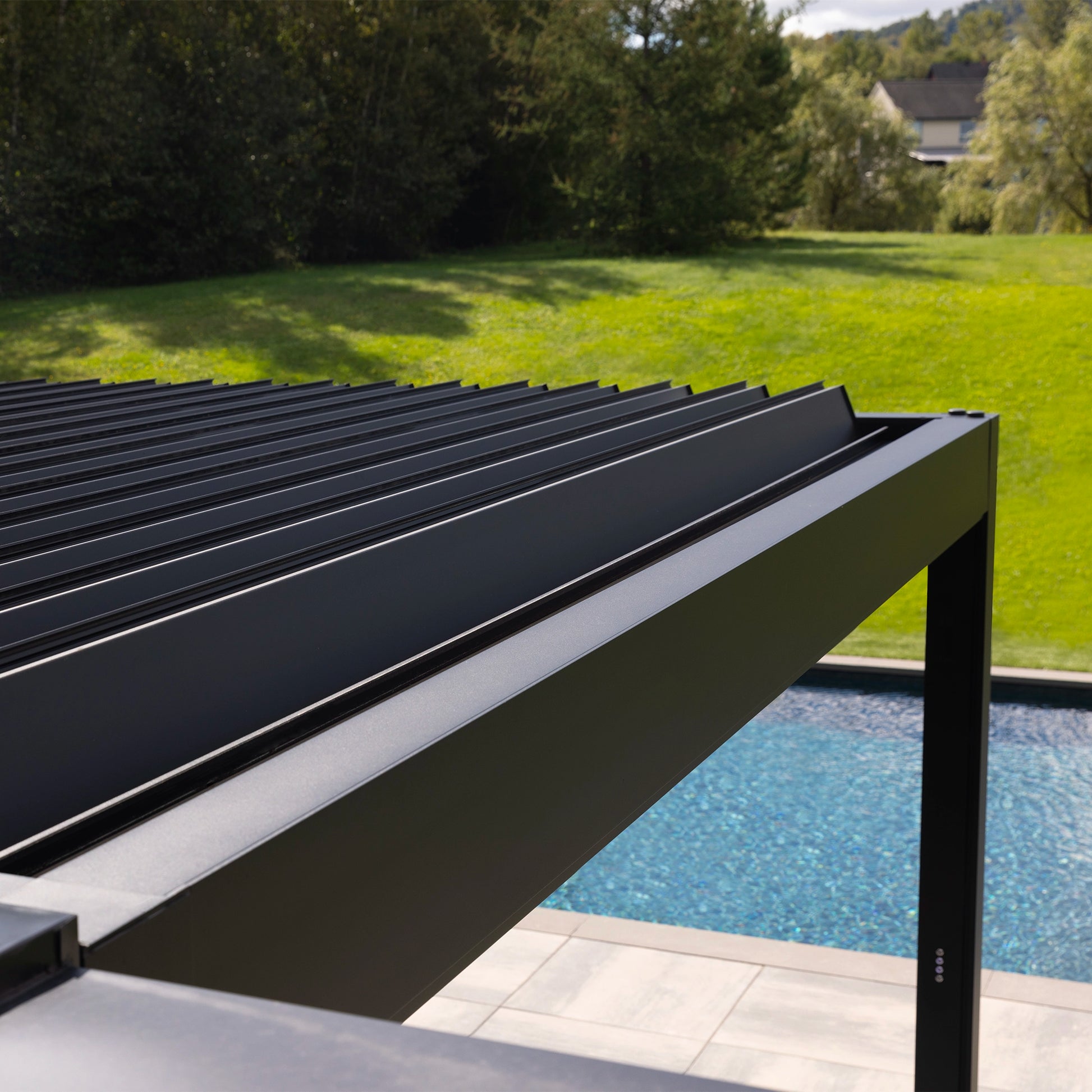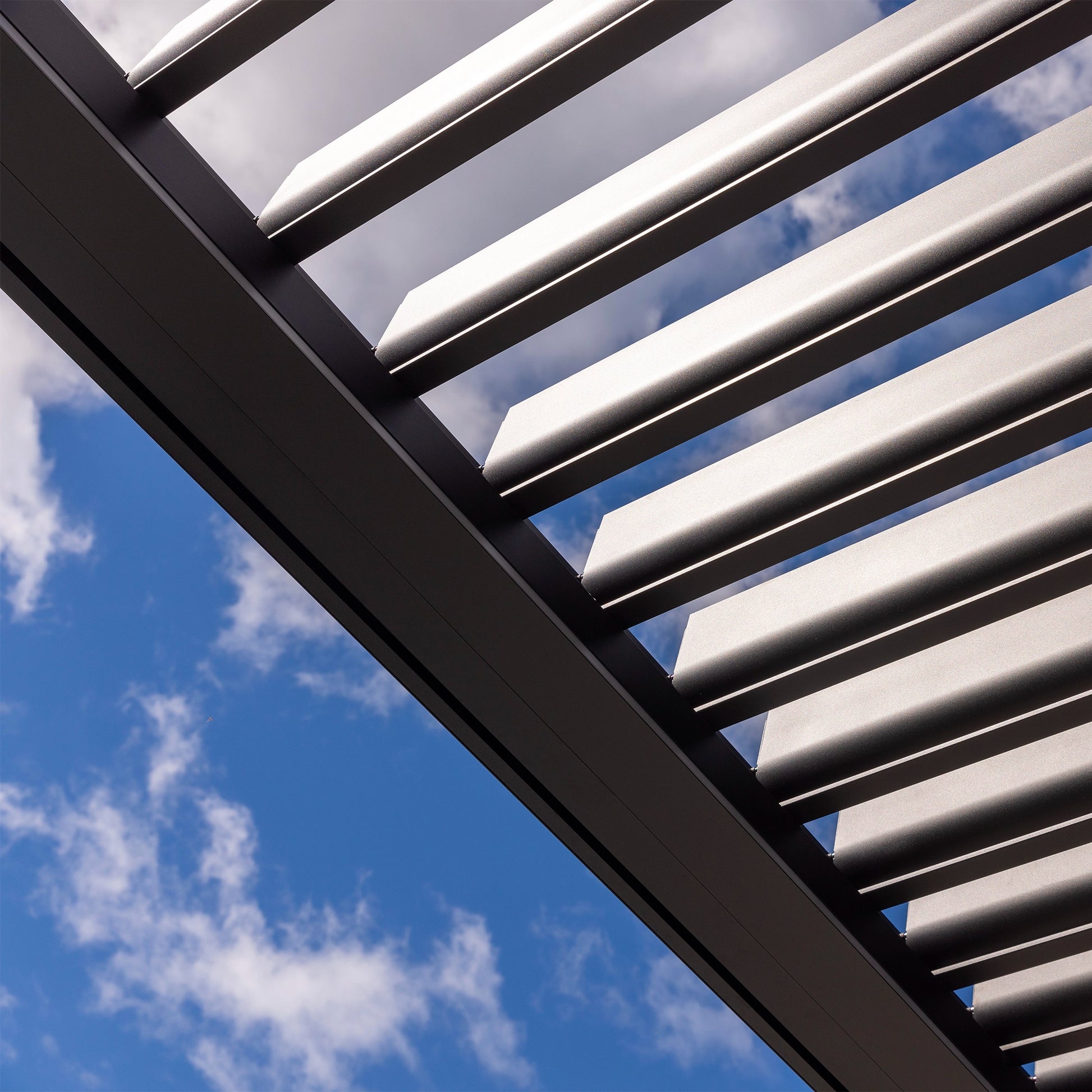 Profitez des rayons de soleil ou protégez-vous de la pluie grâce aux diverses inclinaisons des lames motorisées de la pergola Summer House.