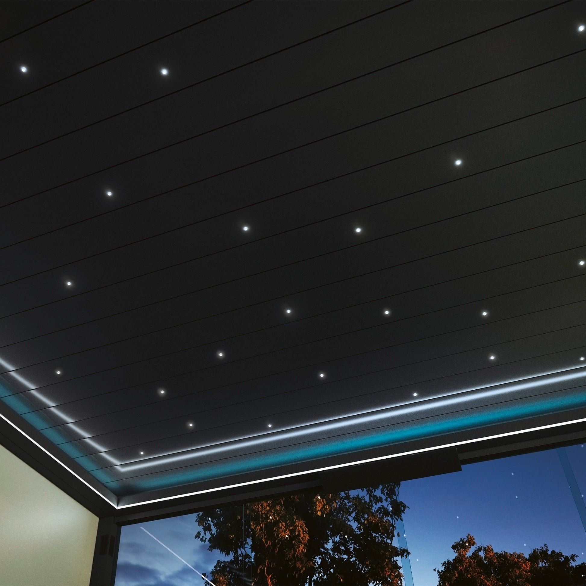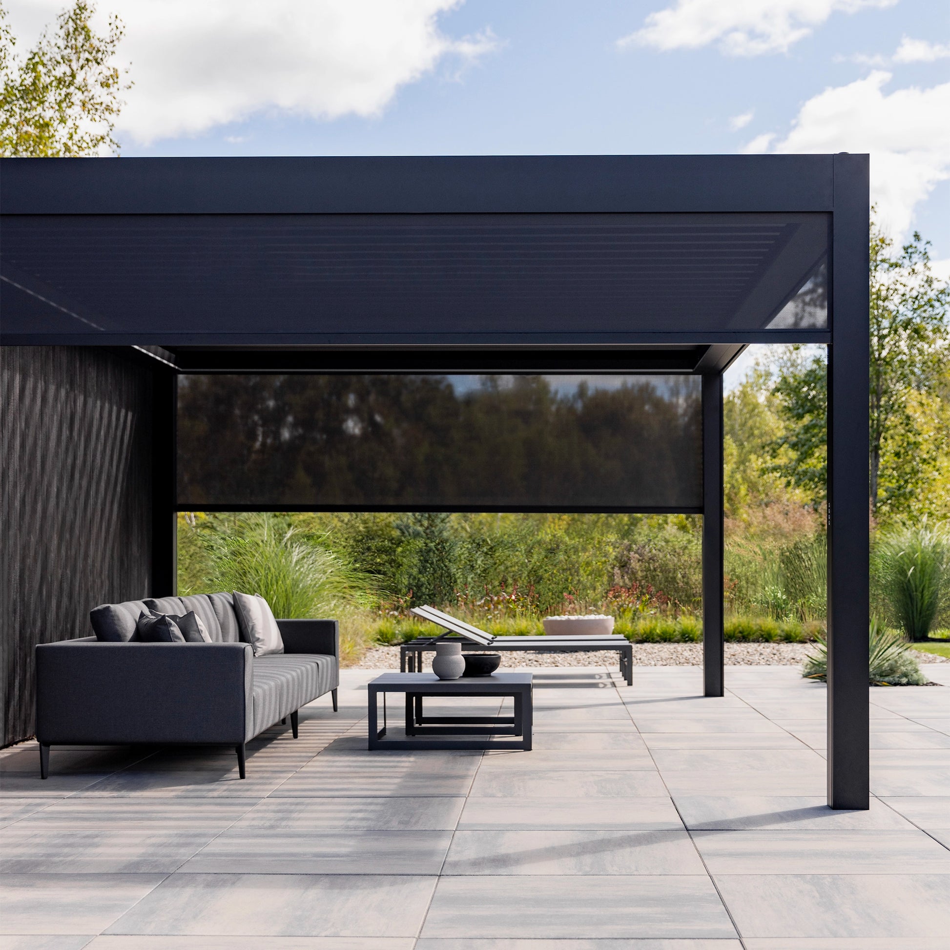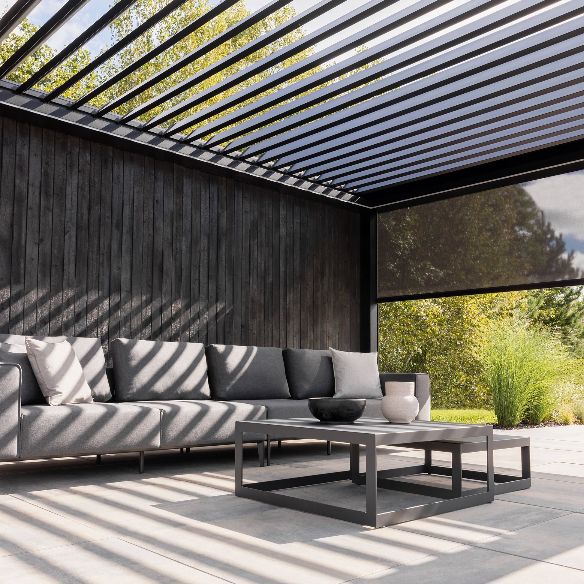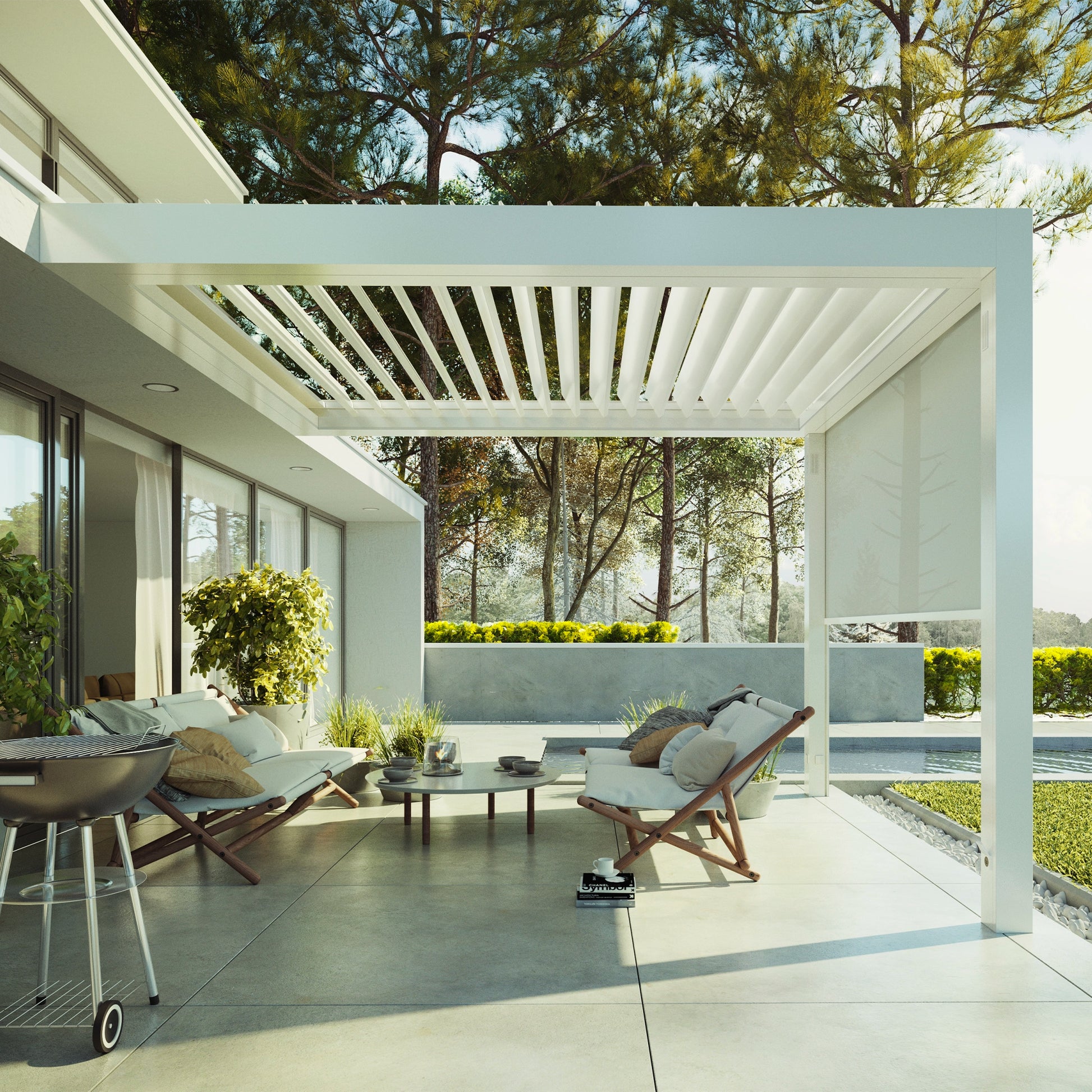 Profitez des rayons de soleil ou protégez-vous de la pluie grâce aux diverses inclinaisons des lames motorisées de la pergola Summer House.