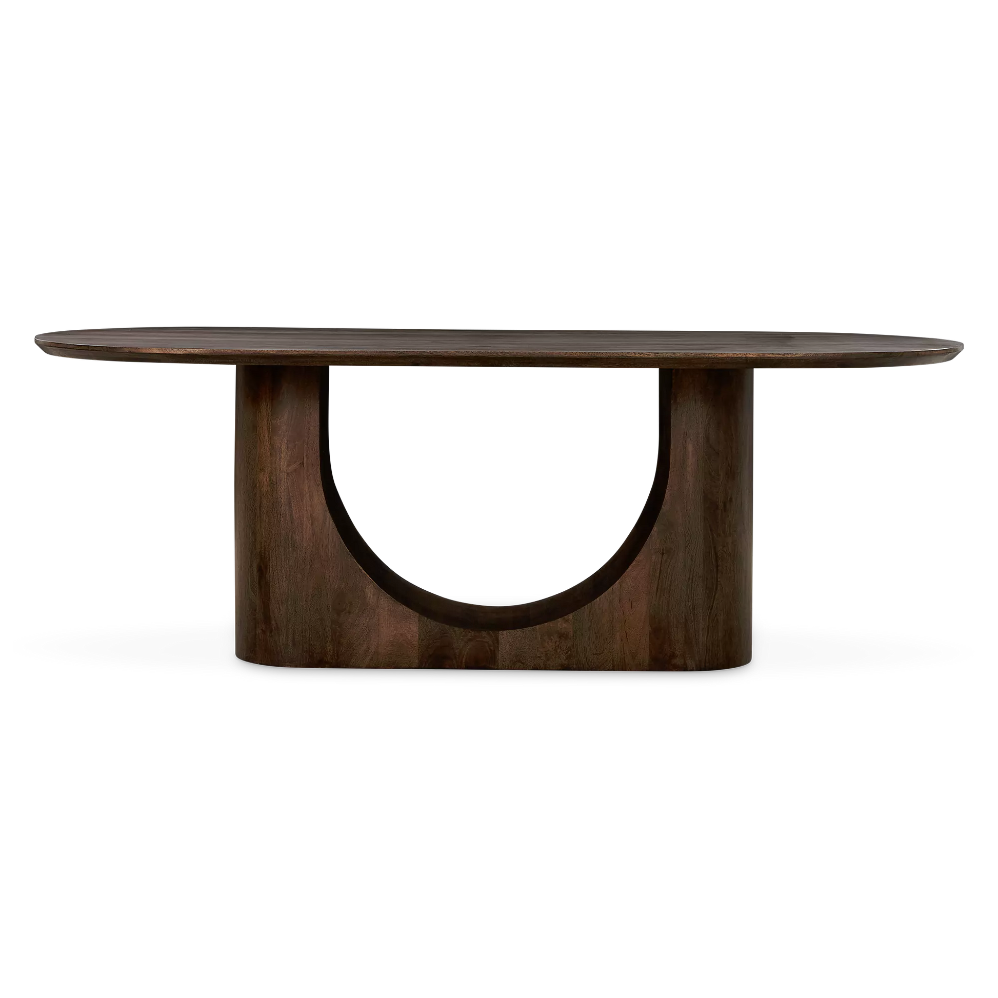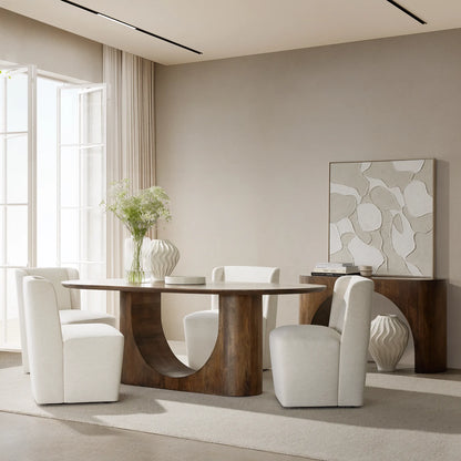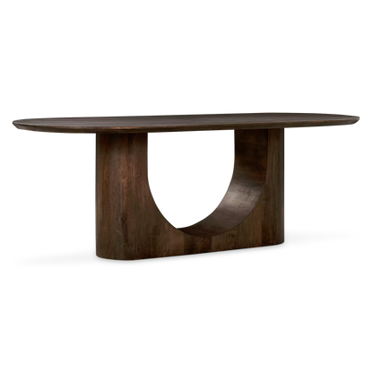 La table à manger Rhea allie des courbes douces à un effet architectural saisissant. Fabriquée en bois de manguier, elle se distingue par son piètement sculpté en forme d'arc qui lui confère une allure à la fois aérienne et structurée. Avec sa finition aux tons chauds et naturels, elle apportera une touche de sophistication organique à toute salle à manger contemporaine.