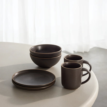 Assiette en grès durable avec émail réactif brun profond, au design épuré et aux courbes affirmées. Intemporelle et résistante, elle s’utilise au quotidien et passe au micro-ondes et au lave-vaisselle. Chaque pièce présente des variations uniques de couleur et de motif, caractéristiques de l’émail réactif.
