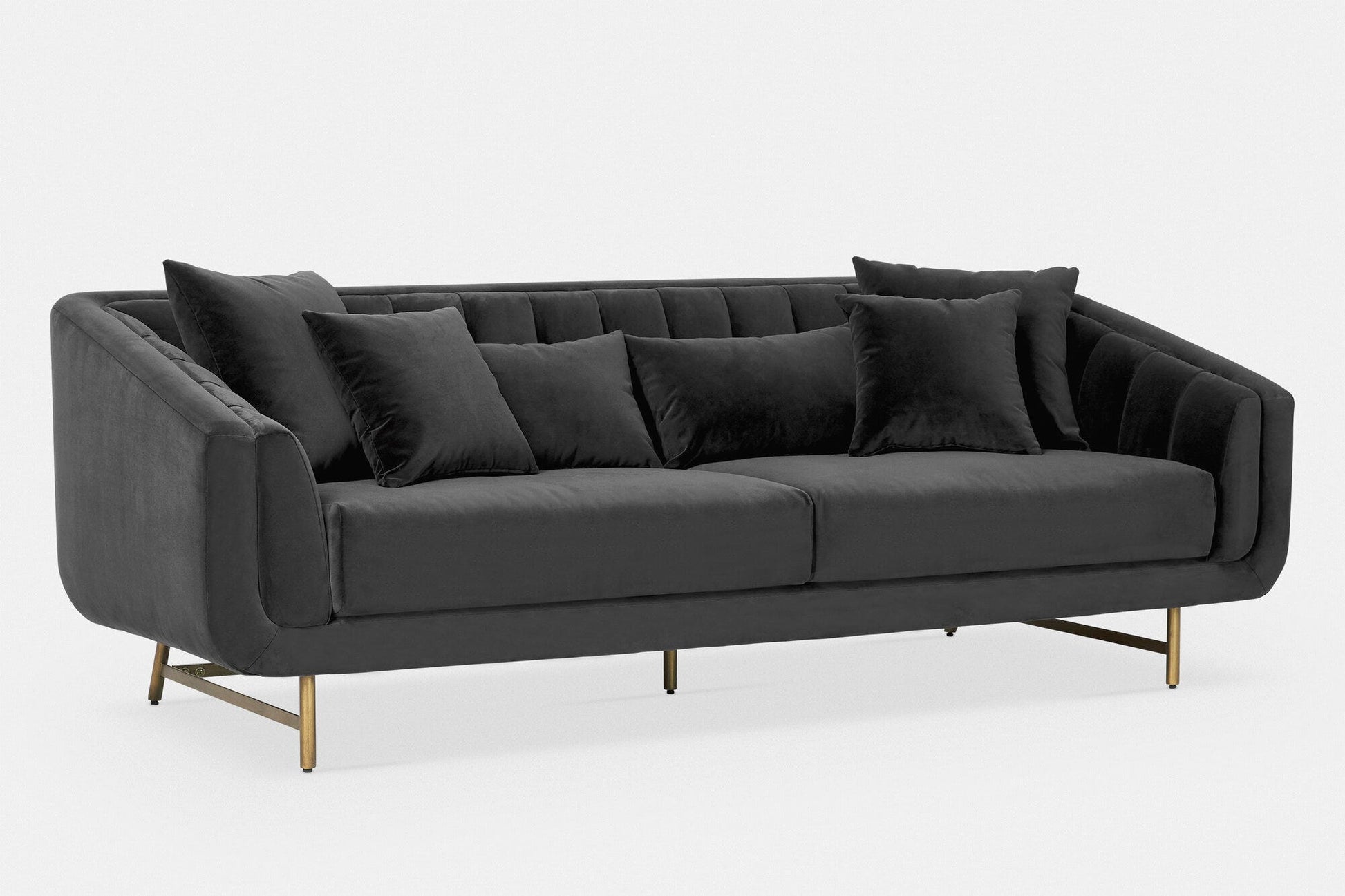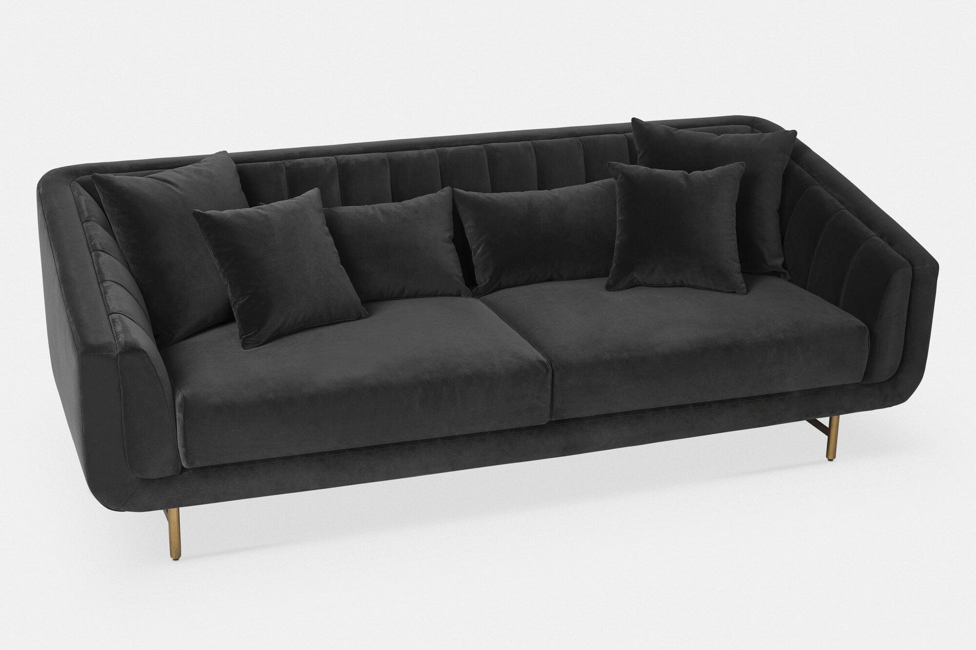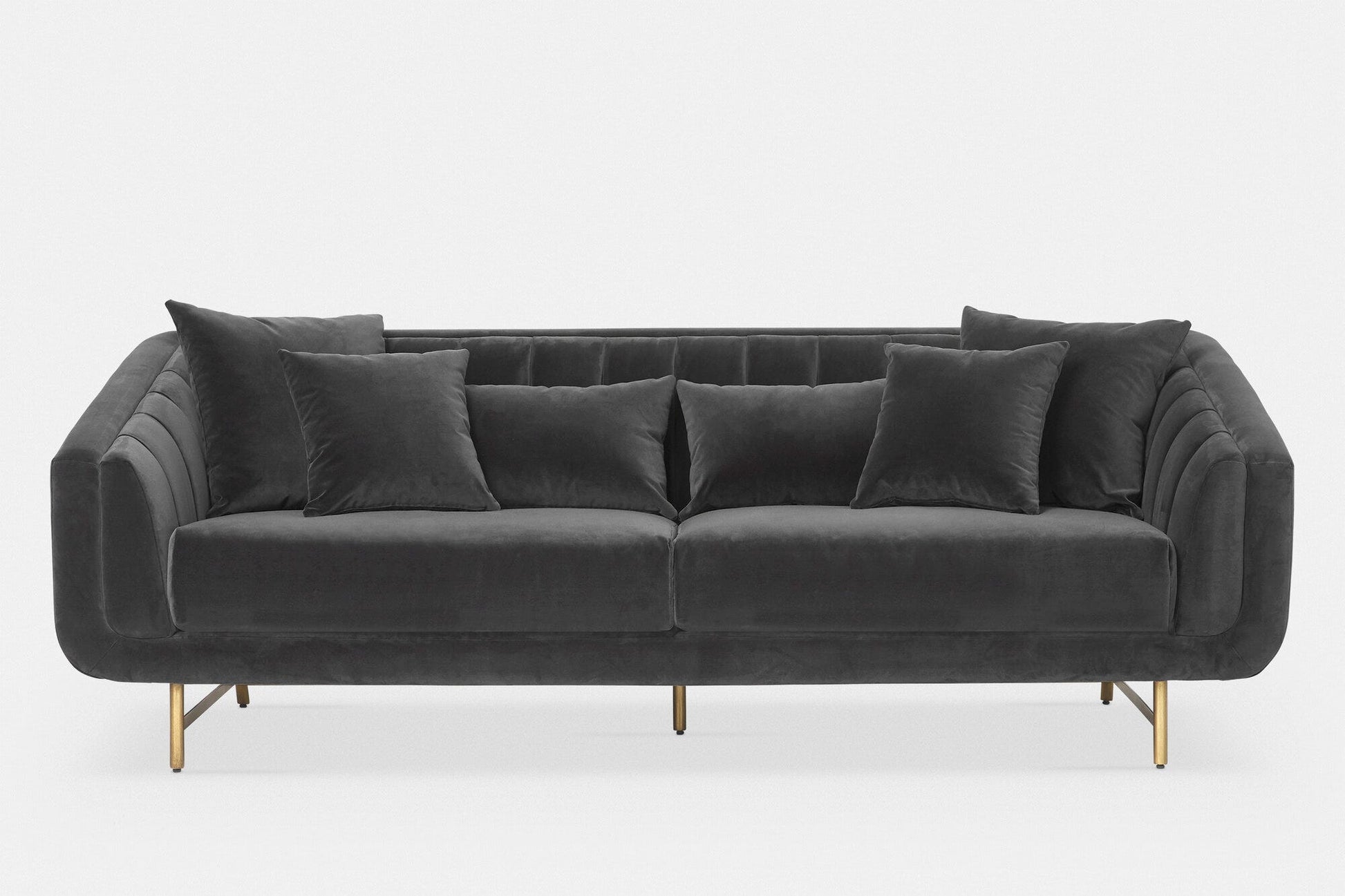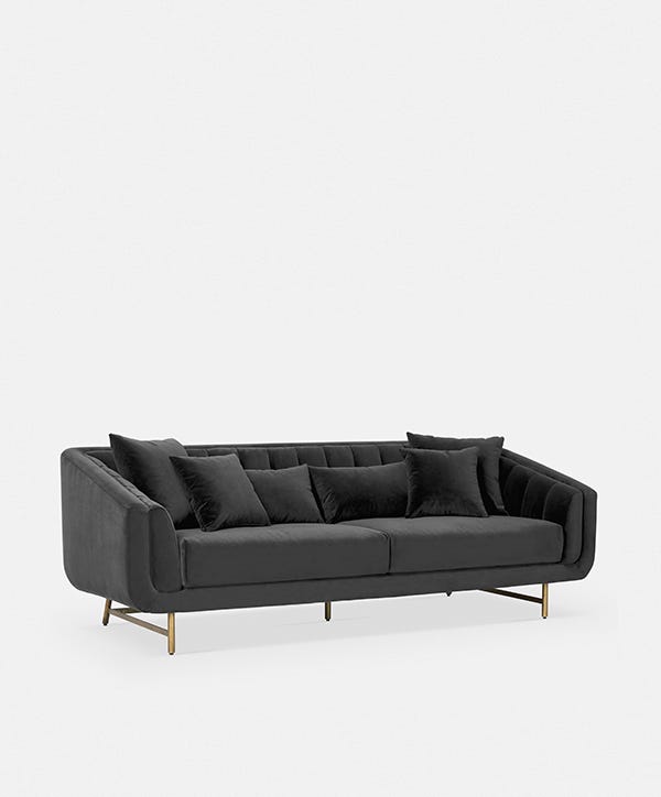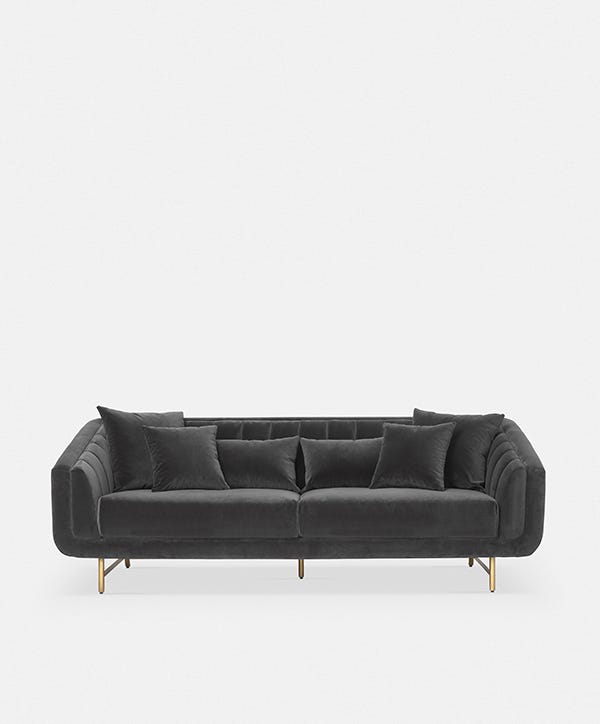 Perché sur un piètement en laiton, le canapé Veera dévoile une silhouette à l’élégance rétro, ennoblie par les surpiqures à canaux qui garnissent son dossier. Son assise ample est agrémentée de six coussins décoratifs.