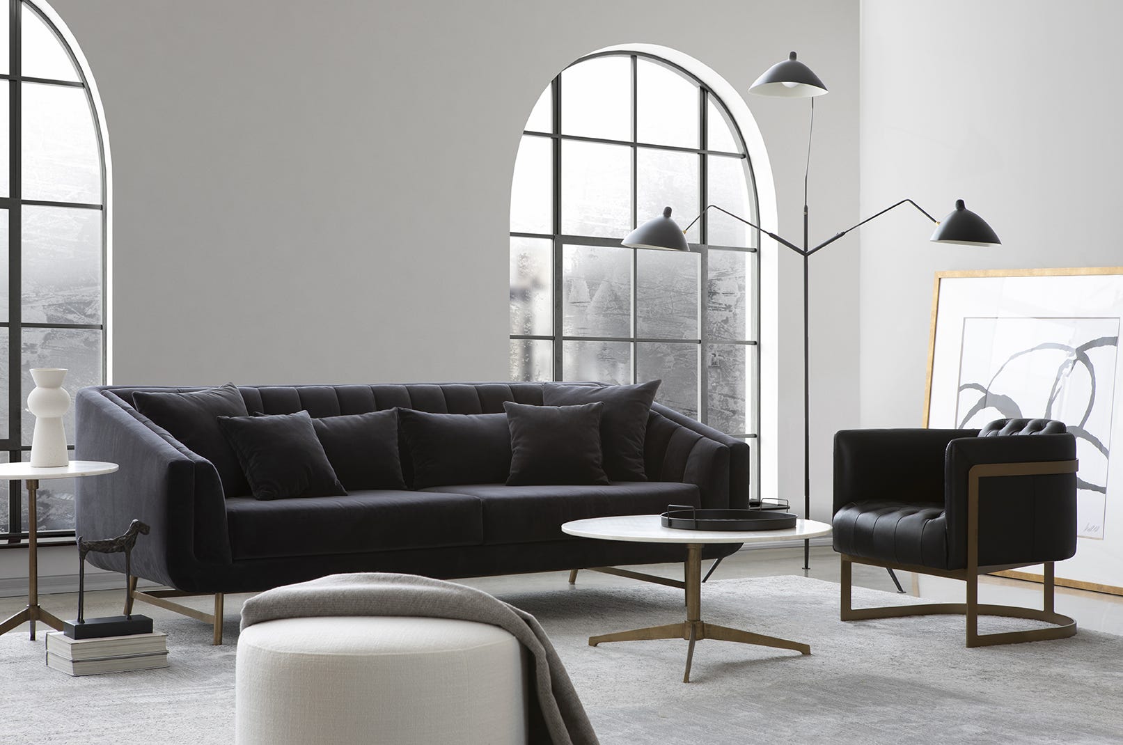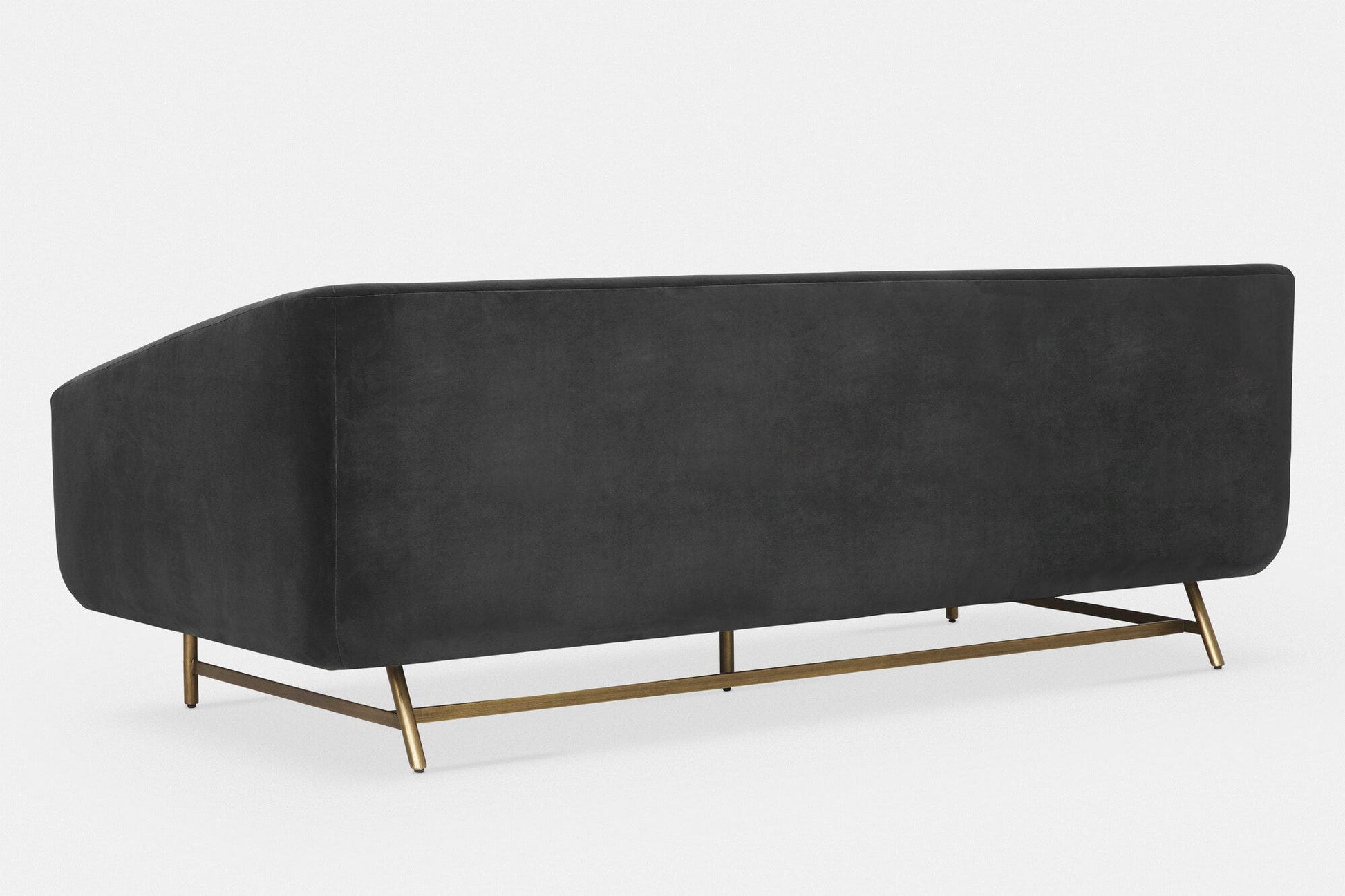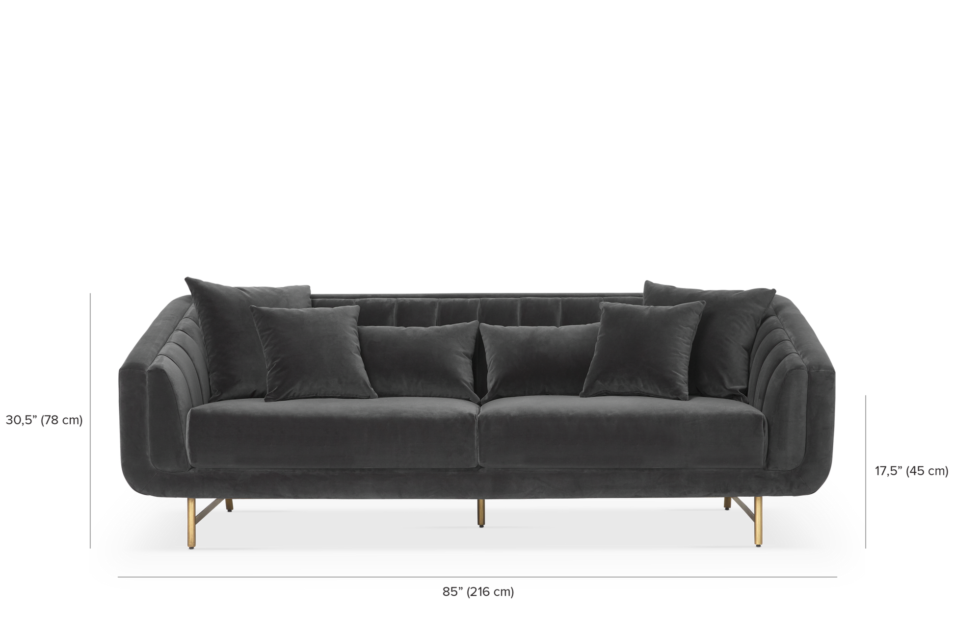 Perché sur un piètement en laiton, le canapé Veera dévoile une silhouette à l’élégance rétro, ennoblie par les surpiqures à canaux qui garnissent son dossier. Son assise ample est agrémentée de six coussins décoratifs.