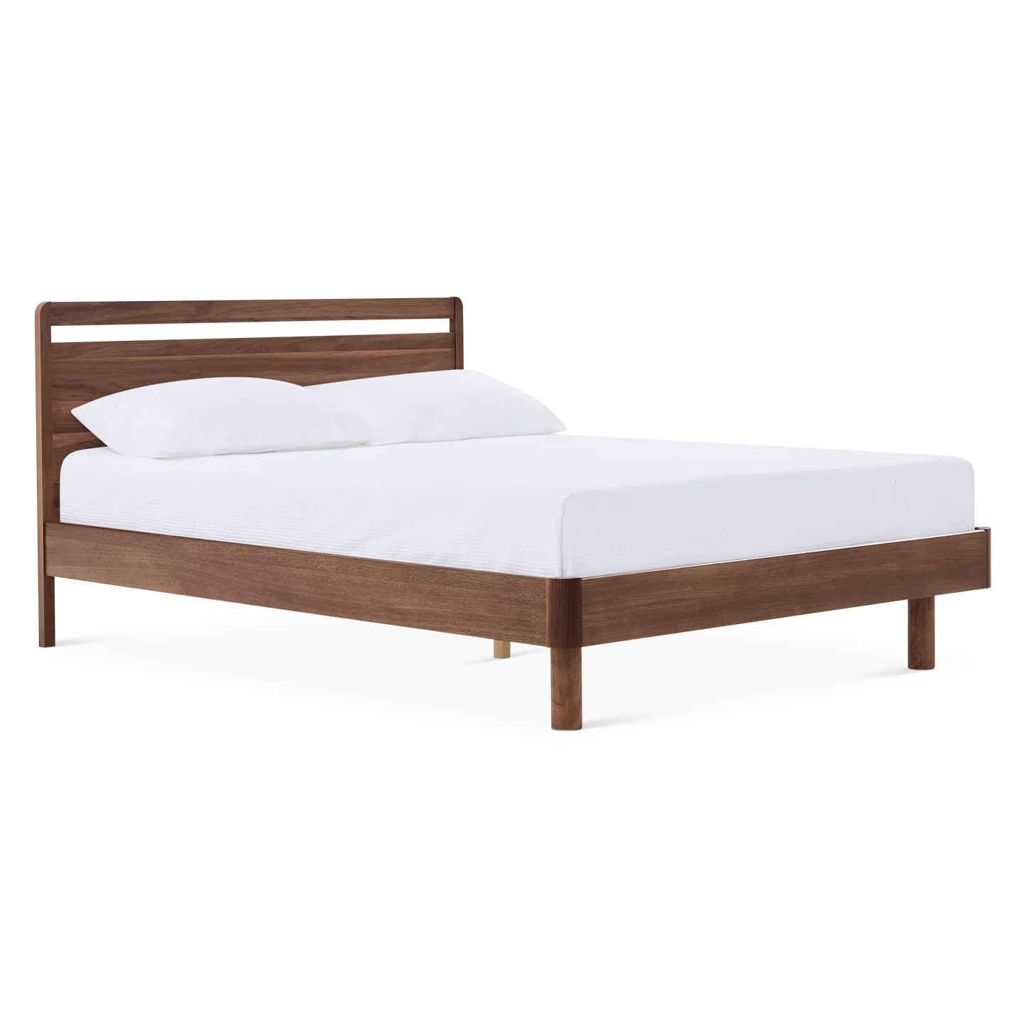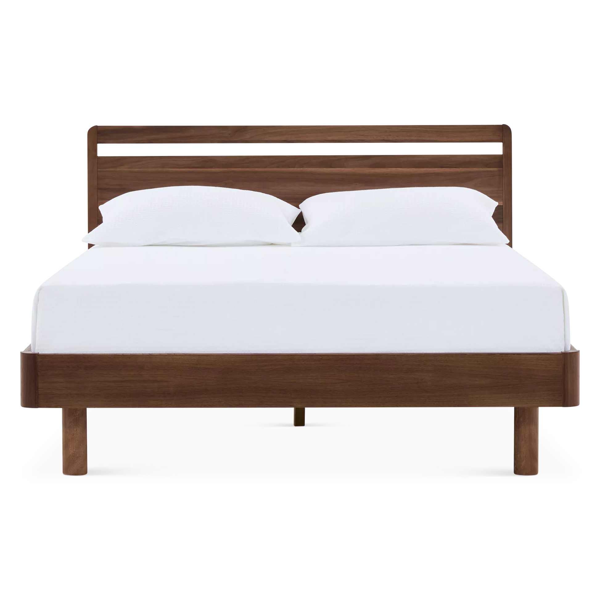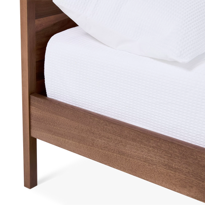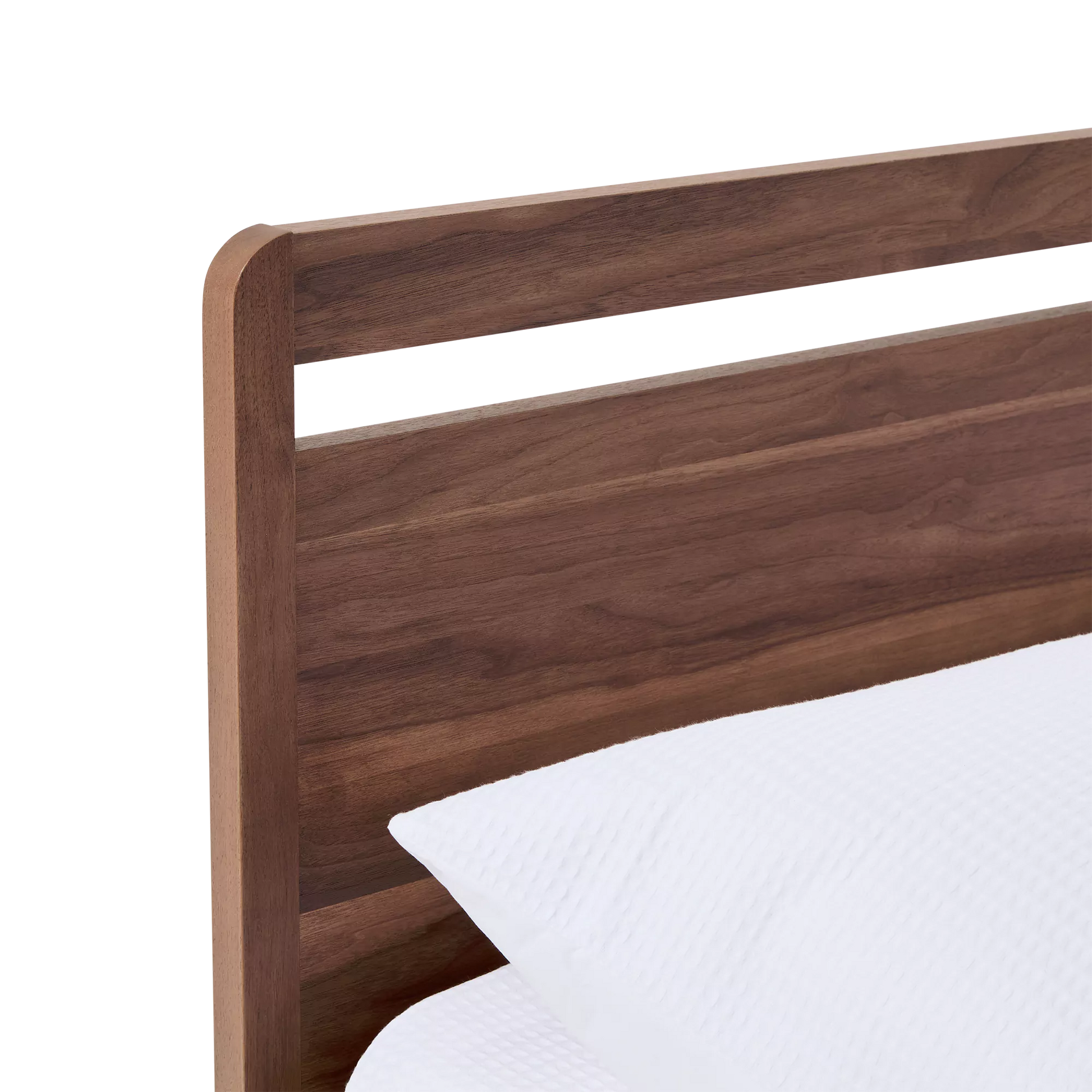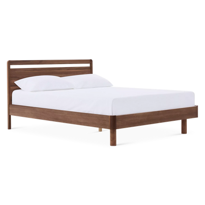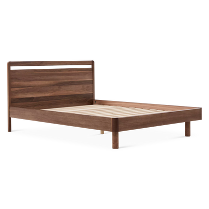 Fabriqué en noyer fumé, le lit Vista met en valeur un équilibre entre simplicité et design raffiné, caractéristique de Mobican. Son cadre aux lignes épurées et sa tête de lit aux angles subtilement arrondis soulignent la beauté naturelle du bois, dont les riches variations de tons réchauffent la pièce. De discrètes courbes adoucissent la silhouette, conférant à ce meuble une élégance moderne qui s'harmonise aussi bien avec les espaces minimalistes que contemporains.