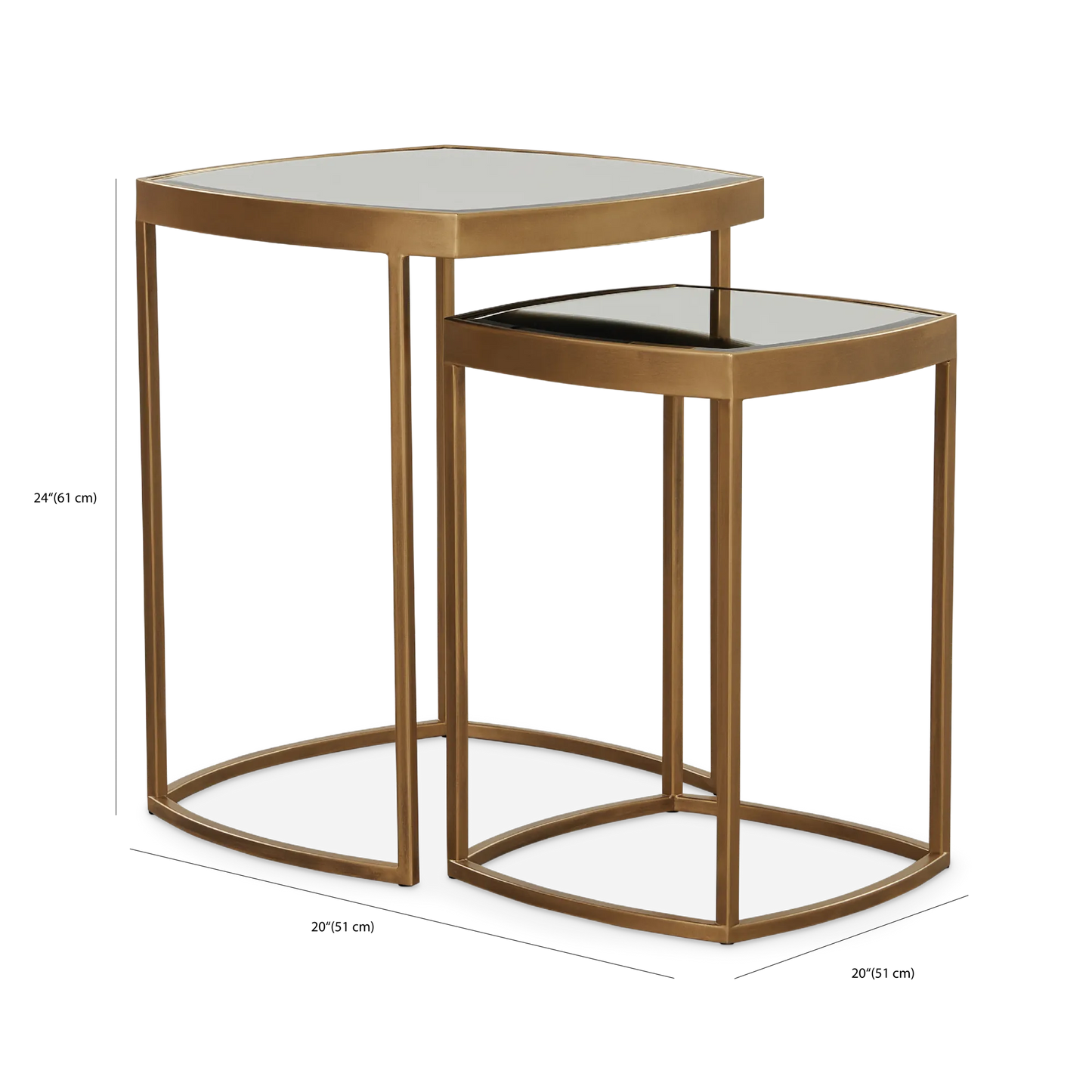 Les tables gigognes Vista allient une structure audacieuse à des détails raffinés. Elles se caractérisent par un cadre robuste en couleur or antique incrusté d'un plateau miroir biseauté, offrant une surface brillante qui reflète la lumière. Conçues avec des lignes légèrement incurvées, ces deux tables polyvalentes peuvent être utilisées ensemble ou séparément. À la fois fonctionnelles et élégantes, elles s'adaptent à merveille aux intérieurs modernes et classiques.