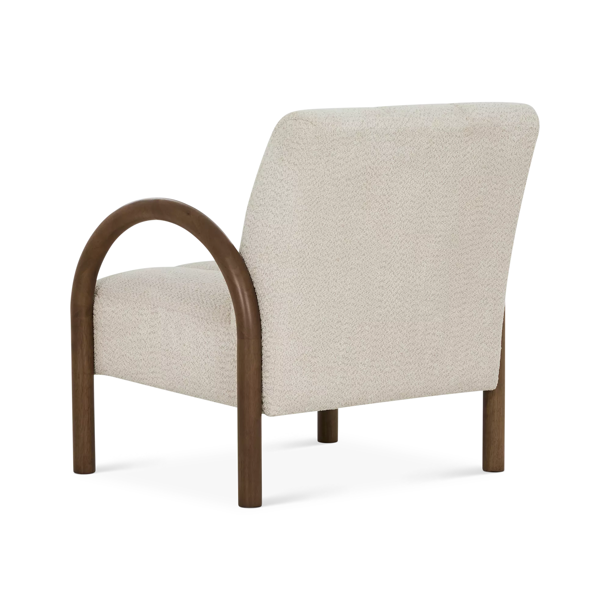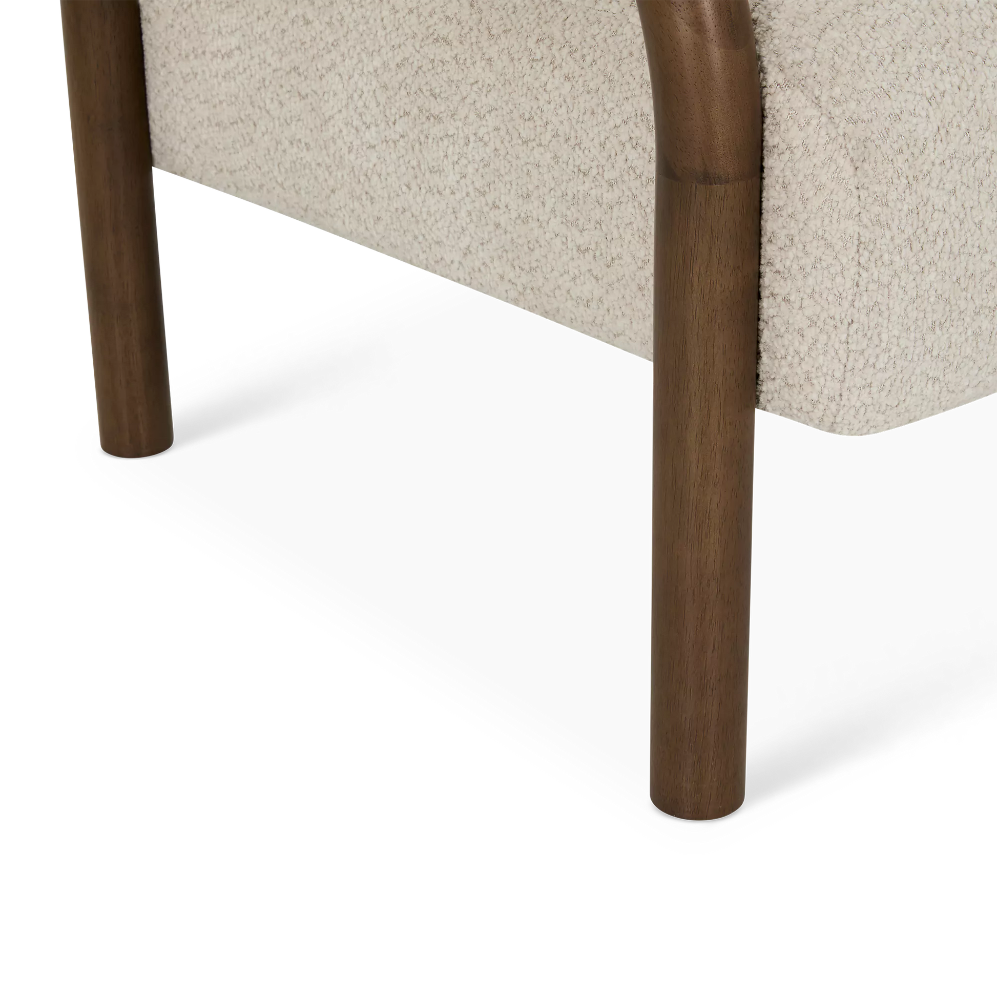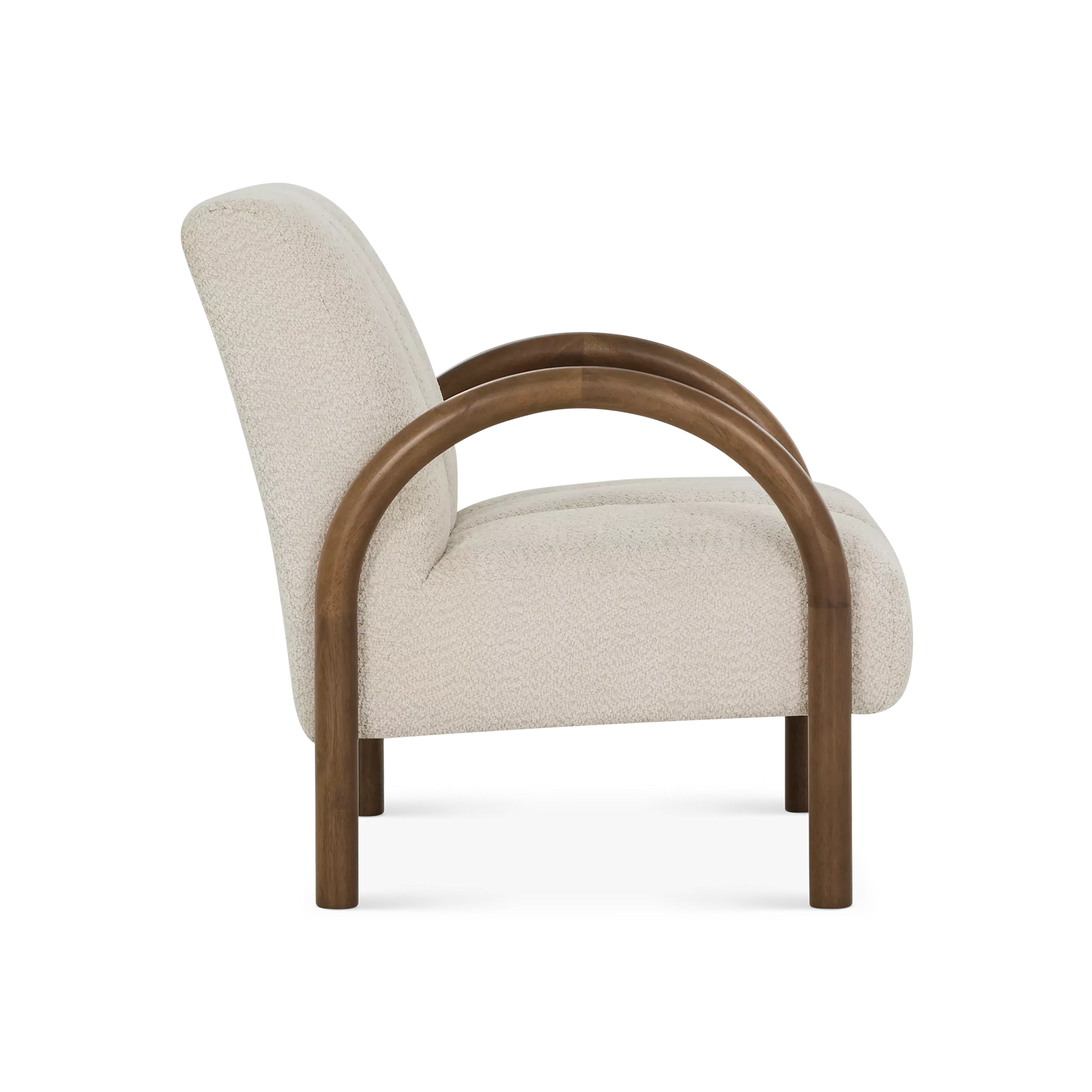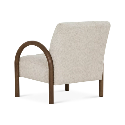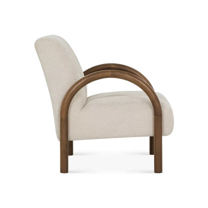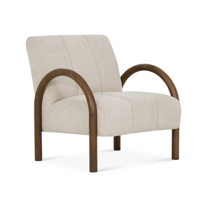 Le fauteuil Wiseman invite à la détente avec son tissu bouclé beige doux et ses bras en bois sculpté brun chocolat. Ses coutures délicates apportent une touche raffinée, tandis que son style contemporain s’intègre facilement dans un salon ou un coin lecture.