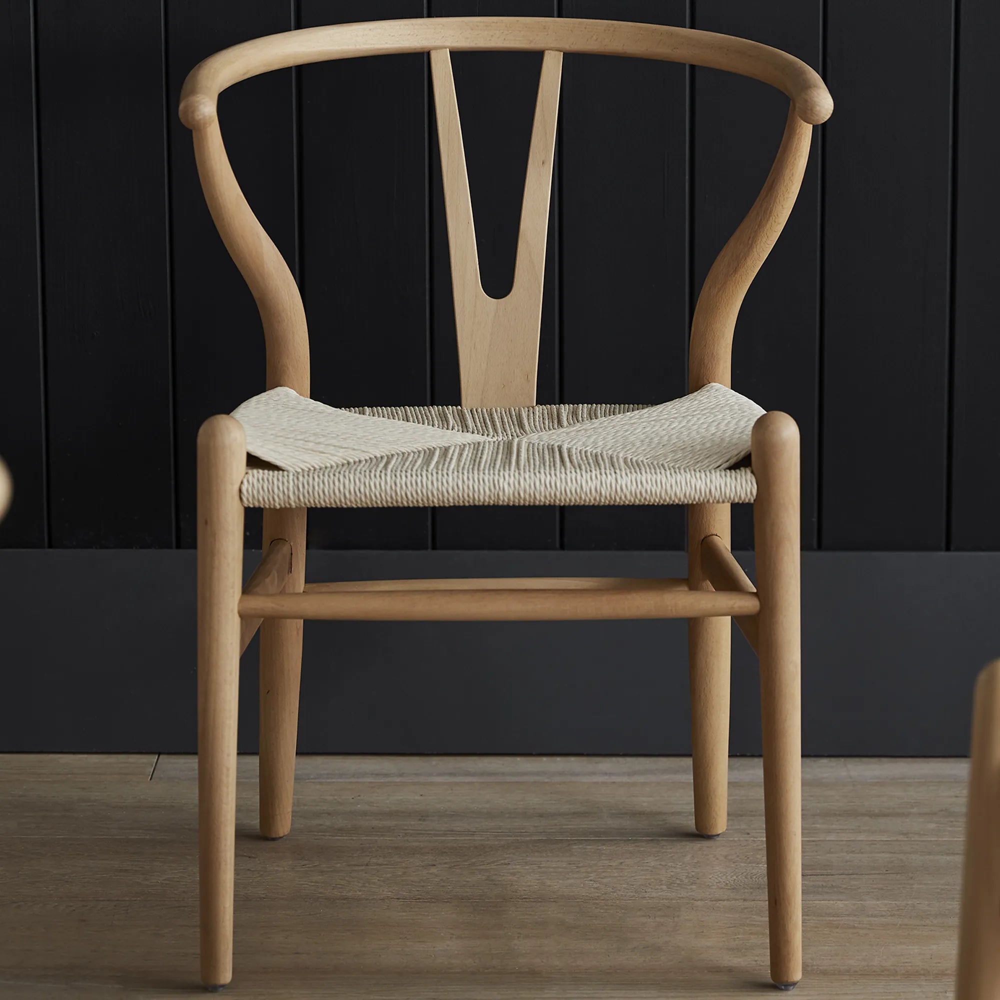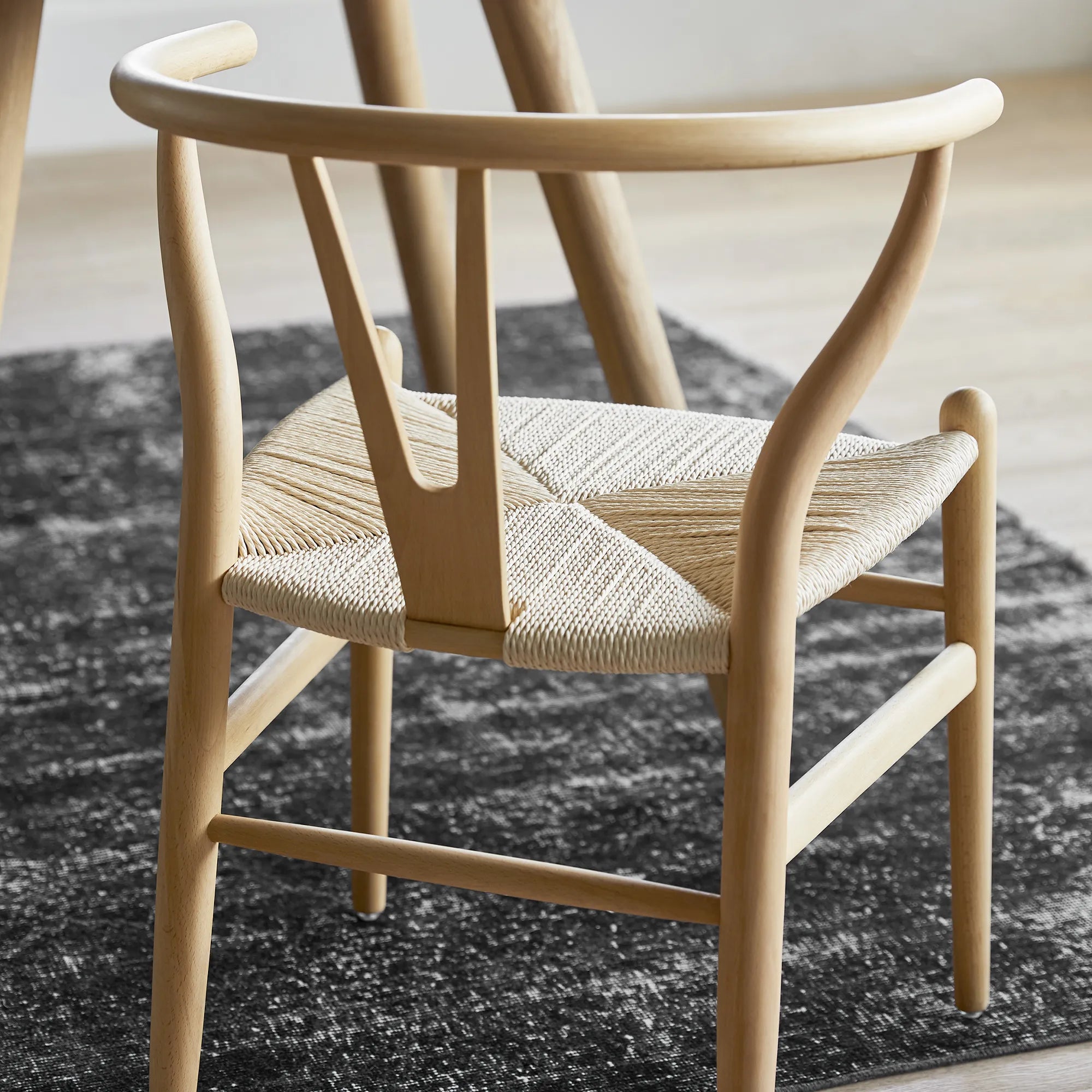 Design : Silhouette intemporelle d’inspiration scandinave, fabriquée en bois de hêtre avec des courbes organiques et un dossier en forme de Y emblématique, symbole d’équilibre et de caractère.