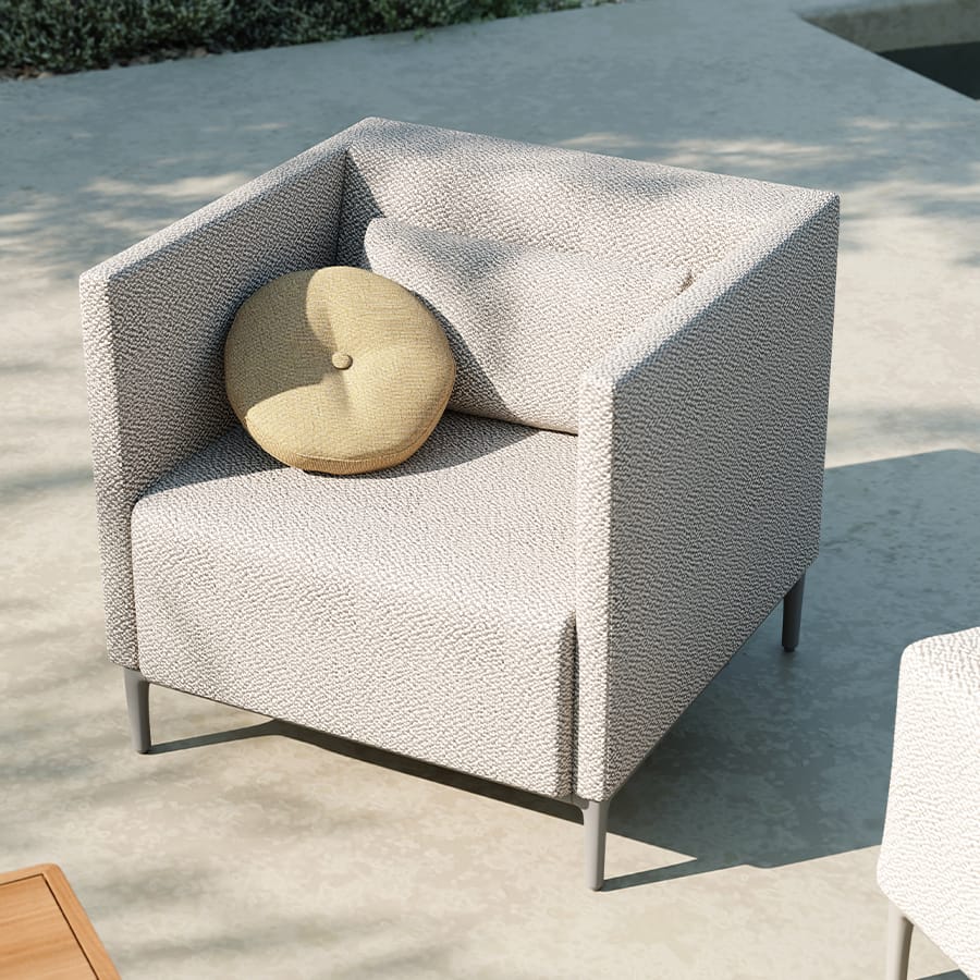 Aussi raffiné qu’un modèle d’intérieur, ce fauteuil club signé Stephane de Winter cumule les bons points : cadre en aluminium aux pieds effilés, assise généreuse au dossier enveloppant et légèrement incliné pour plus de confort, le tout revêtu d’un nouveau tissu texturé ultrachic, conçu pour la vie au grand air. À combiner avec le canapé club et le repose-pieds de la même collection. Plusieurs choix de revêtement textile sur commande.