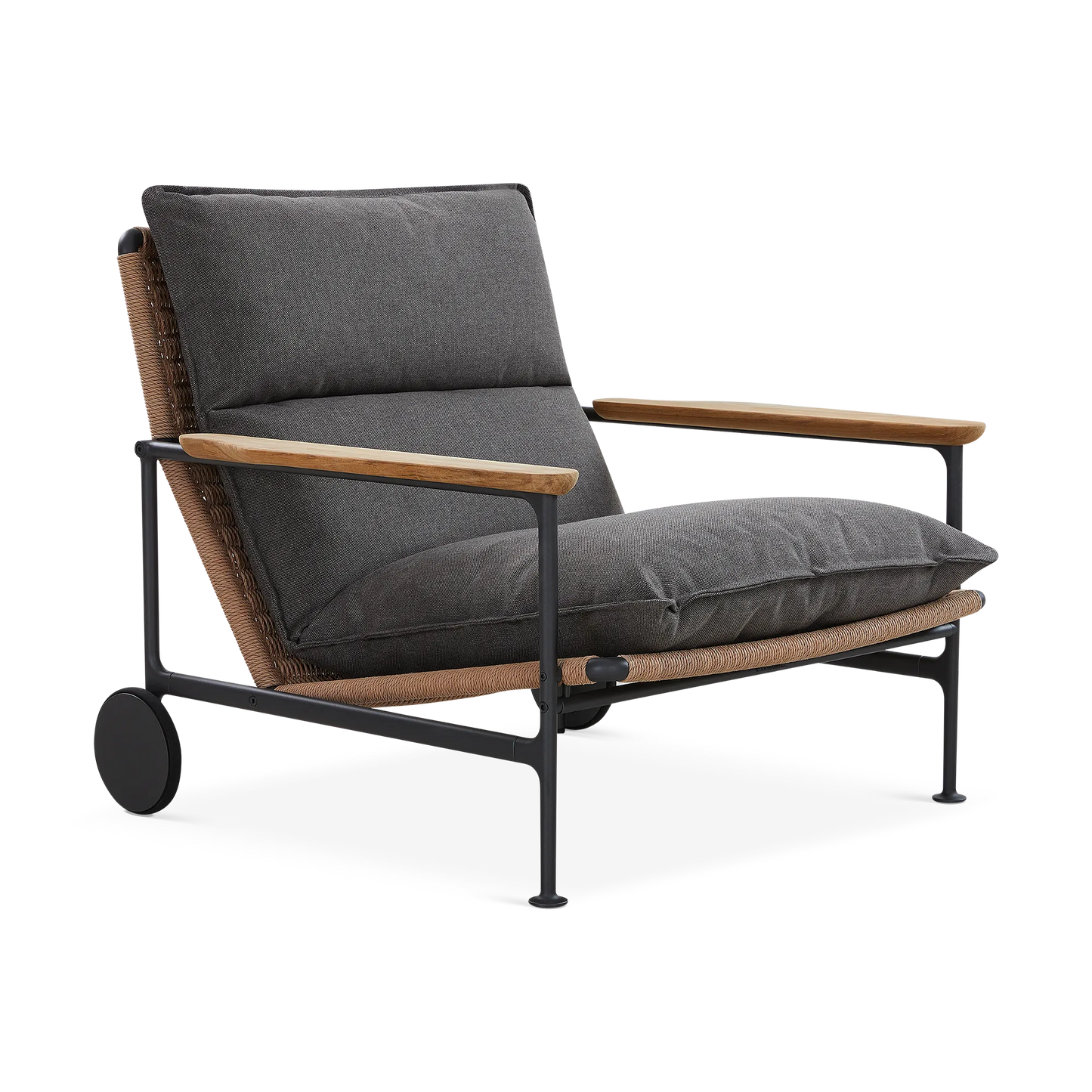 Designer danois passionné de mode, Henrik Pedersen signe Zenith, un fauteuil ultraconfo au look industriel. Le regard est attiré en premier par les roulettes arrière surdimensionnées, puis par le mélange de matières : cadre en aluminium, accoudoirs en teck, assise en fibre synthétique tressée (souplesse assurée!) et coussin moelleux revêtu de tissu Sunbrella. Éclectique, élégant et accueillant!