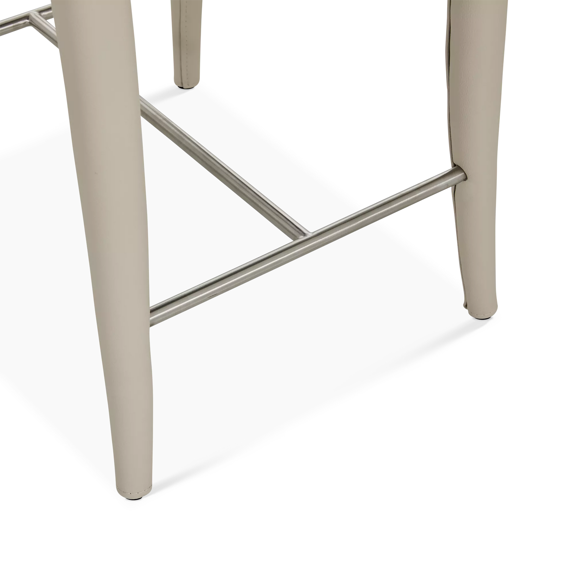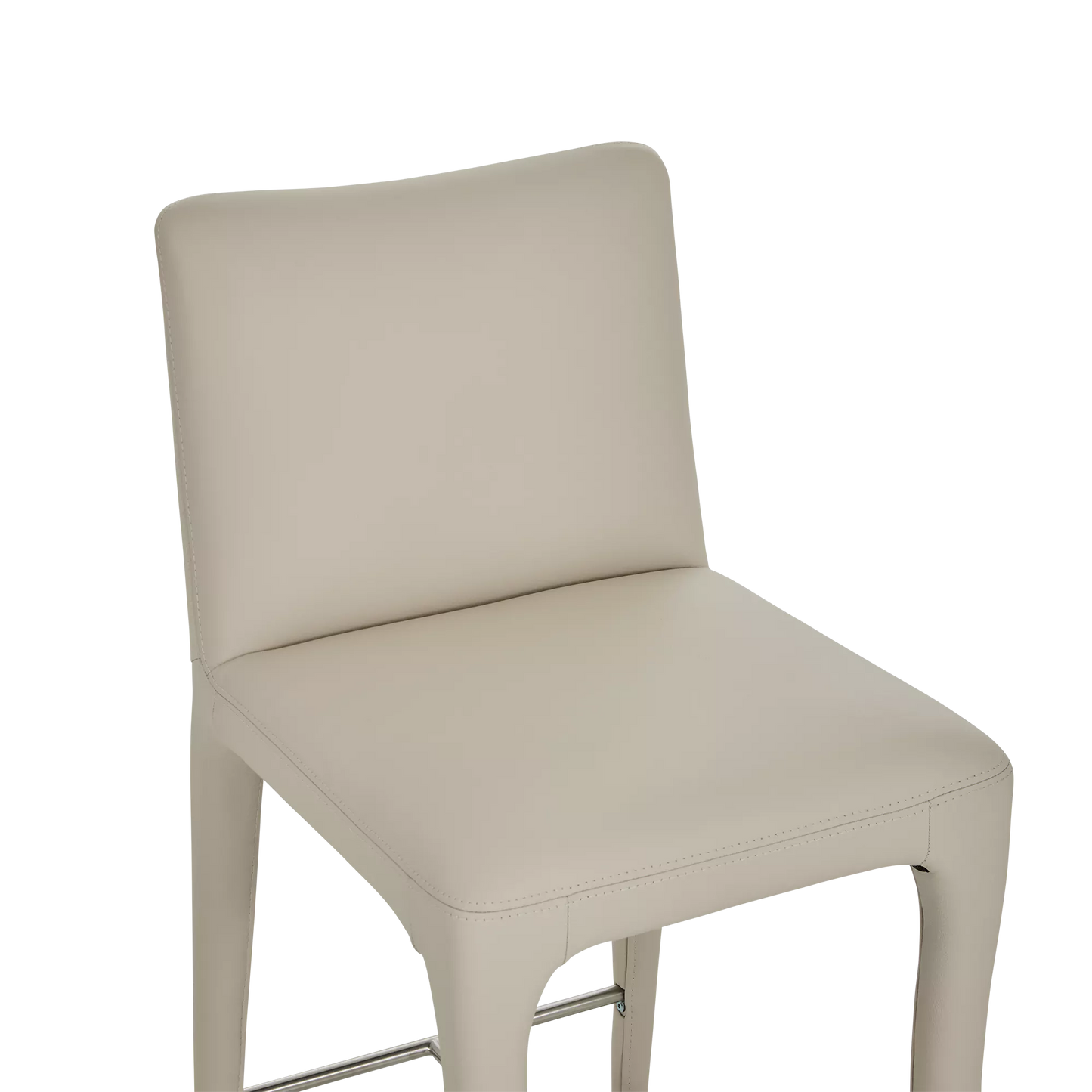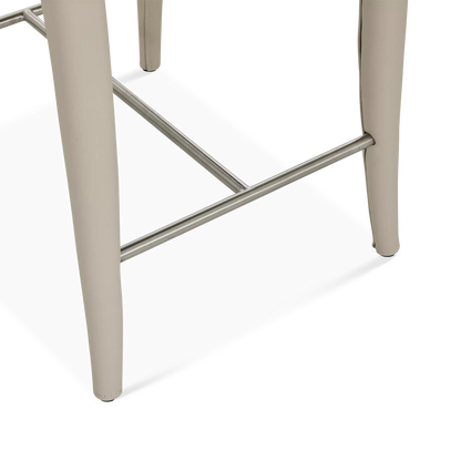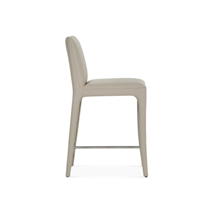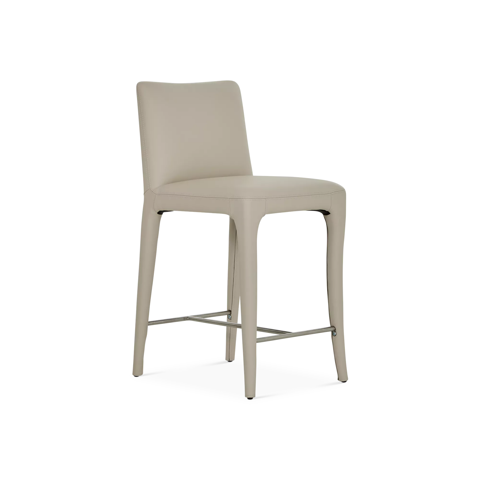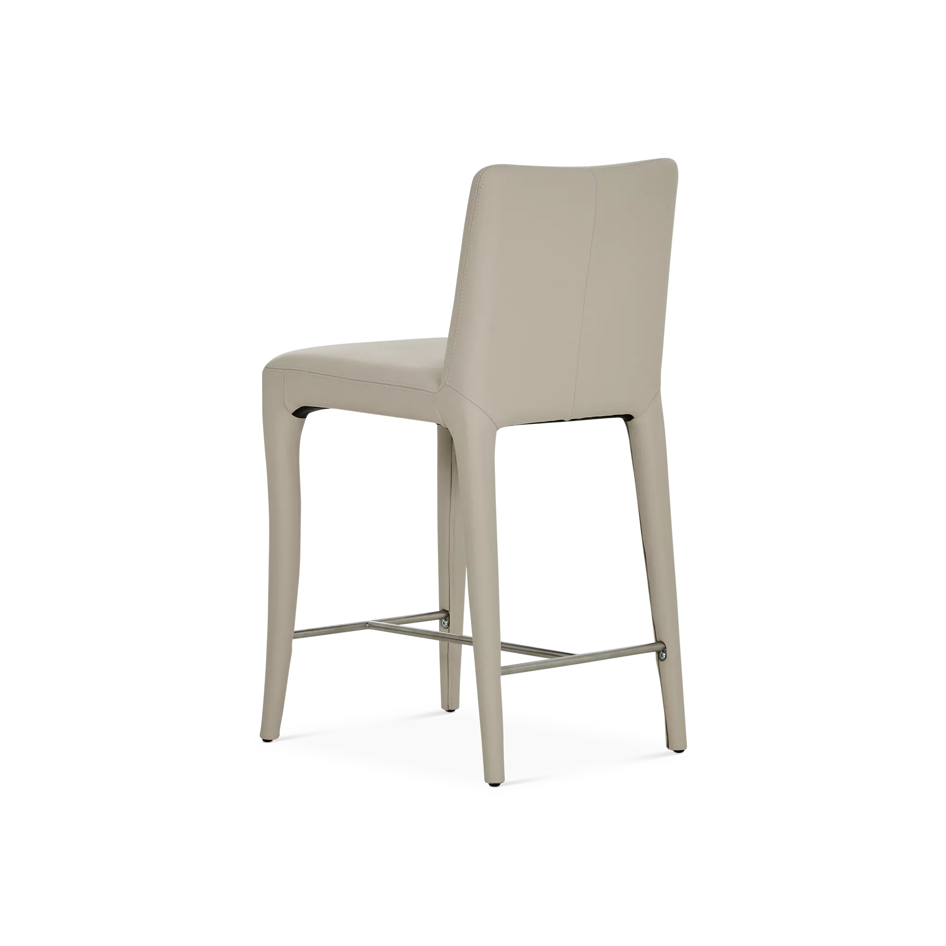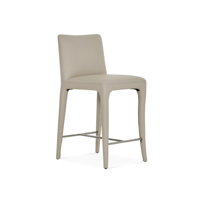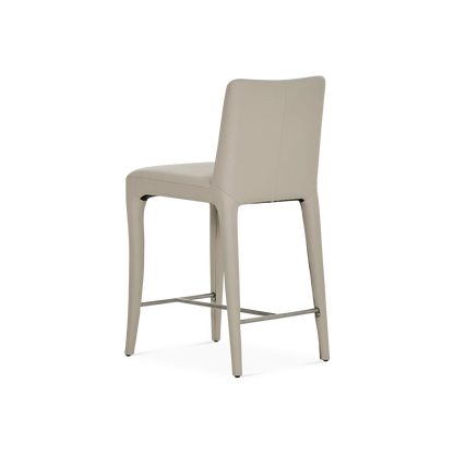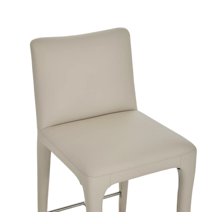 The Acari counter stool combines refined comfort with understated style. Its tailored silhouette and curved back are fully upholstered in leather, enhanced by precise stitching that highlights the artisanal craftsmanship. Set on subtly angled legs with an integrated footrest, it offers exceptional support and elegance around any kitchen island or counter.