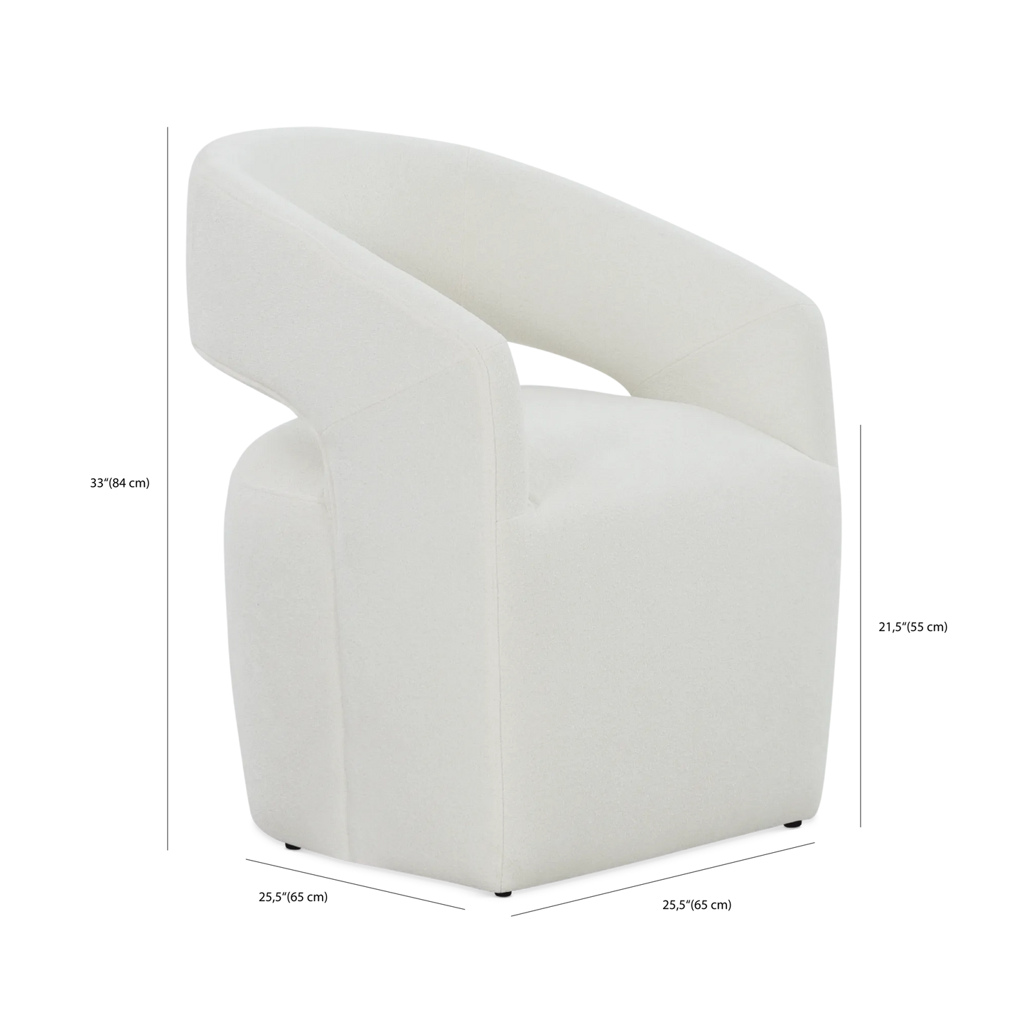 The Aimée chair features tonal seams from top to bottom that showcase its wraparound, padded backrest. Equipped with hidden wheels and a curved seat, it offers the comfort of an armchair in a compact form suitable for any dining space.