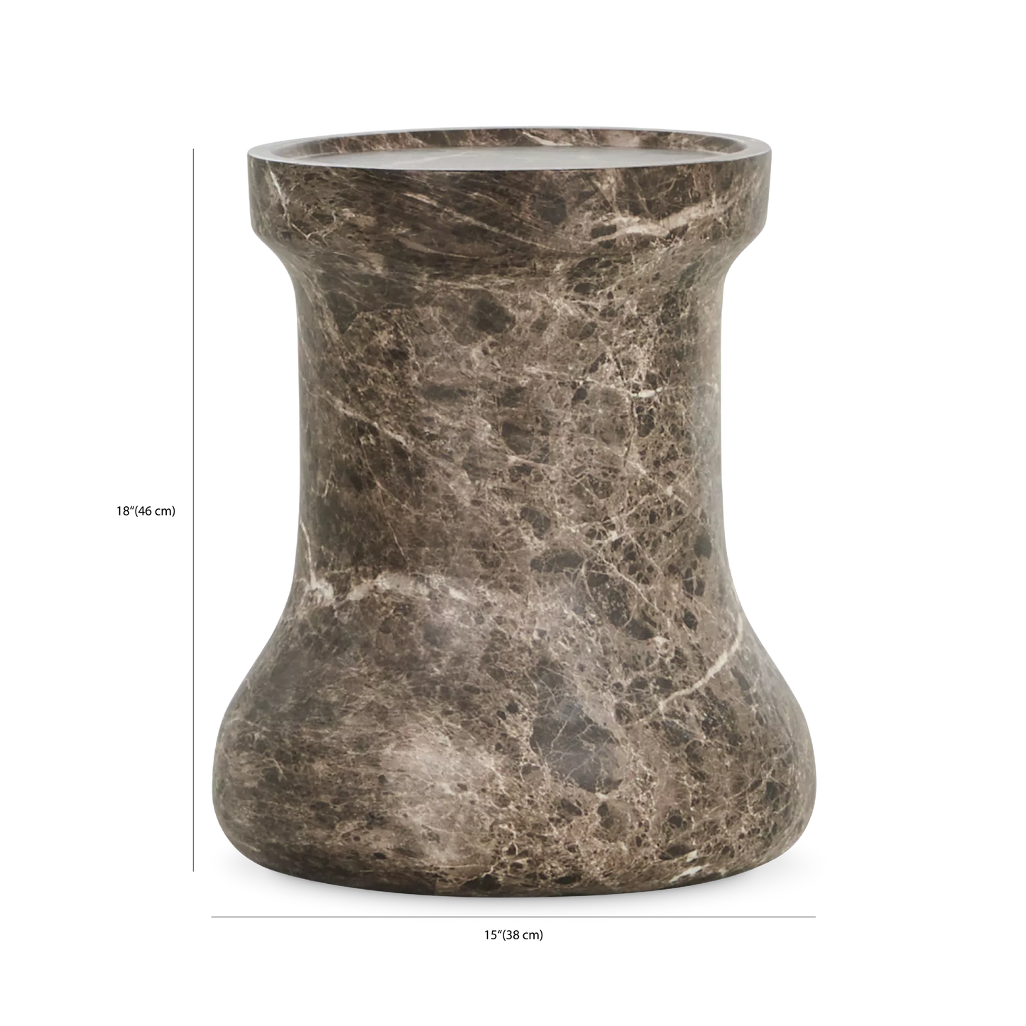 The Amorgo side table combines sculptural form with timeless elegance. Crafted from durable faux marble, its rounded base and flared silhouette evoke an architectural strength that’s softened by its organic curves. Equally functional and decorative, it serves well as a statement accent beside a sofa or chair.