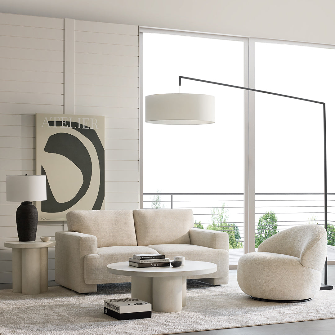 Take the edge off your industrial-chic space. The Angèle sofa will paradoxically soften the look of your decor with its pronounced geometric lines. Upholstered in light-toned fabric, it will brighten the room, while its plump padding offers ultimate support. Ideal for modernizing any interior, it pairs perfectly with concrete elements and dark shades to create a striking contrast.