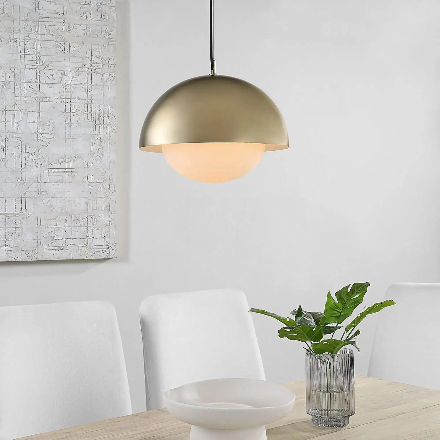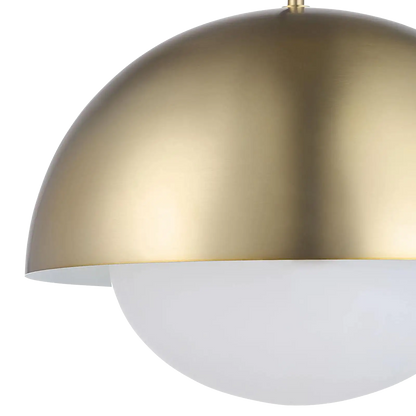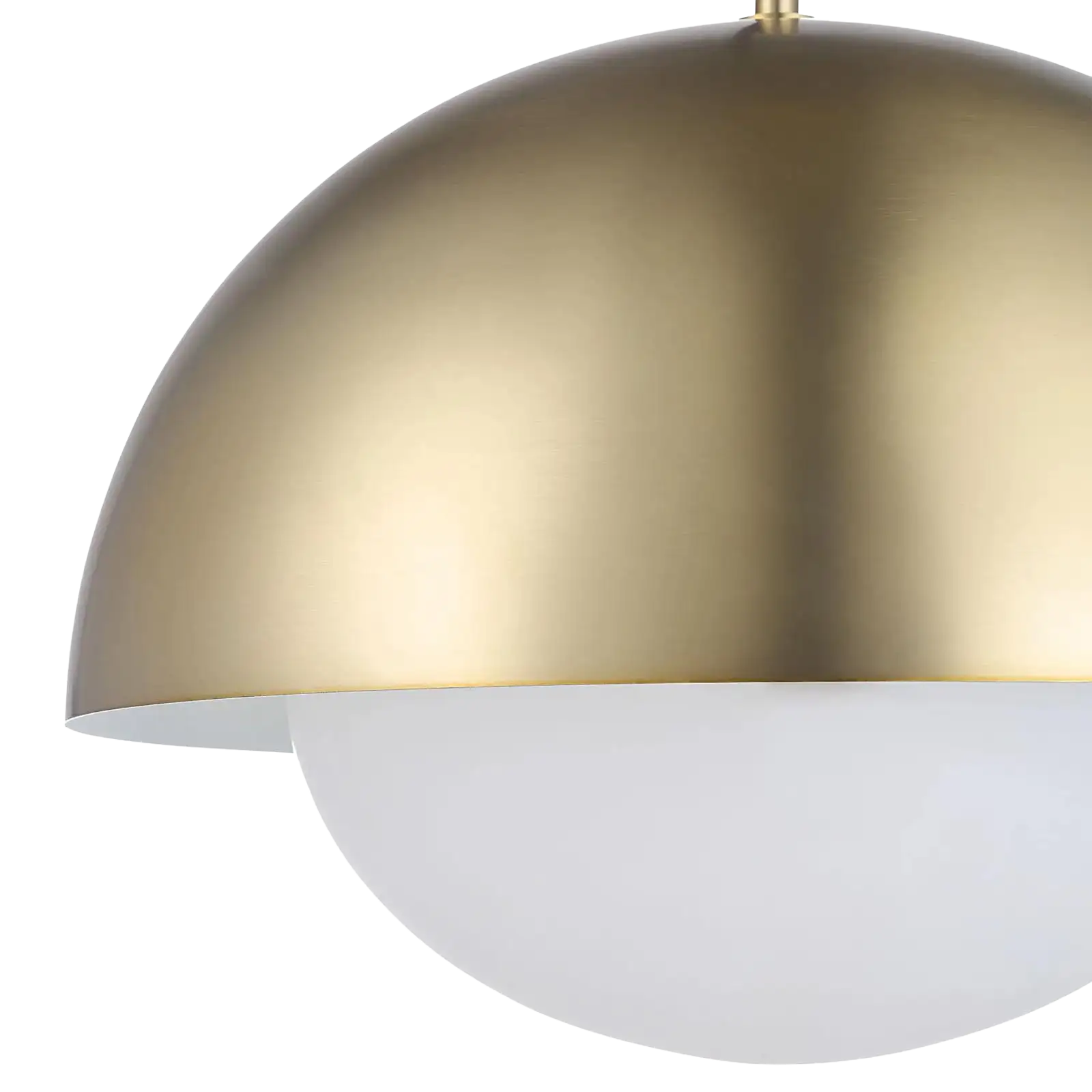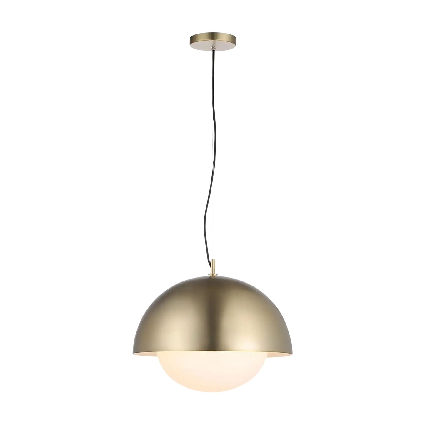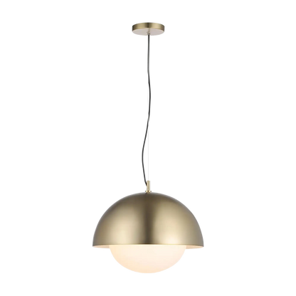 More details: Dia-15.75" x 12.75"H / Maximum cord length of 108" Iron ceiling light Champagne-plated finish Etched white glass Hardwired Max. 40W E26 socket Dimmable LED bulb included UL certified